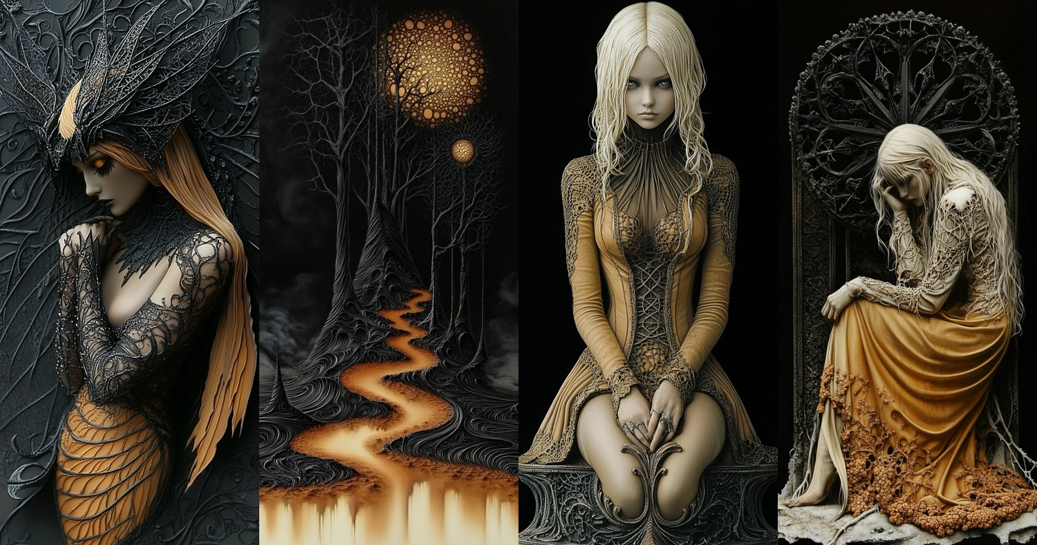 Detailed forms with dark tones contrasted by warm, glowing highlights and deep textures.