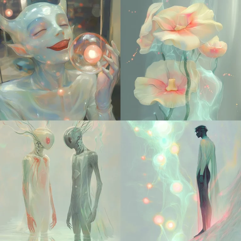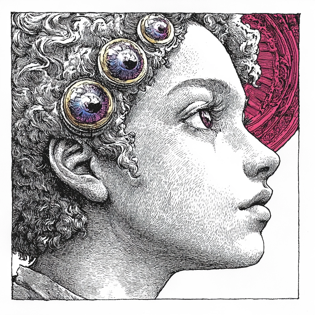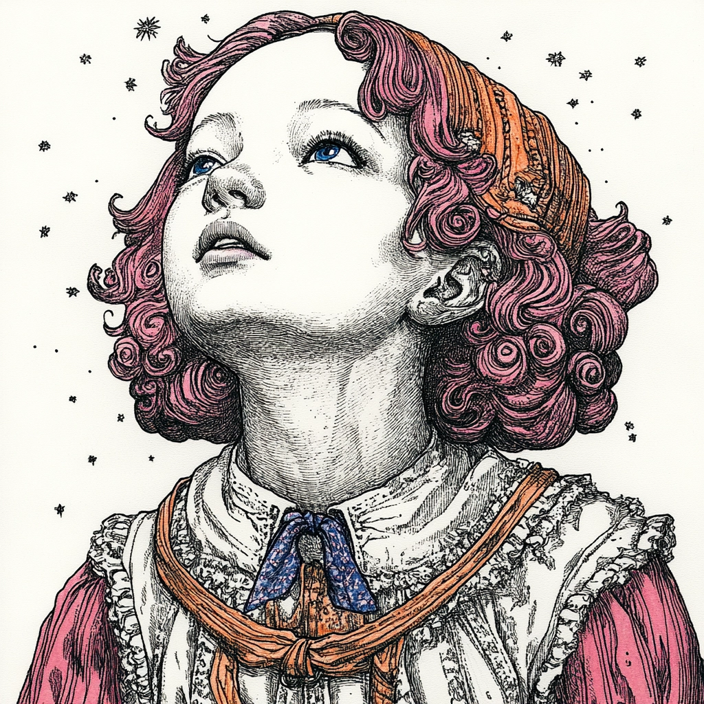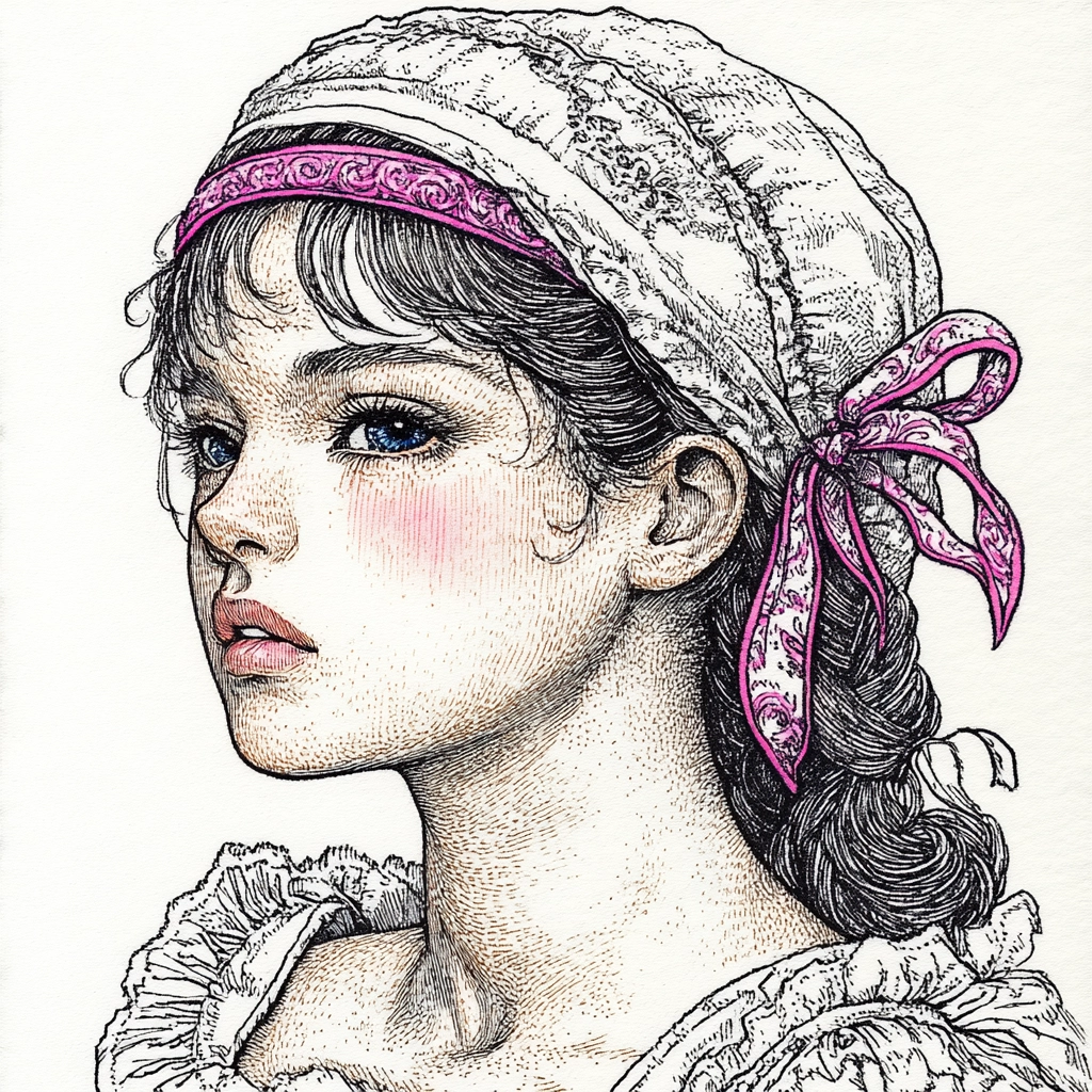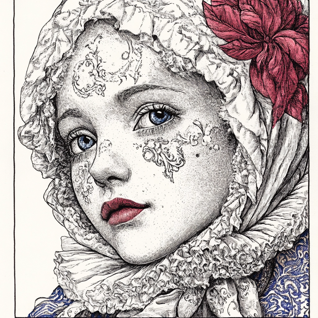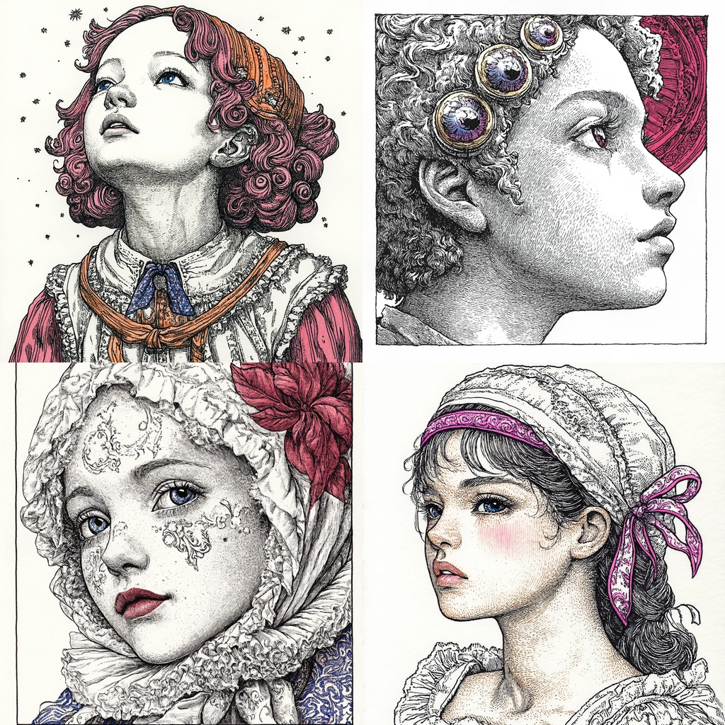 The use of fine line work creates detailed textures, enhanced by the application of subdued pastel colors. The lighting emphasizes depth and dimension while the composition balances traditional and modern influences.