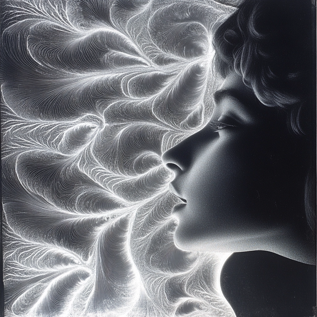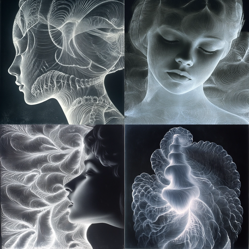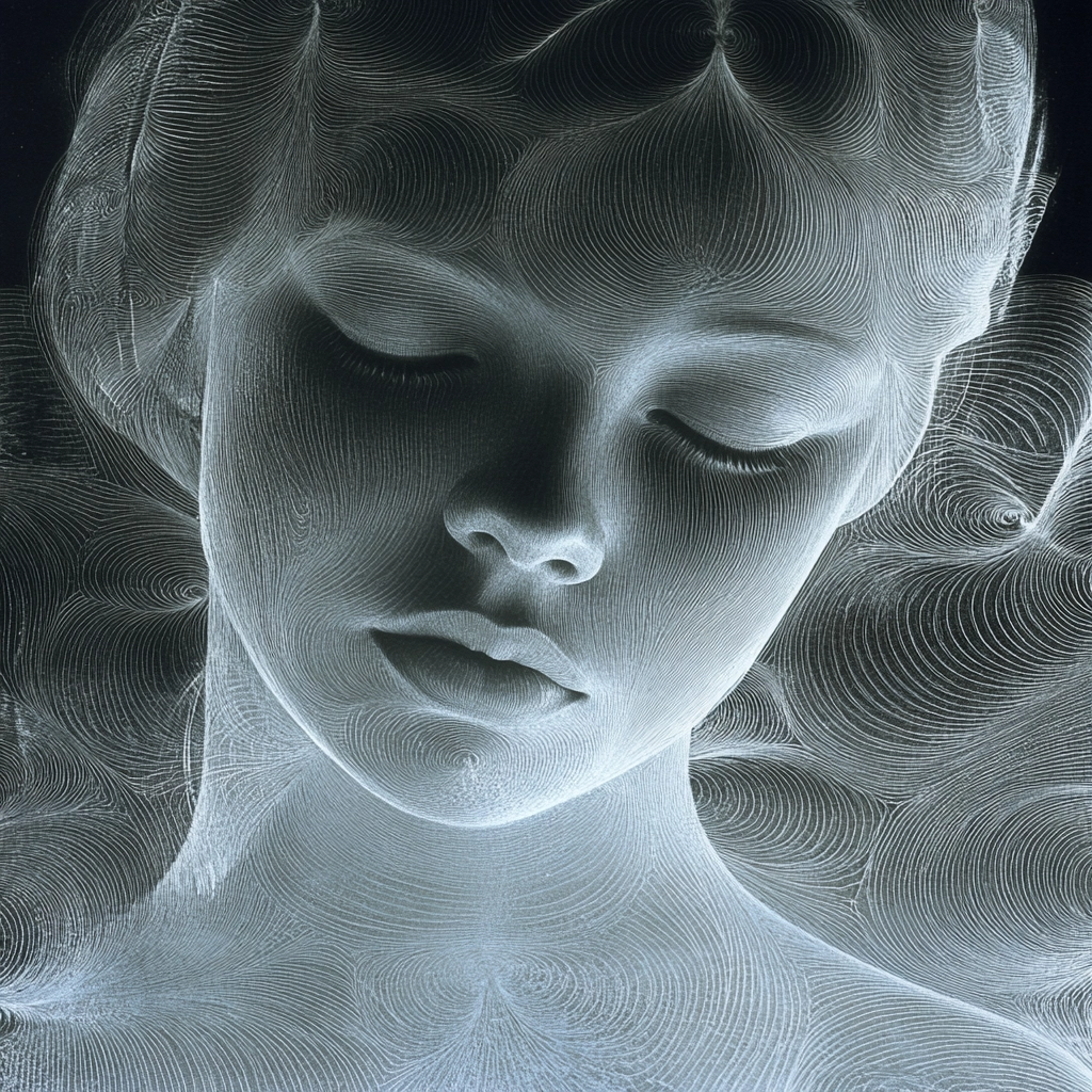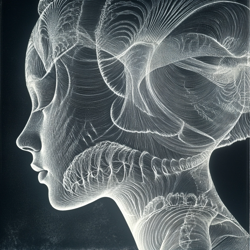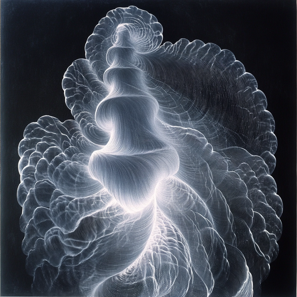 Delicate lines create complex forms against a dark background with soft gradients.