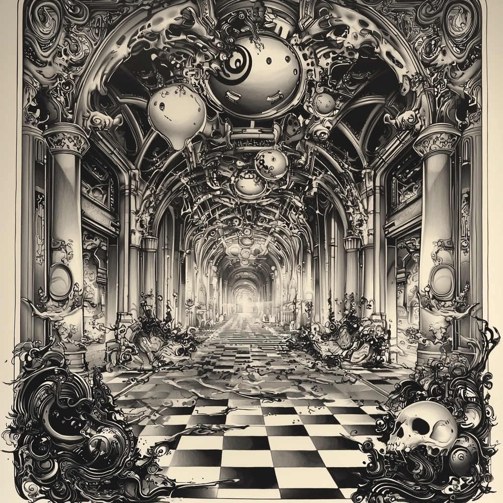 The artwork displays precise and elaborate linework with a strong emphasis on light and shadow. The monochromatic palette allows for a focus on texture and depth, creating a highly detailed and immersive scene. Spatial composition is complex, with layers of intricate elements adding to the sense of dimension.