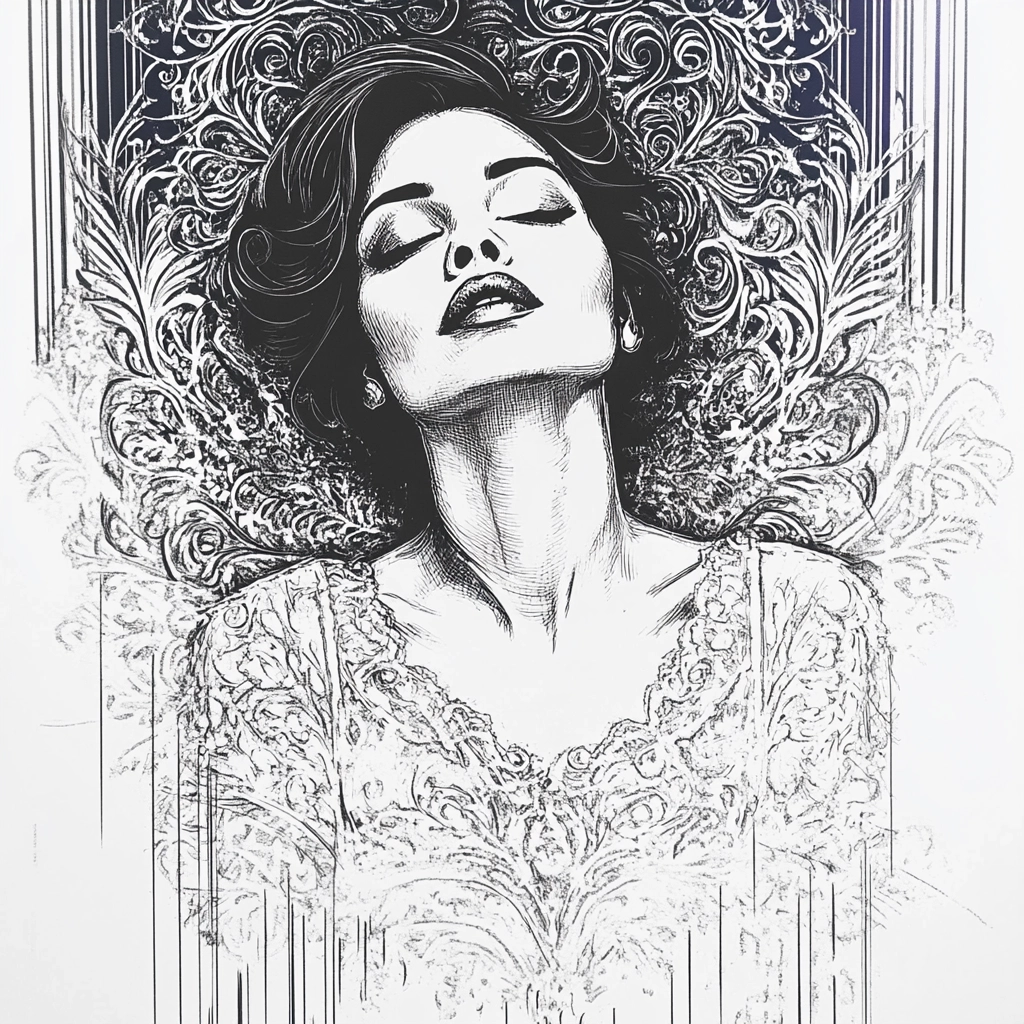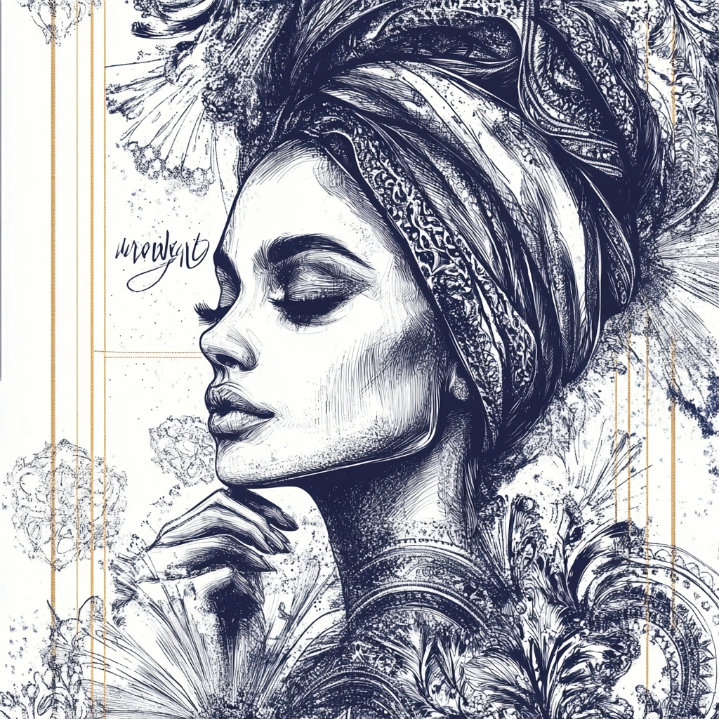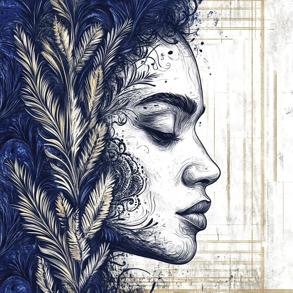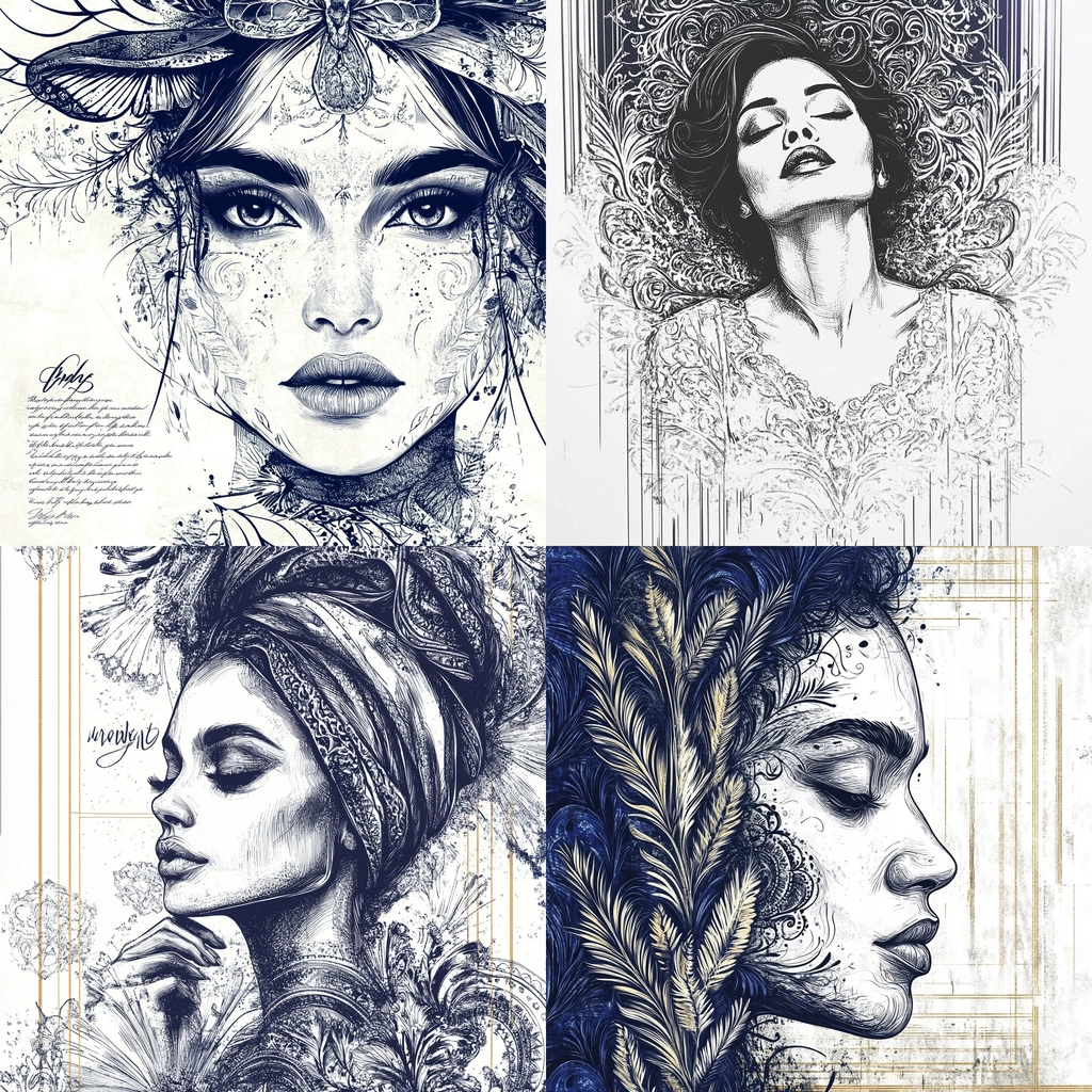 Detailed blue and white line work with a strong contrast.