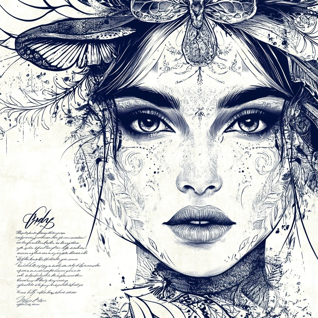 The composition uses intricate line work to create detailed patterns and forms. The color palette of blue and white establishes a stark contrast, enhancing the clarity of fine details. The spaces are filled with elaborate textures, evoking a sense of complexity and precision.
