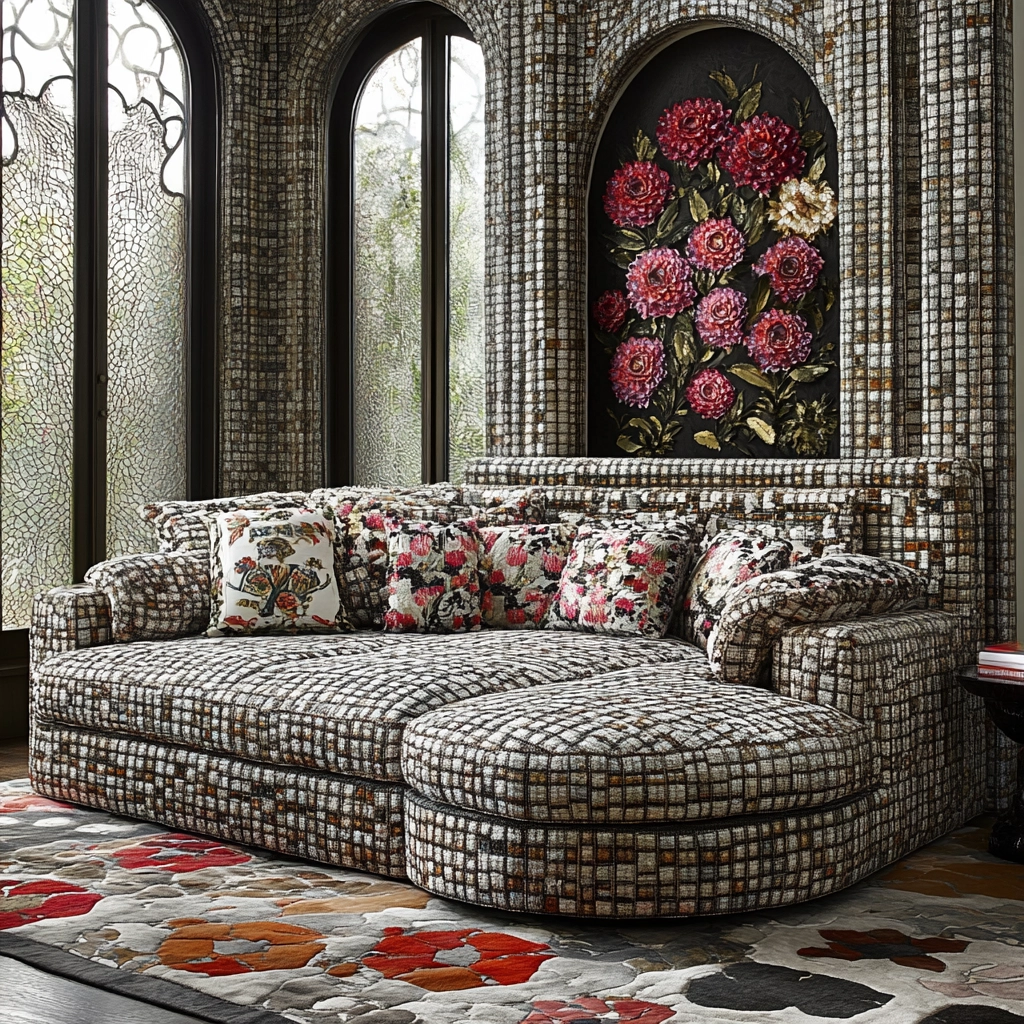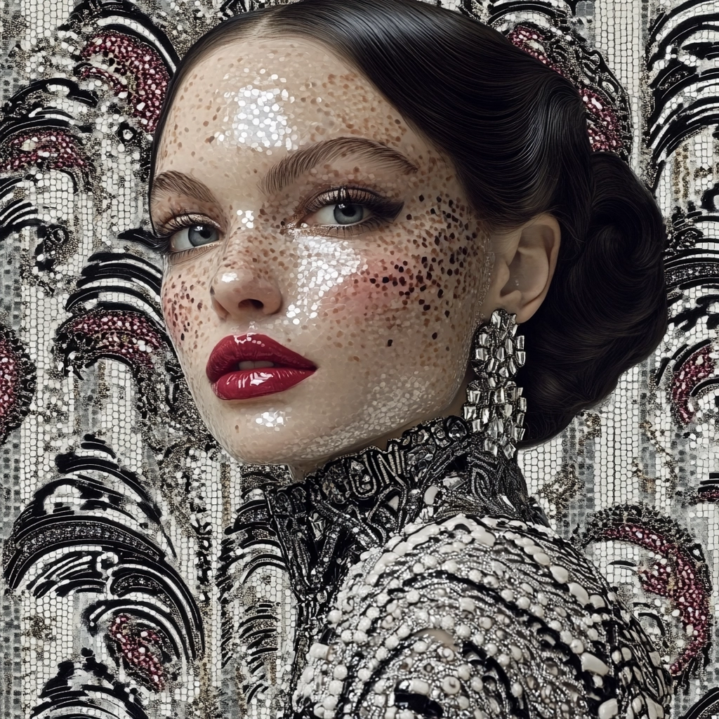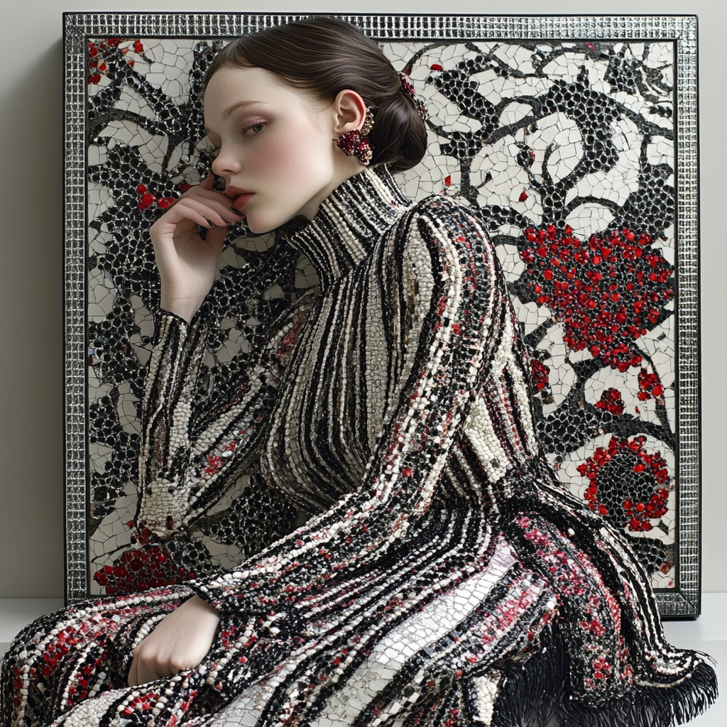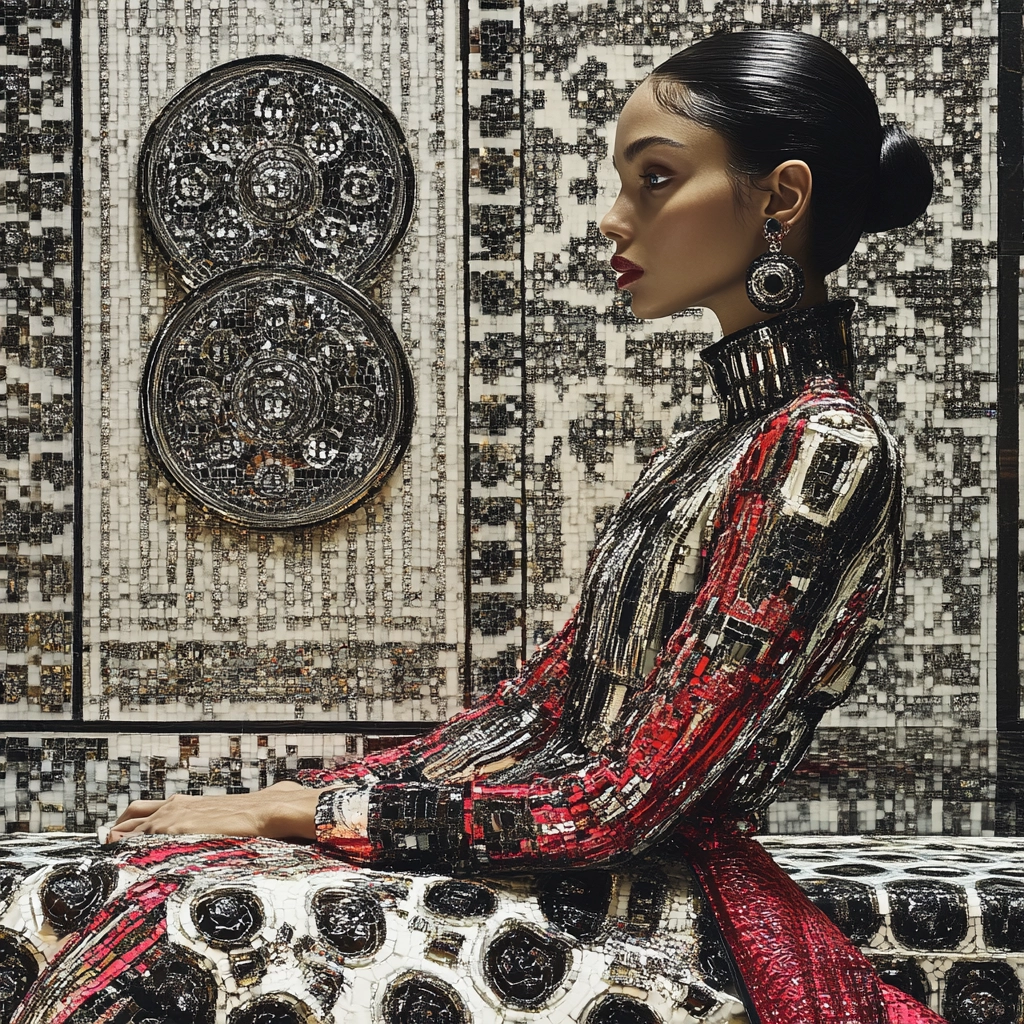 The artwork utilizes complex mosaic patterns with crisp details and a balance of vibrant reds and deep blacks against a white base, creating an opulent and tactile texture contrast.