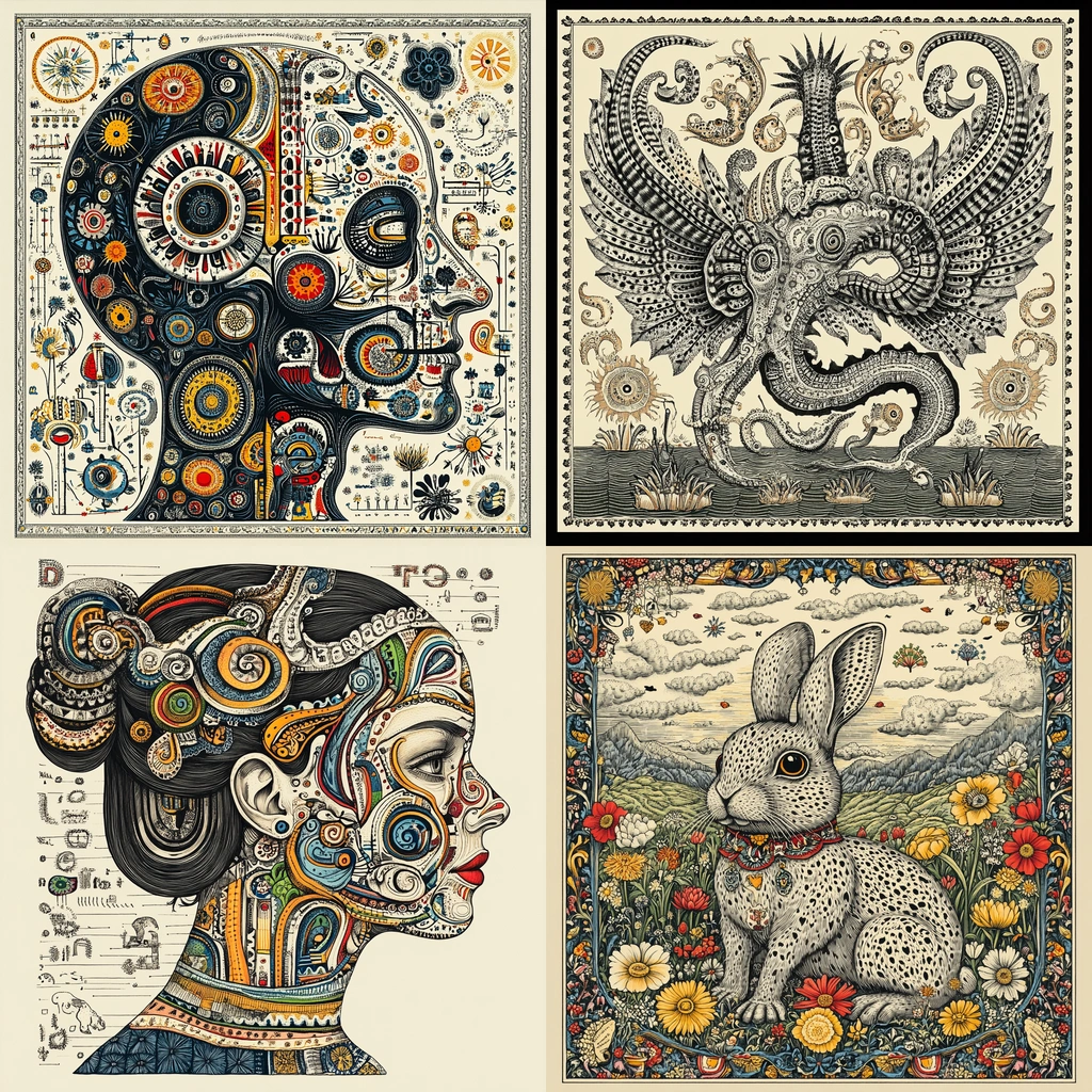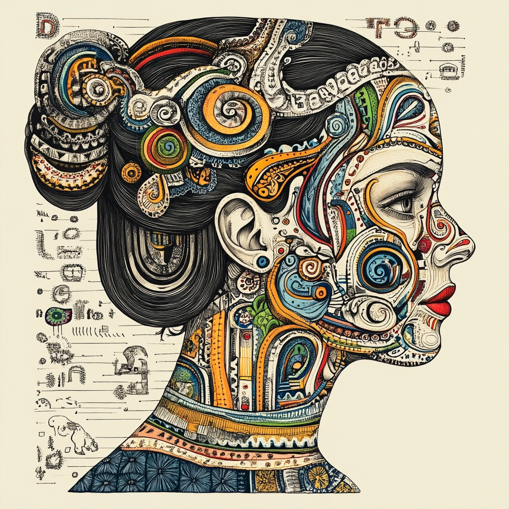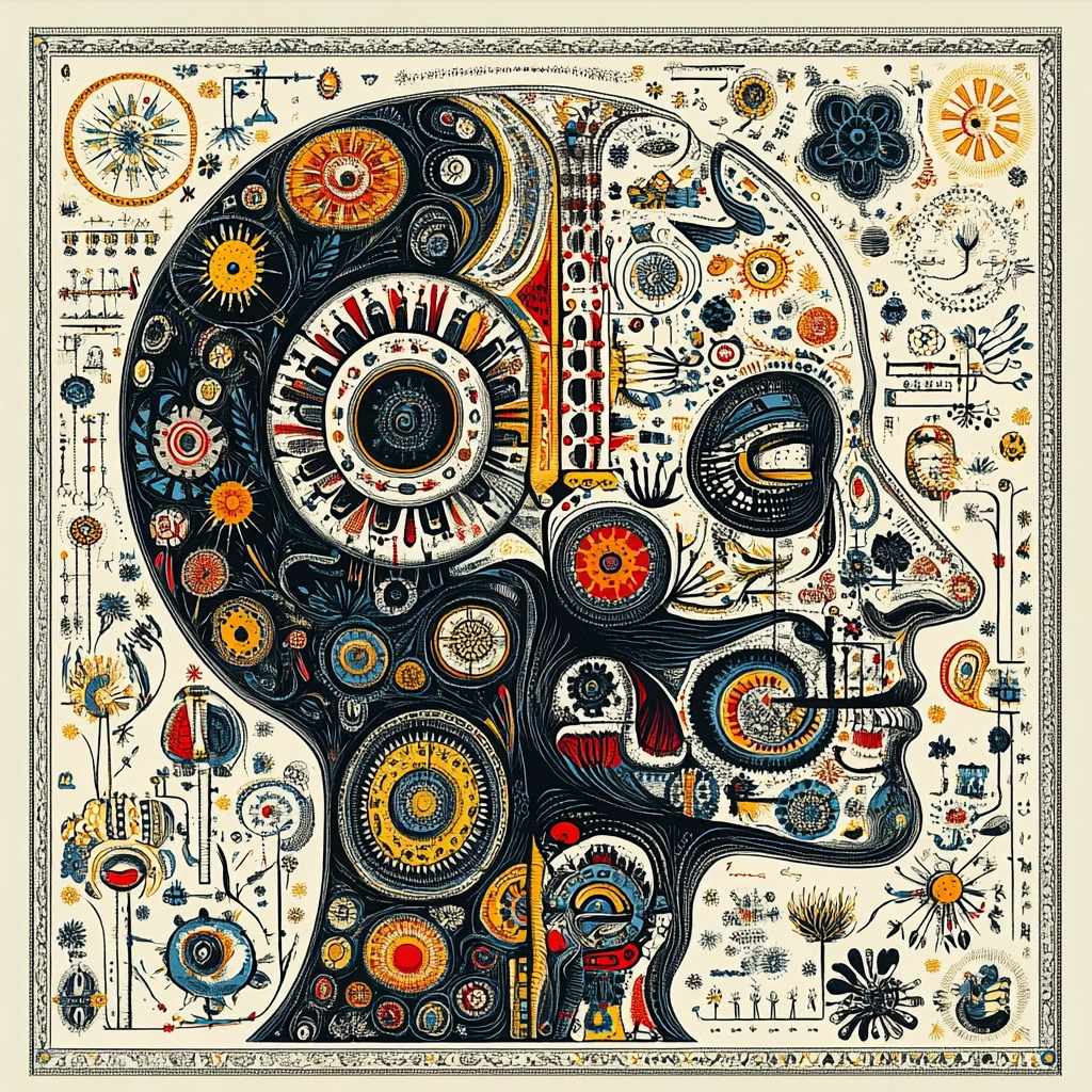 Elaborate patterns fill the space with a robust sense of balance. Predominantly muted colors are accentuated by vibrant touches, enhancing the intricate textures and varying degrees of lightness and shadow, while maintaining a concentrated focus within the frame.