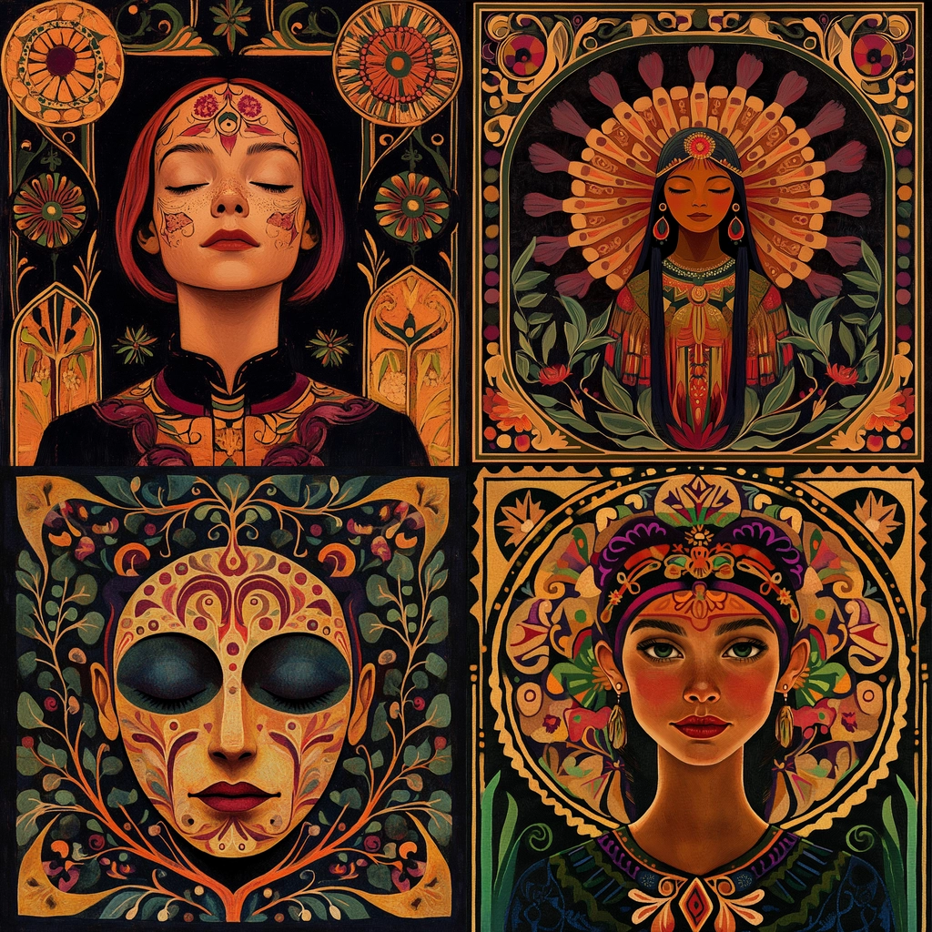Finely detailed compositions with vibrant color schemes and intricate patterns.