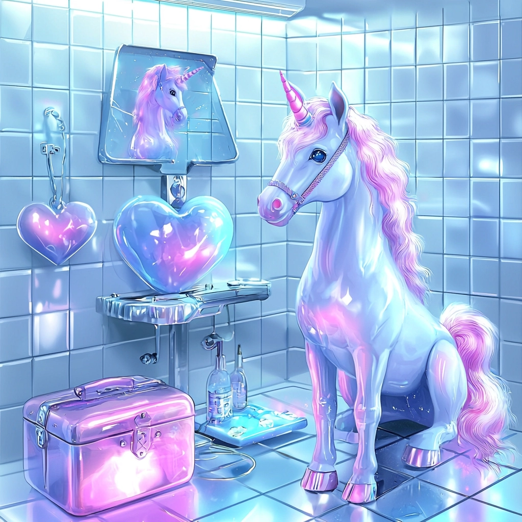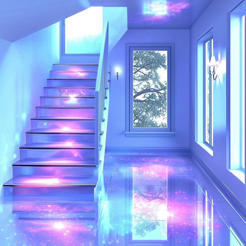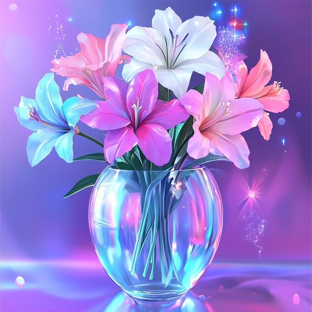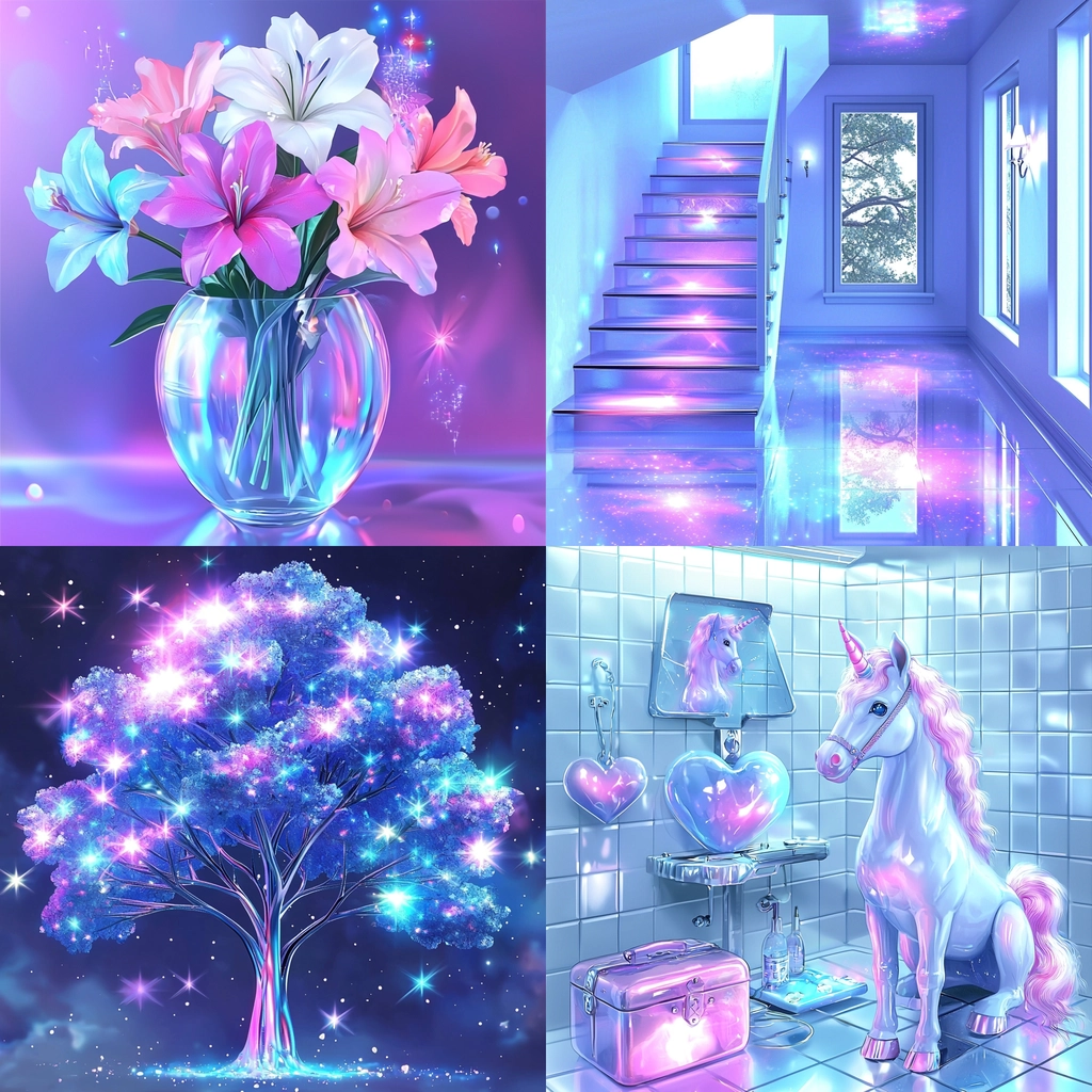 Lighting effects create a glowing, radiant aura across surfaces. Color characteristics showcase bright, iridescent tones that transition smoothly. Spatial sense is wide and open, adding dimension. Texture expression is glossy and fluid, enhancing the vibrant impression.