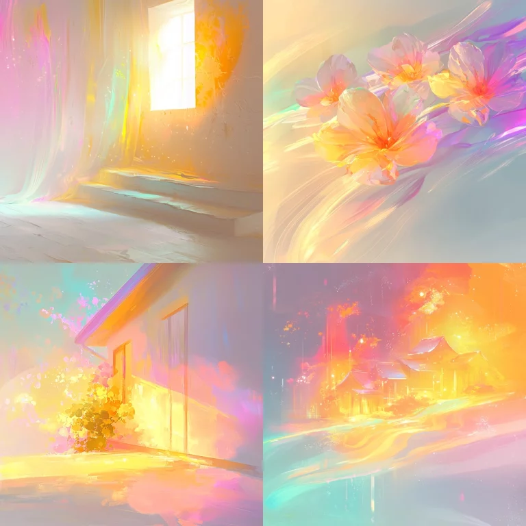 This composition is characterized by a luminous interplay of soft, pastel hues with a shimmering iridescent quality that enhances spatial depth.