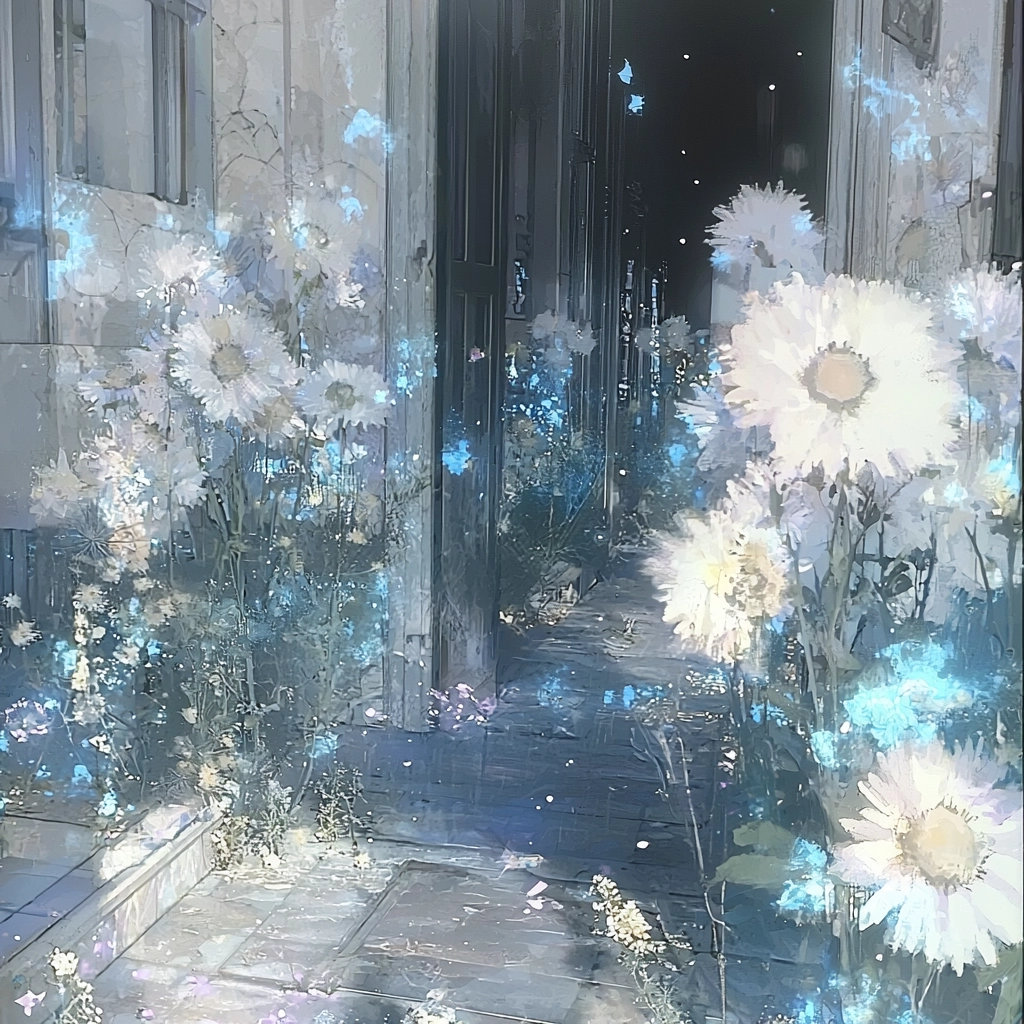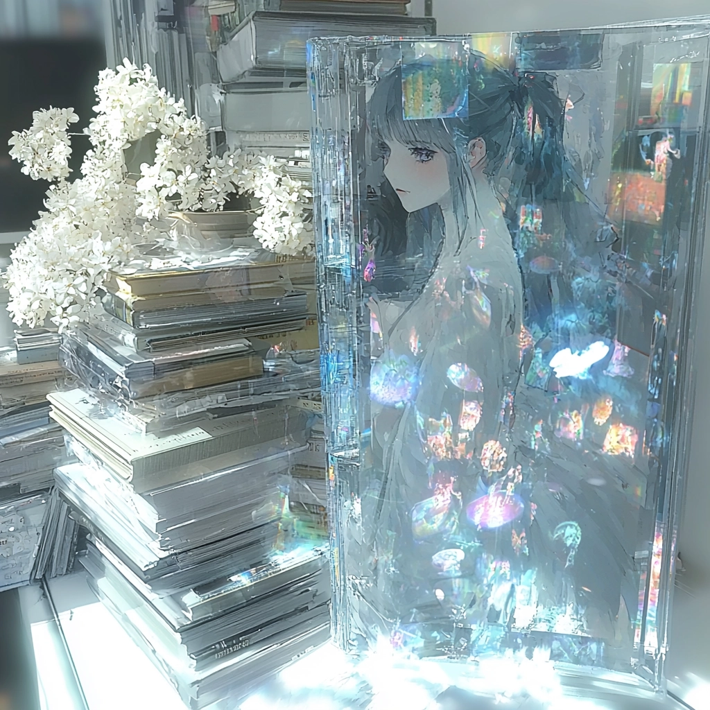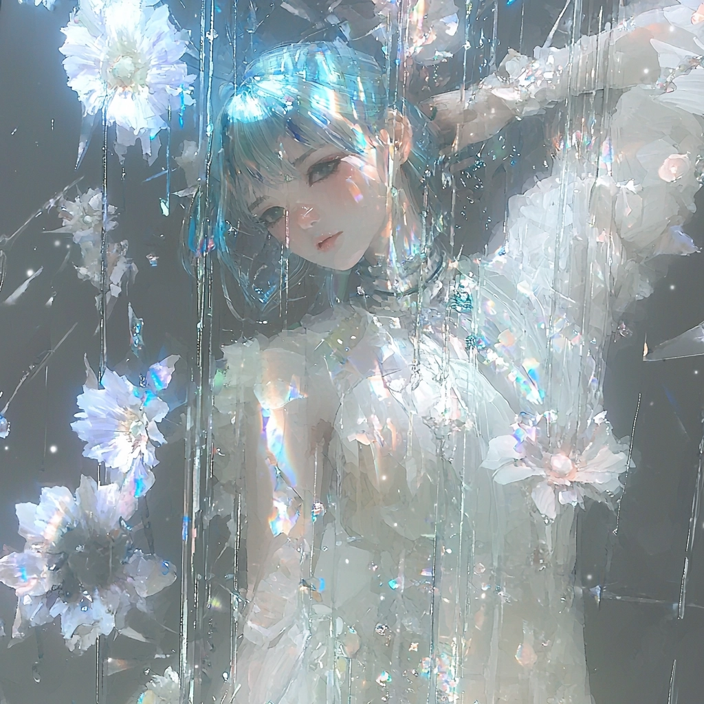 Bright, diffused lighting accentuates translucent textures and creates a glowing aura around delicate blues and cyans. The sense of space is expanded through layered perspectives and reflective surfaces, giving the viewer a feeling of lightness and open space.