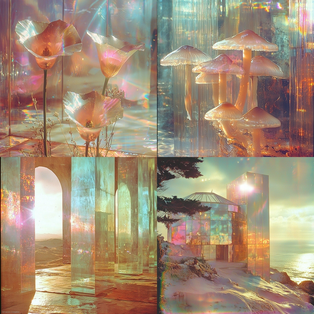 Gold, blue, and pink interplay with shimmering reflections across panoramic scenes.