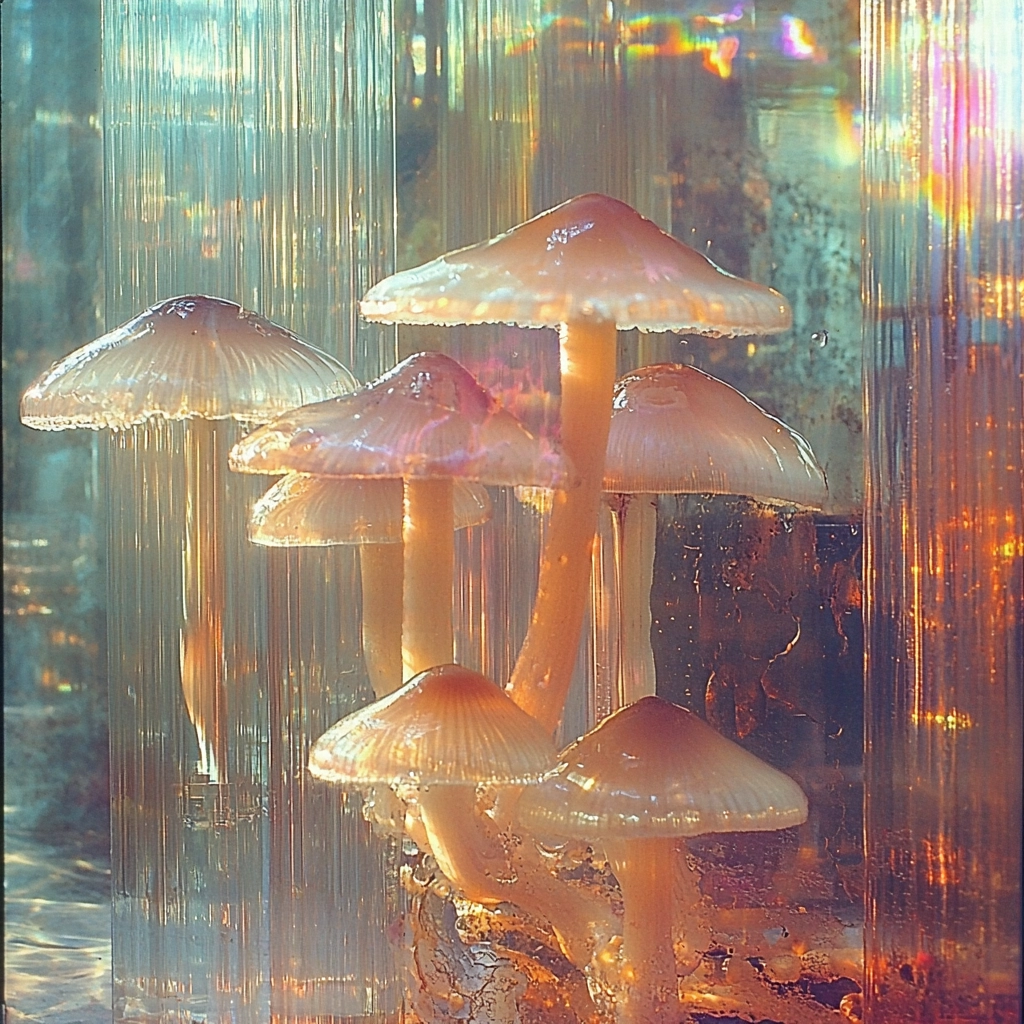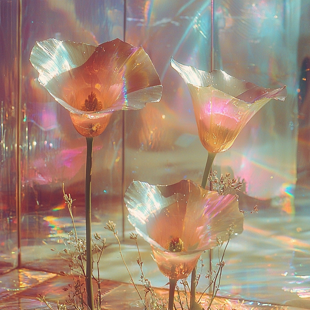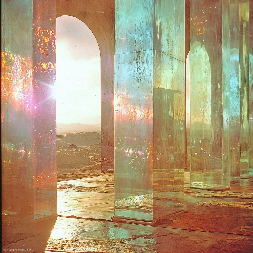 The lighting captures an iridescent glow creating an impression of fluid reflections. Gold, blue, and pink hues blend vibrantly, enhancing the sense of depth through layered textures. Spatial composition enriches panoramas with dynamic light effects.