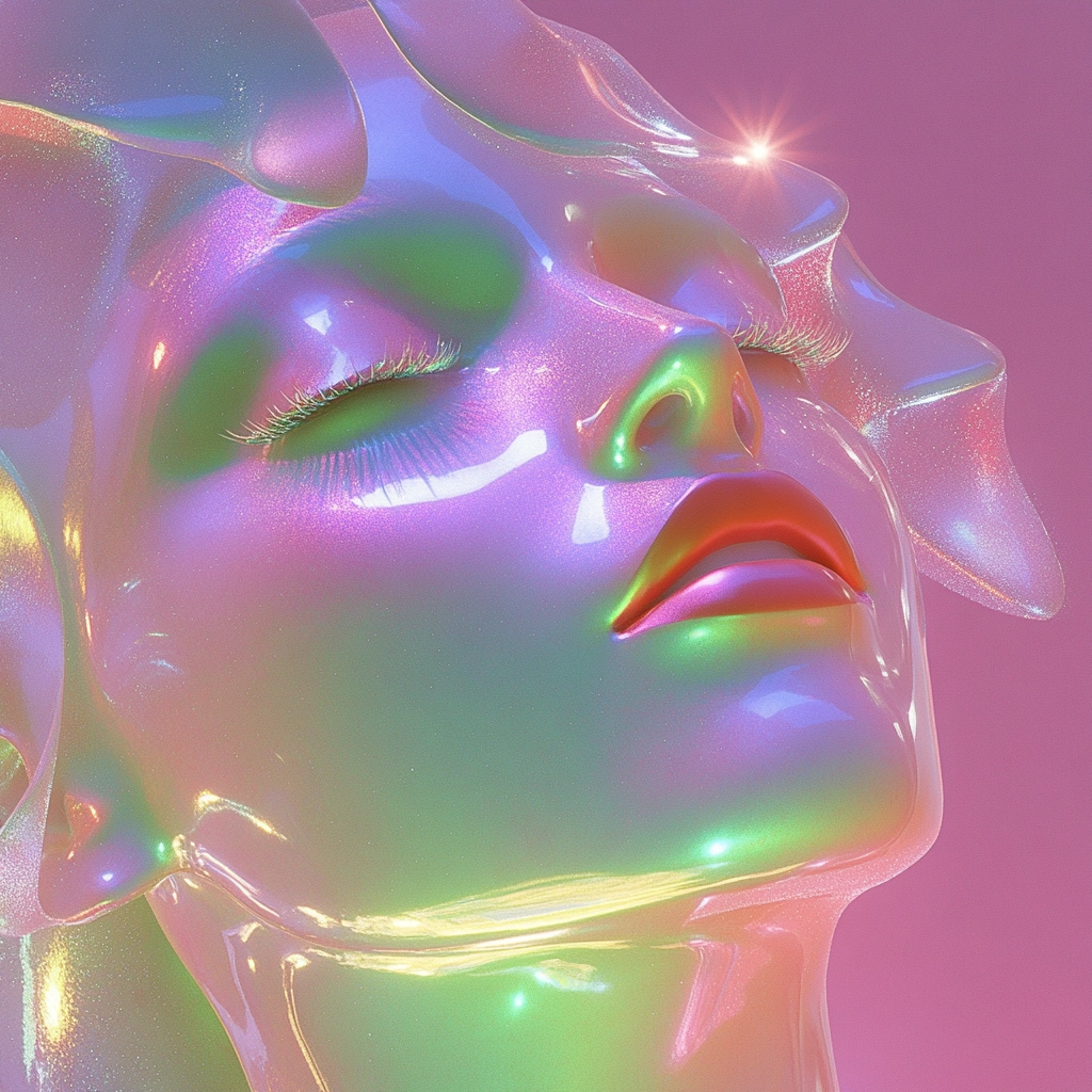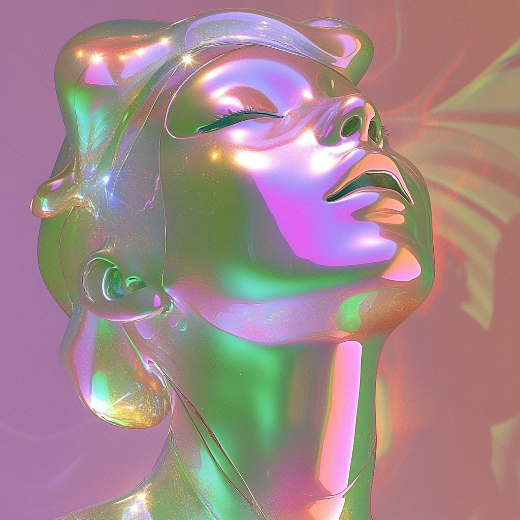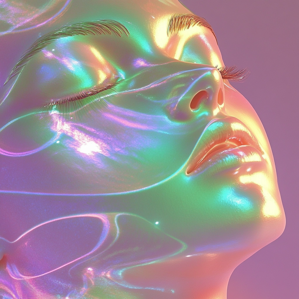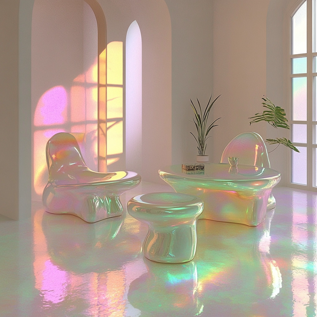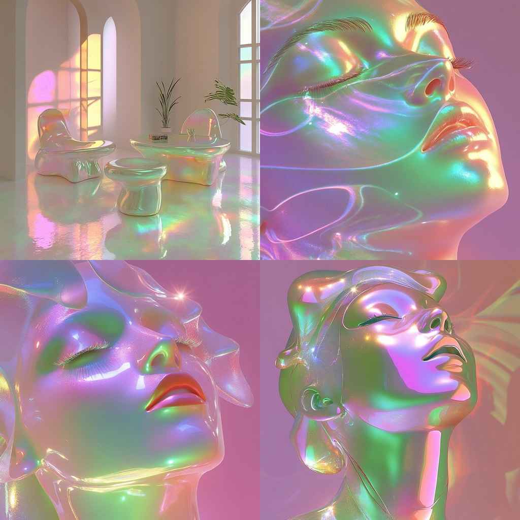 The composition emphasizes iridescent pastel tones with a reflective surface effect within the space.