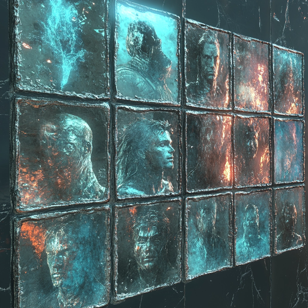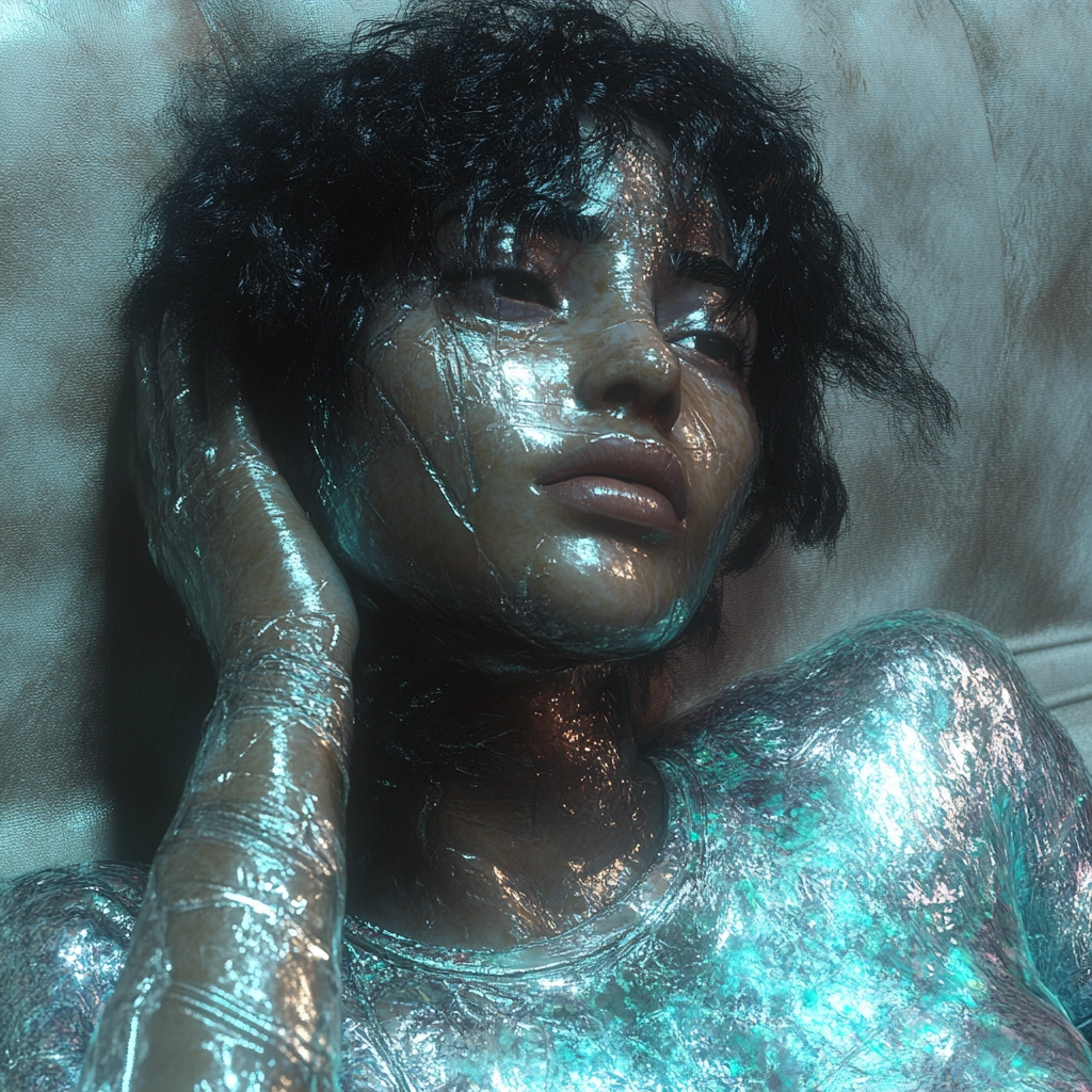 The use of lighting gives a metallic sheen, enhancing texture. Cyan and brown create depth, while wine red adds warmth. The spatial quality is compact, with intricate surface details.