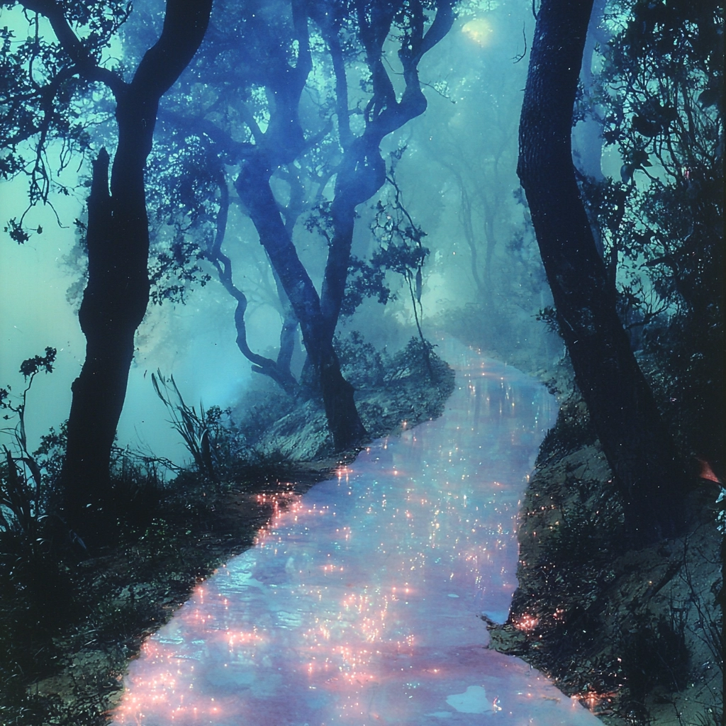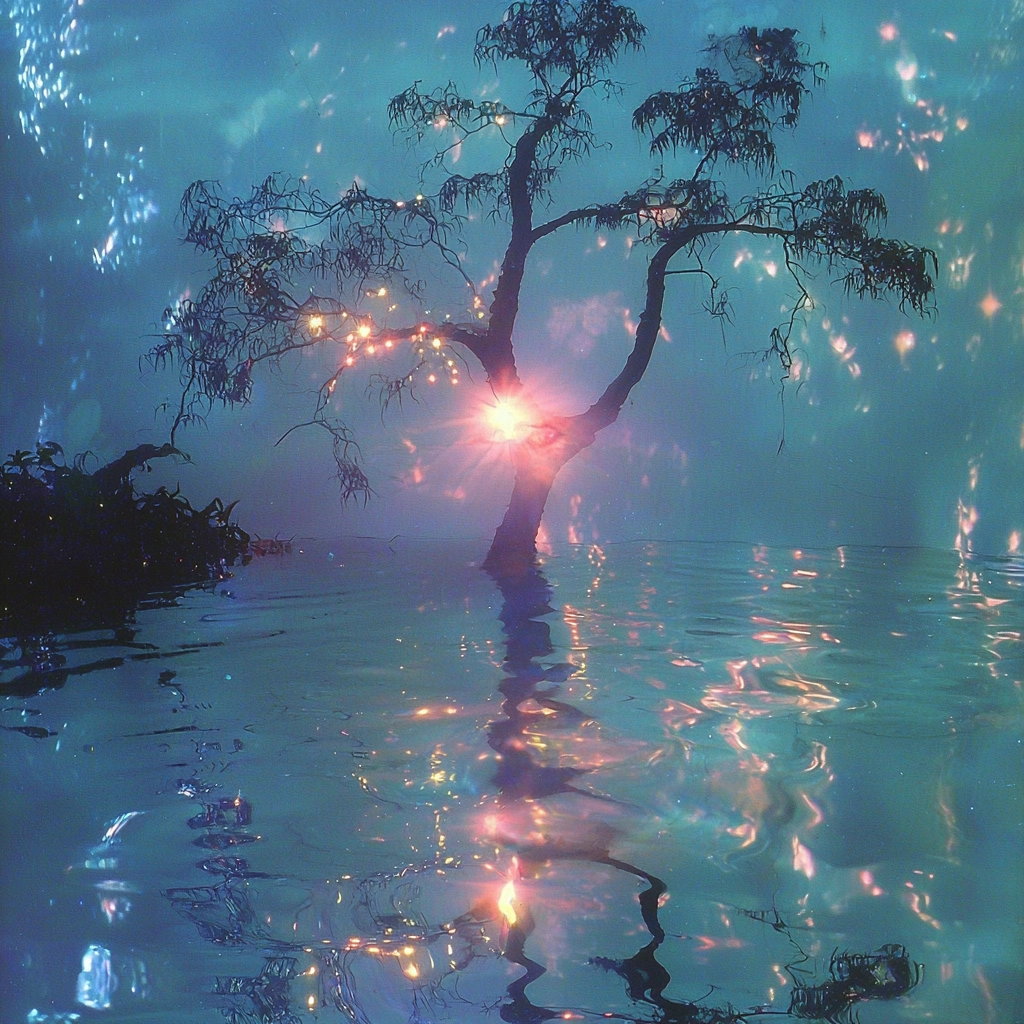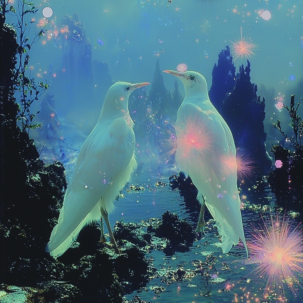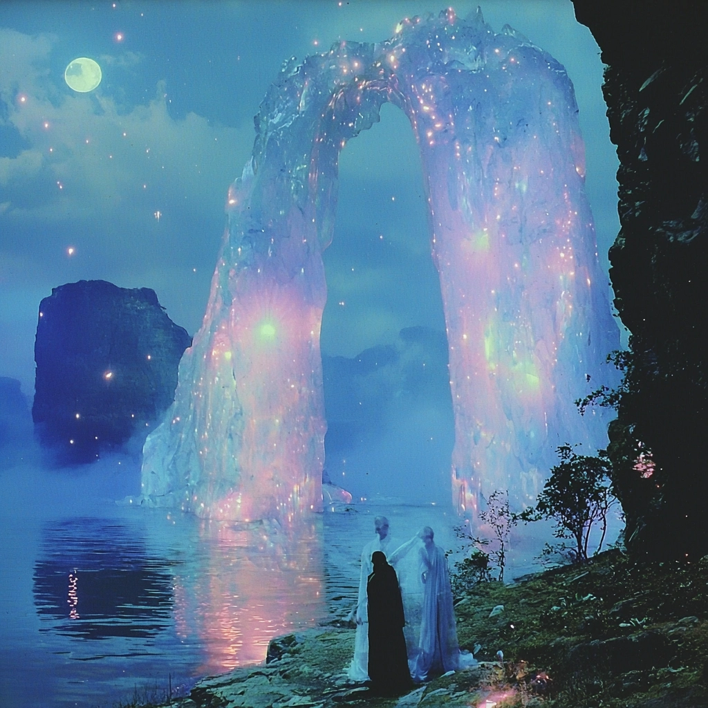 The use of gentle lighting creates a luminescent glow, enhancing the iridescent quality of various elements. The spatial depth is achieved through overlapping textures and layered hues, giving a sense of mystical layers.