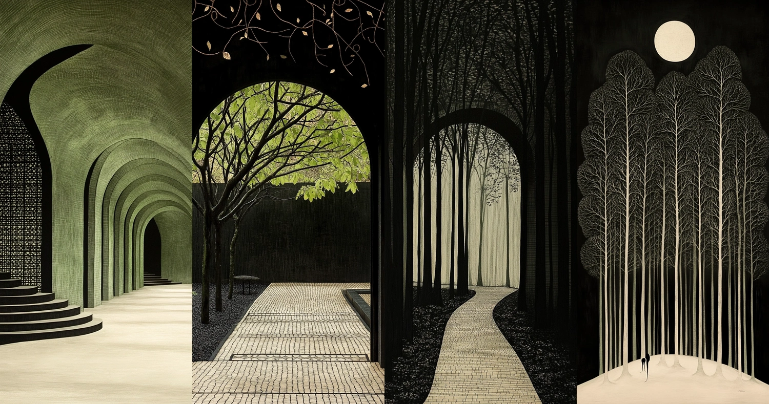Lighting emphasizes the shadows and various textures, creating a layered spatial perspective. The interplay of green amidst black and white enhances the depth and spatial illusion.