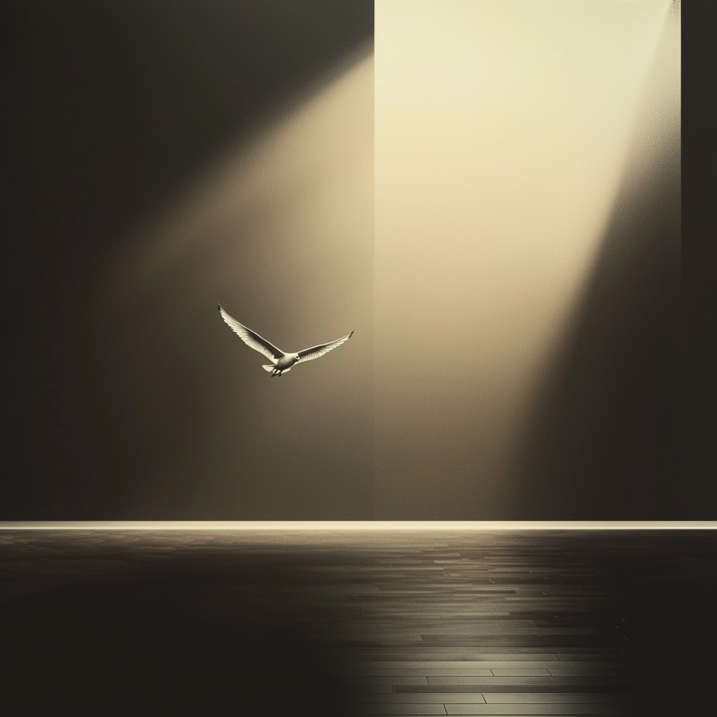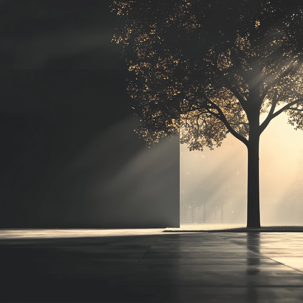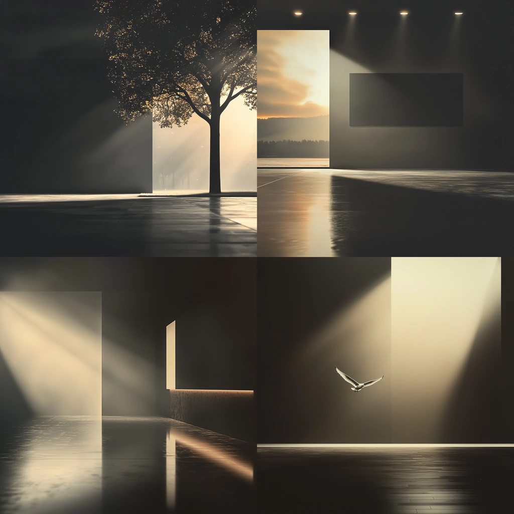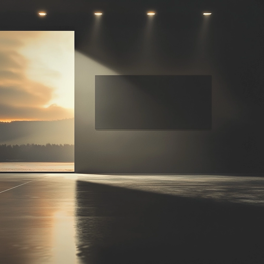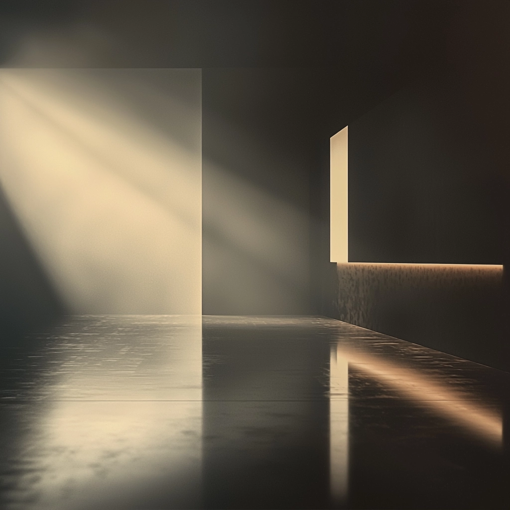 Dramatic lighting highlights contrasts between illuminated areas and deep shadows, with precise reflections on smooth surfaces, creating a clear spatial hierarchy and a sense of tranquility.