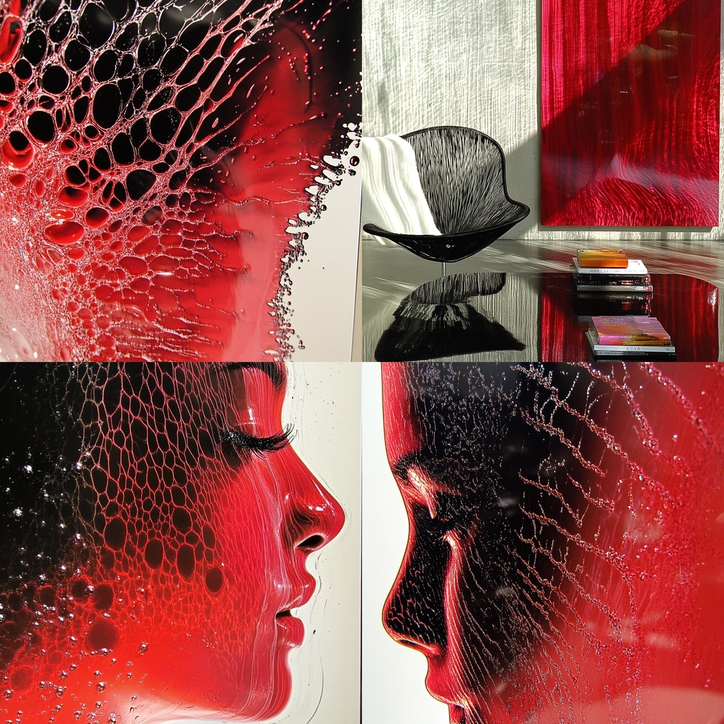 The lighting casts varied reflections gracefully upon the vivid red and deep black bases, enhancing spatial clarity. Textures that mimic liquid flow suggest a smooth surface, and harmonious transitions between light and shadow amplify definition.