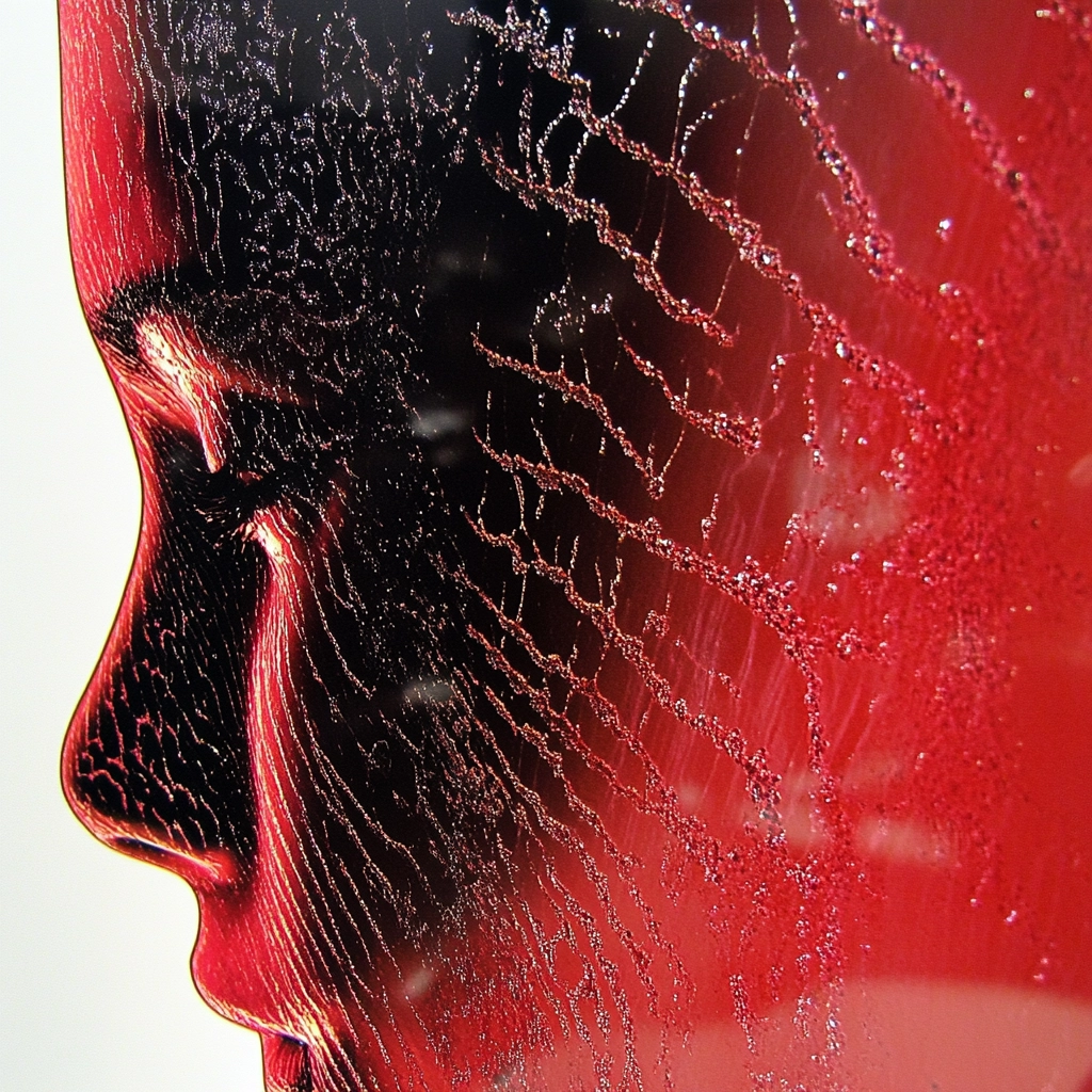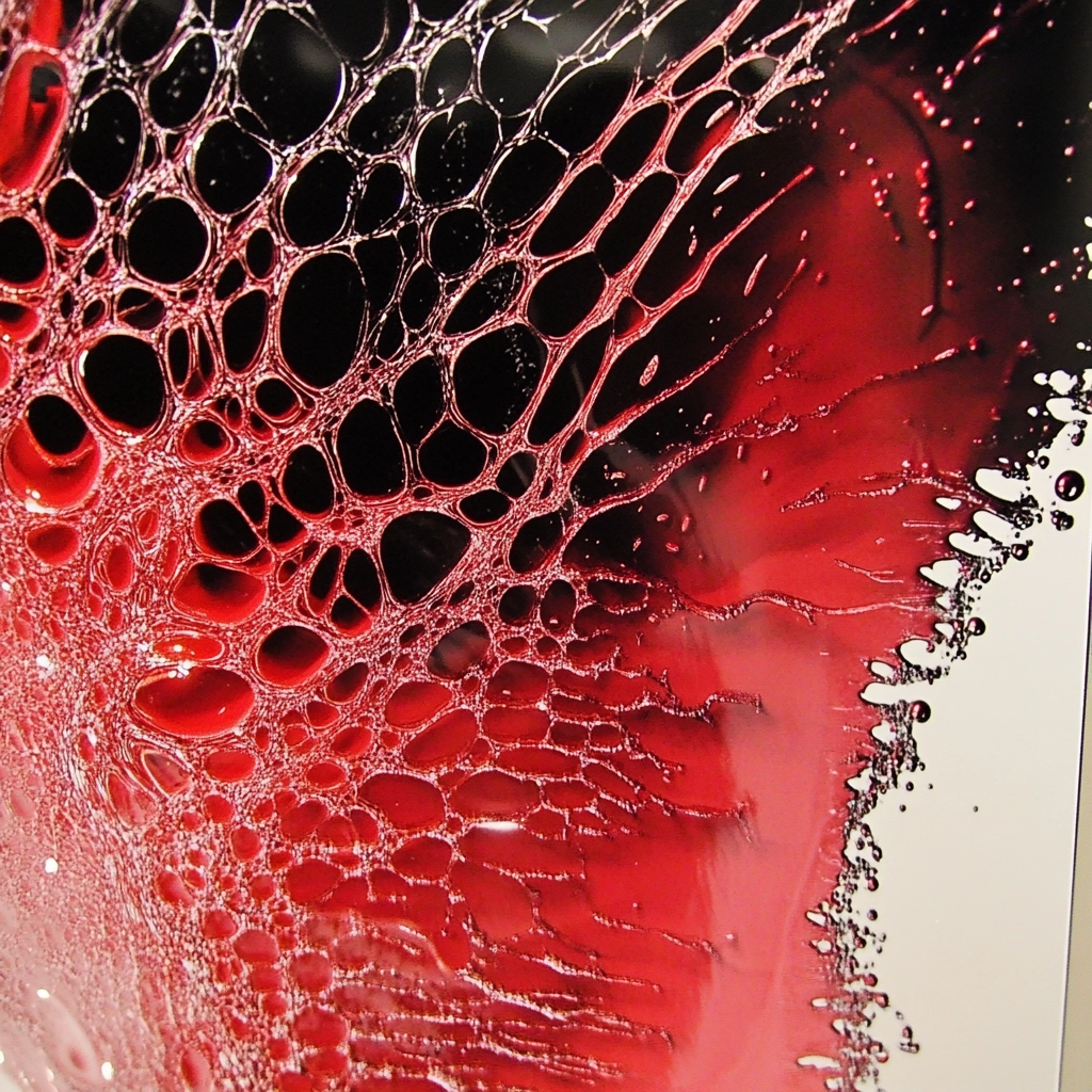 Bold red tones merge with defined black contrasts, creating dynamic fluidity and concentrated emphasis in composition.