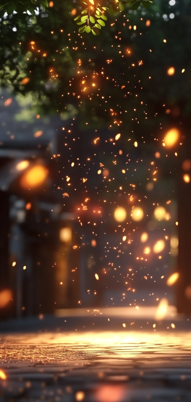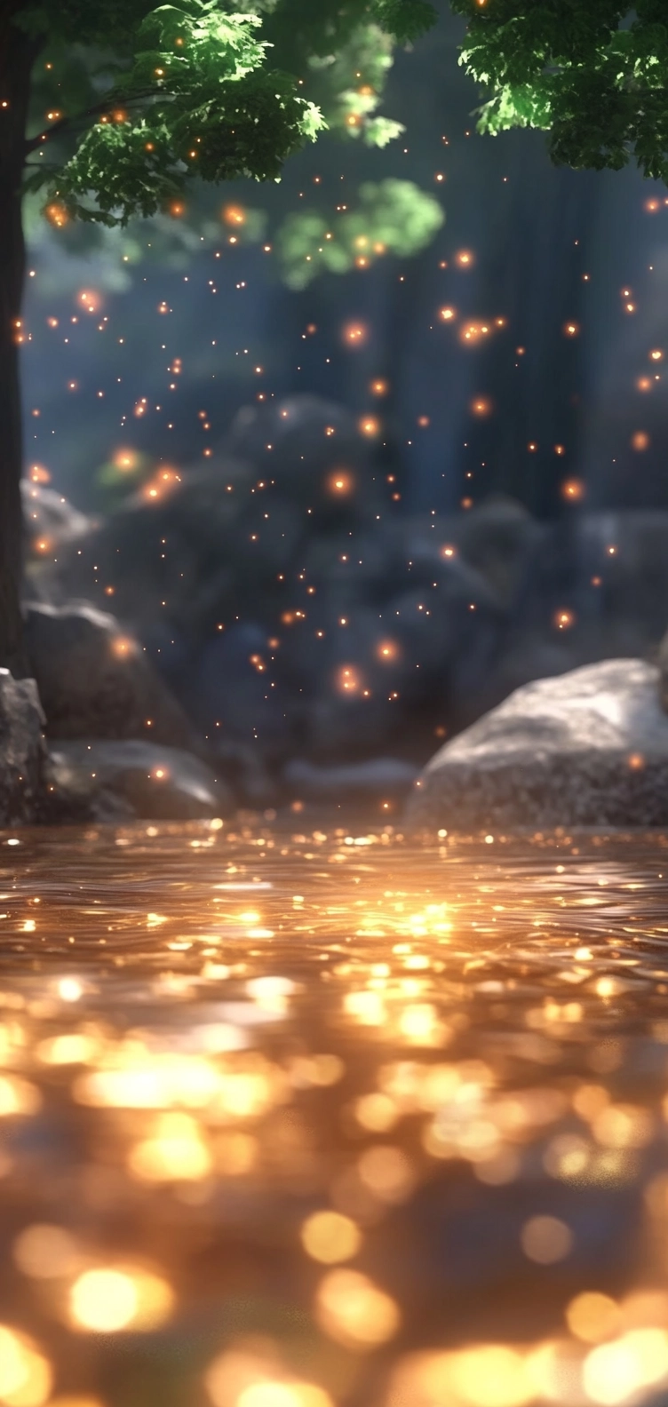 The lighting effects create a captivating dance between light and shadow, illuminating the warm orange tones that contrast with the deep green hues. The sense of depth is enhanced by the intricate textures that make the light appear almost tangible.