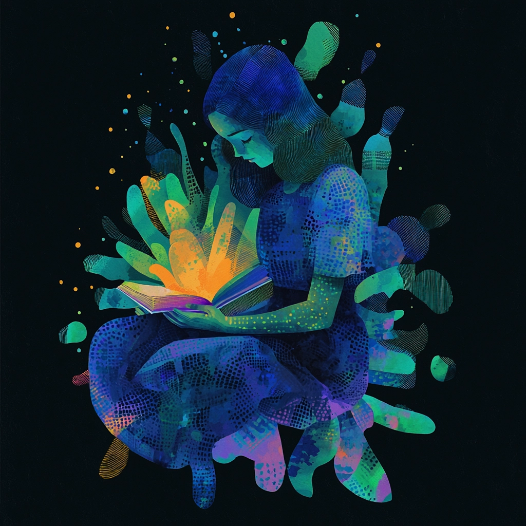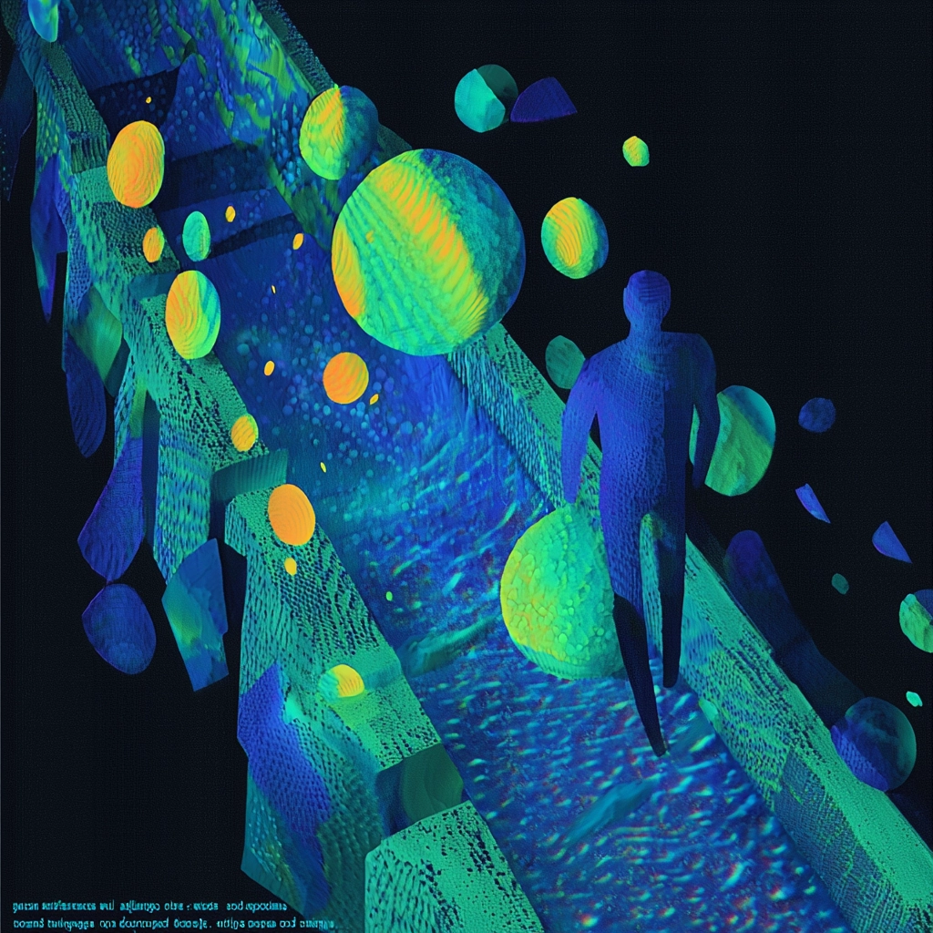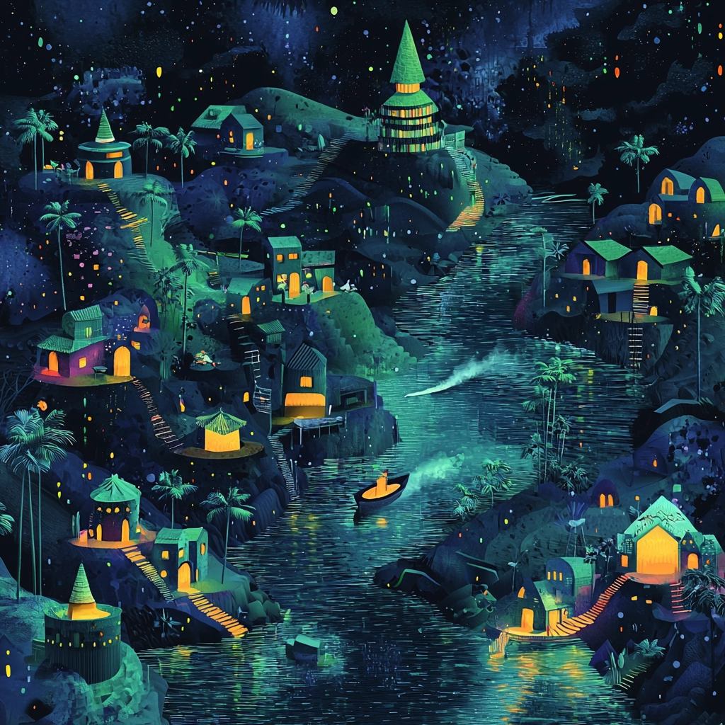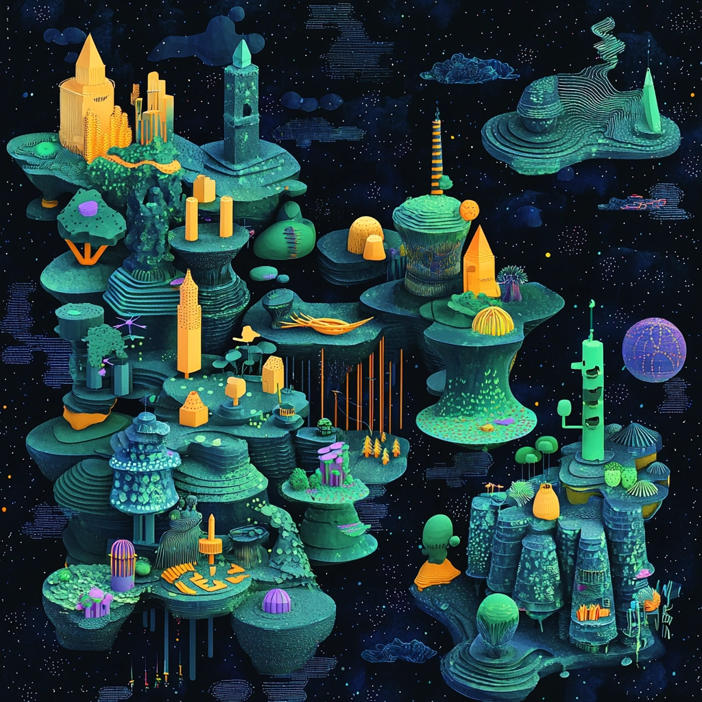 The interplay of vibrant colors against the dark background establishes a striking contrast, enhancing depth perception. Organic textures blend seamlessly with geometric forms, illuminated by a luminescent glow that provides unique visual appeal. The spatial arrangement suggests movement and fluidity through its layered visuals.