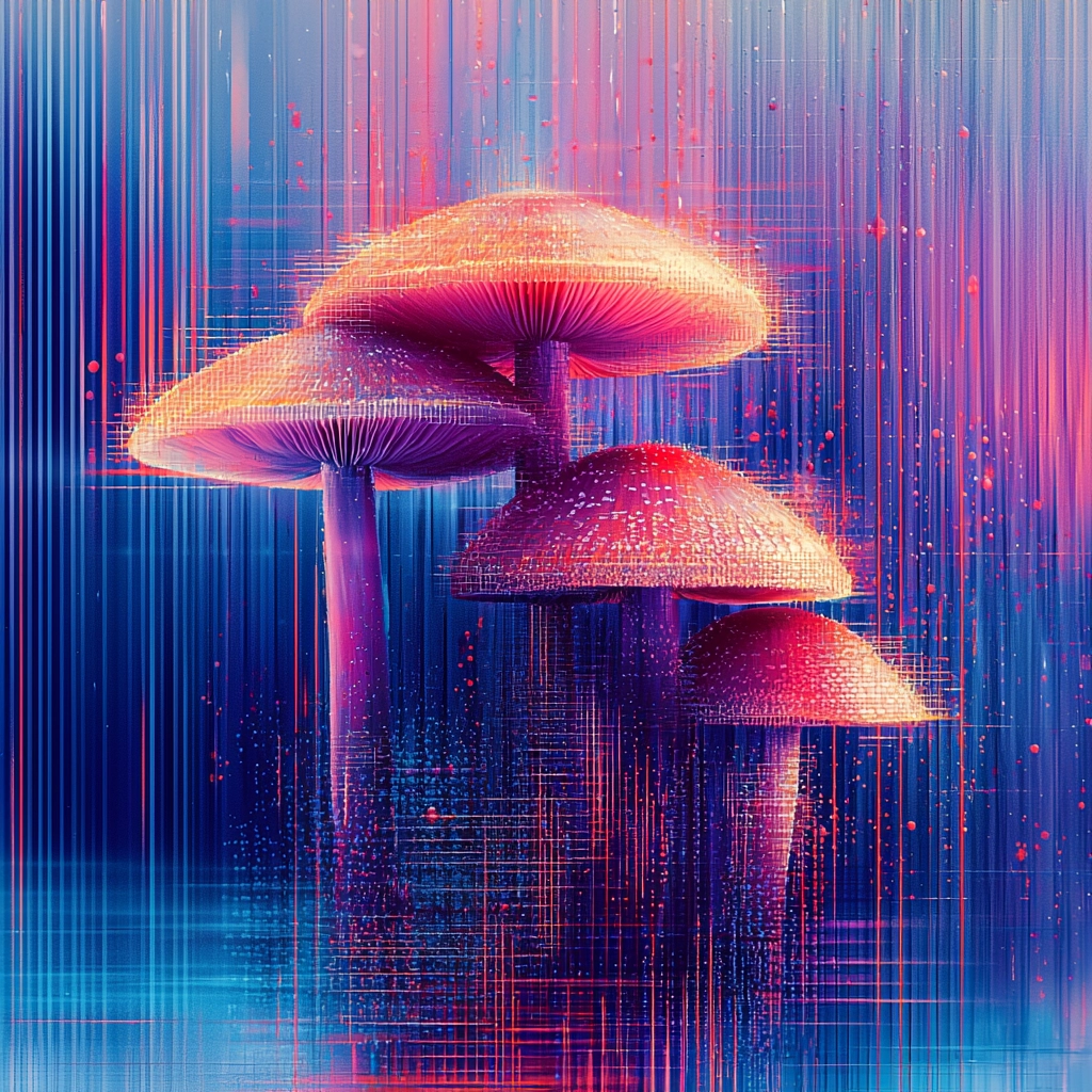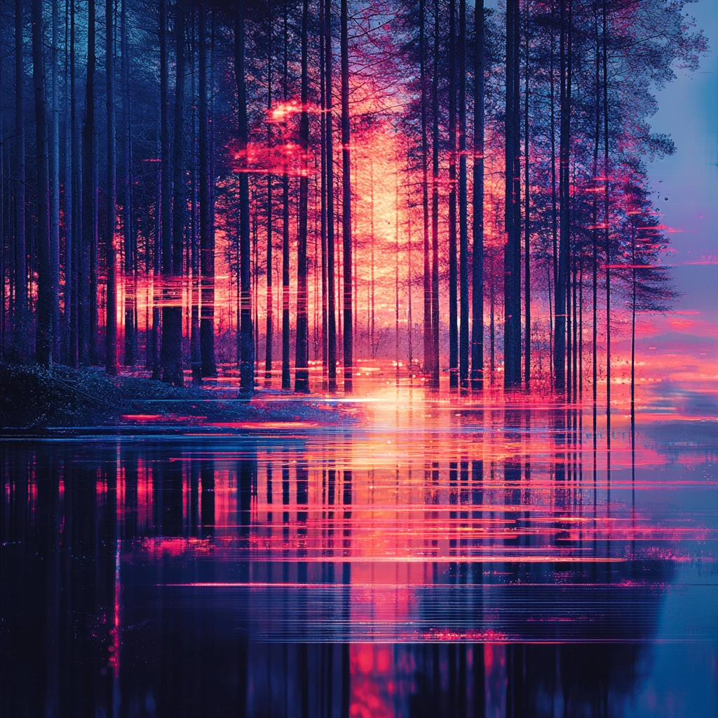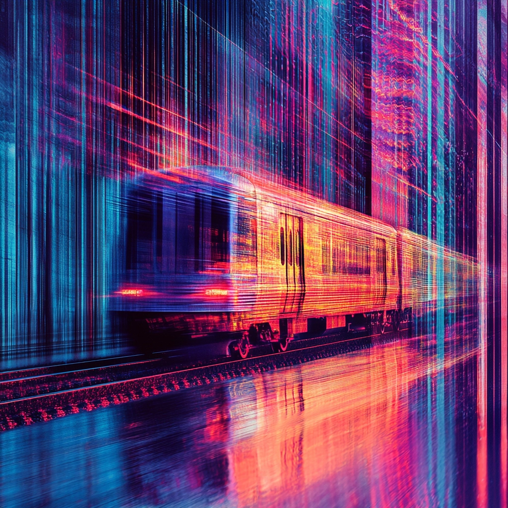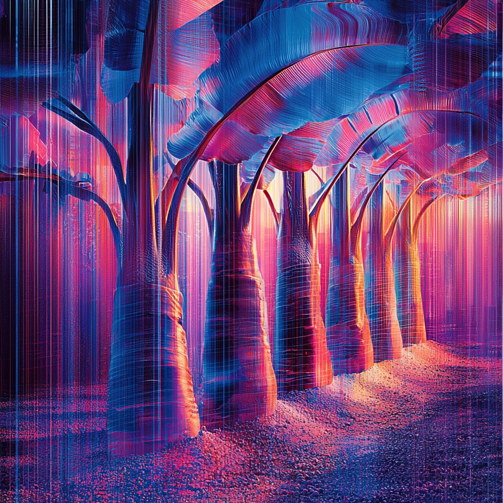 The lighting effects emphasize contrast between bright and dark areas, using vivid blues, pinks, and purples to create a sense of depth and movement. The textures are layered, producing a streaking effect that highlights the interplay of light and shadow. Spatial perception is enhanced through the interplay of vertical and horizontal lines, adding a dynamic and futuristic feel to the visual experience.
