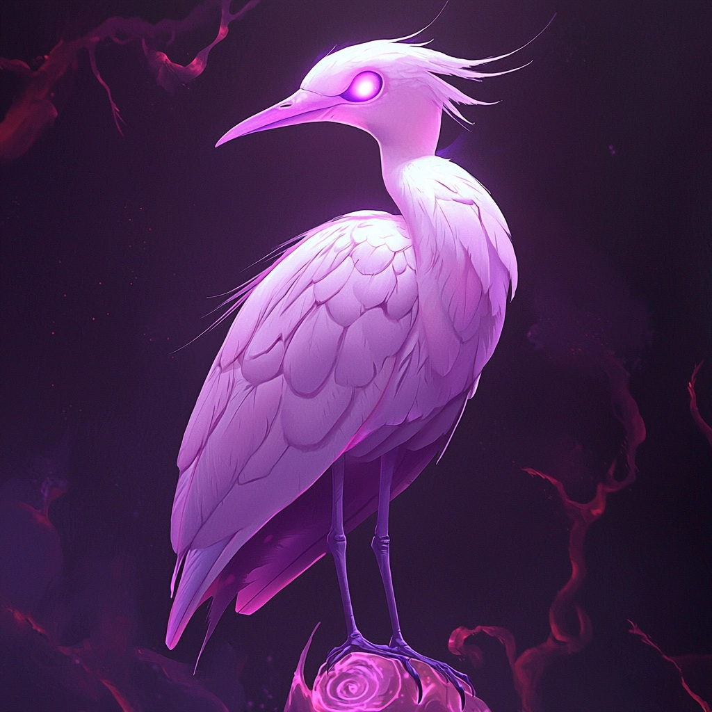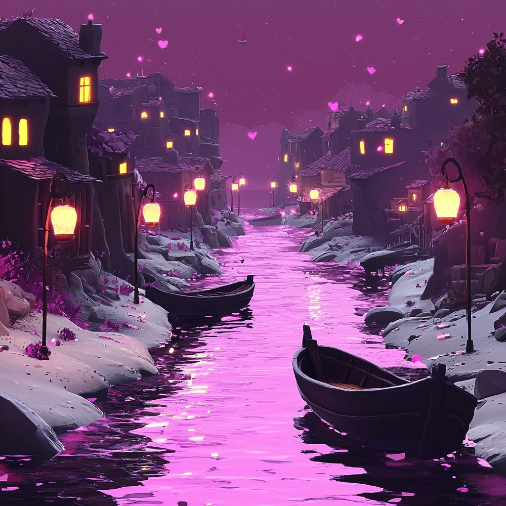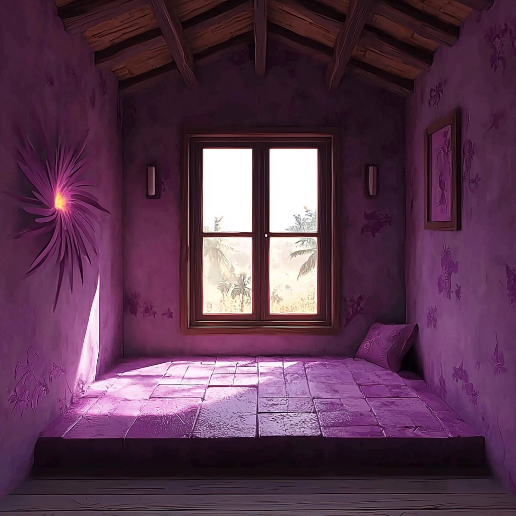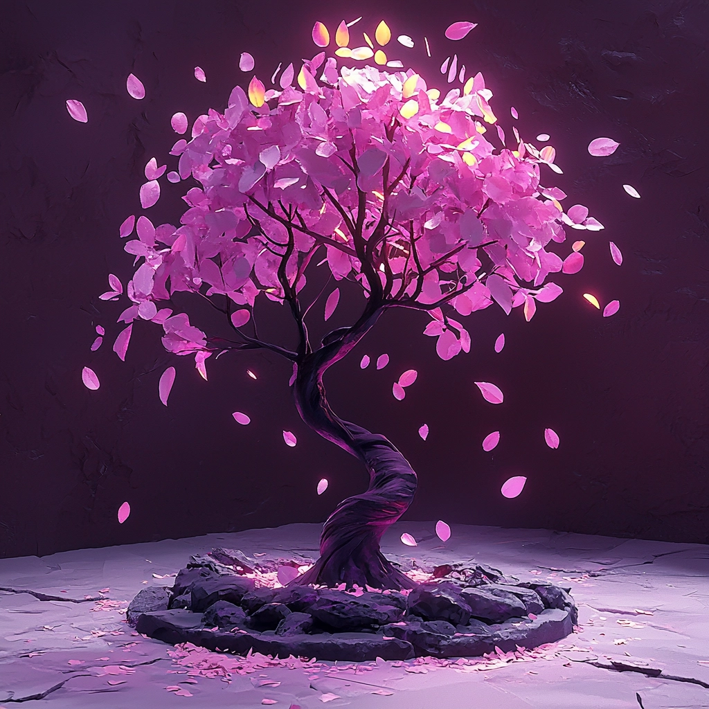 Lighting effects mimic a soft glow, enhancing the fantasy atmosphere through luminous purple hues. Depth is achieved through diverse texture applications within elements, emphasizing spatial intricacies while maintaining gentle transitions and a balanced visual flow.
