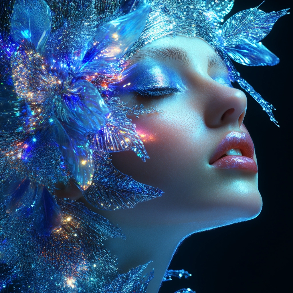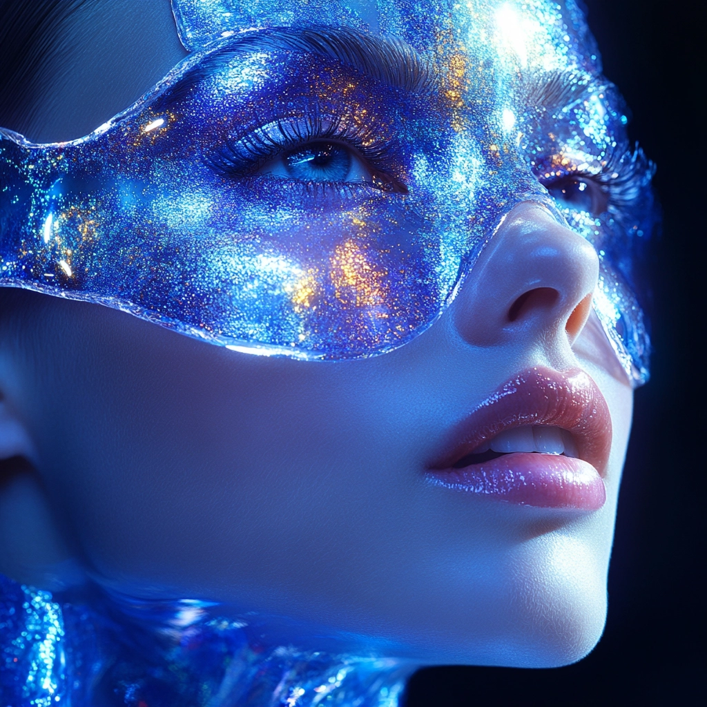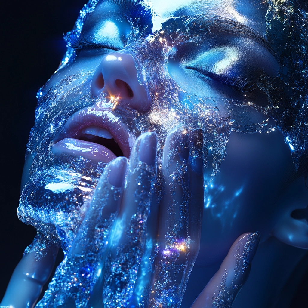 Glowing lighting and rich texture enhance spatial depth, creating a vivid visual experience with the interplay of shimmering surfaces and deep blues.