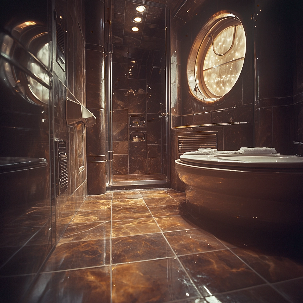 The lighting creates striking contrasts against the dark brown tones, accentuating the smooth, polished textures and complex spatial depth. Gold highlights brilliantly illuminate the surfaces, providing a sense of movement and rhythm across the composition.