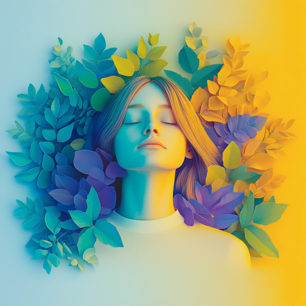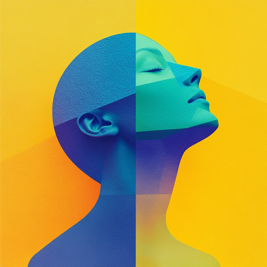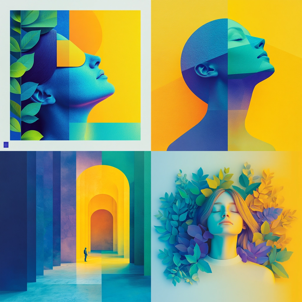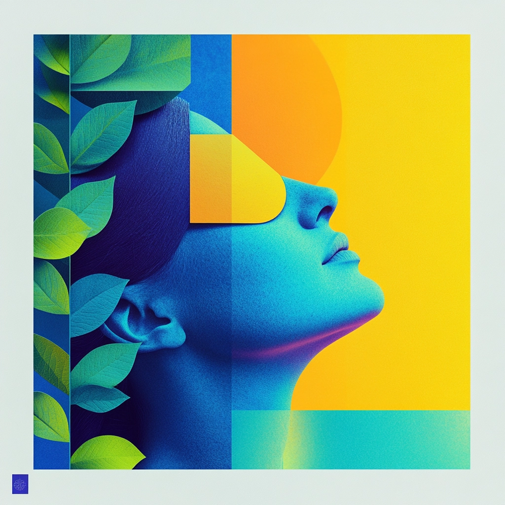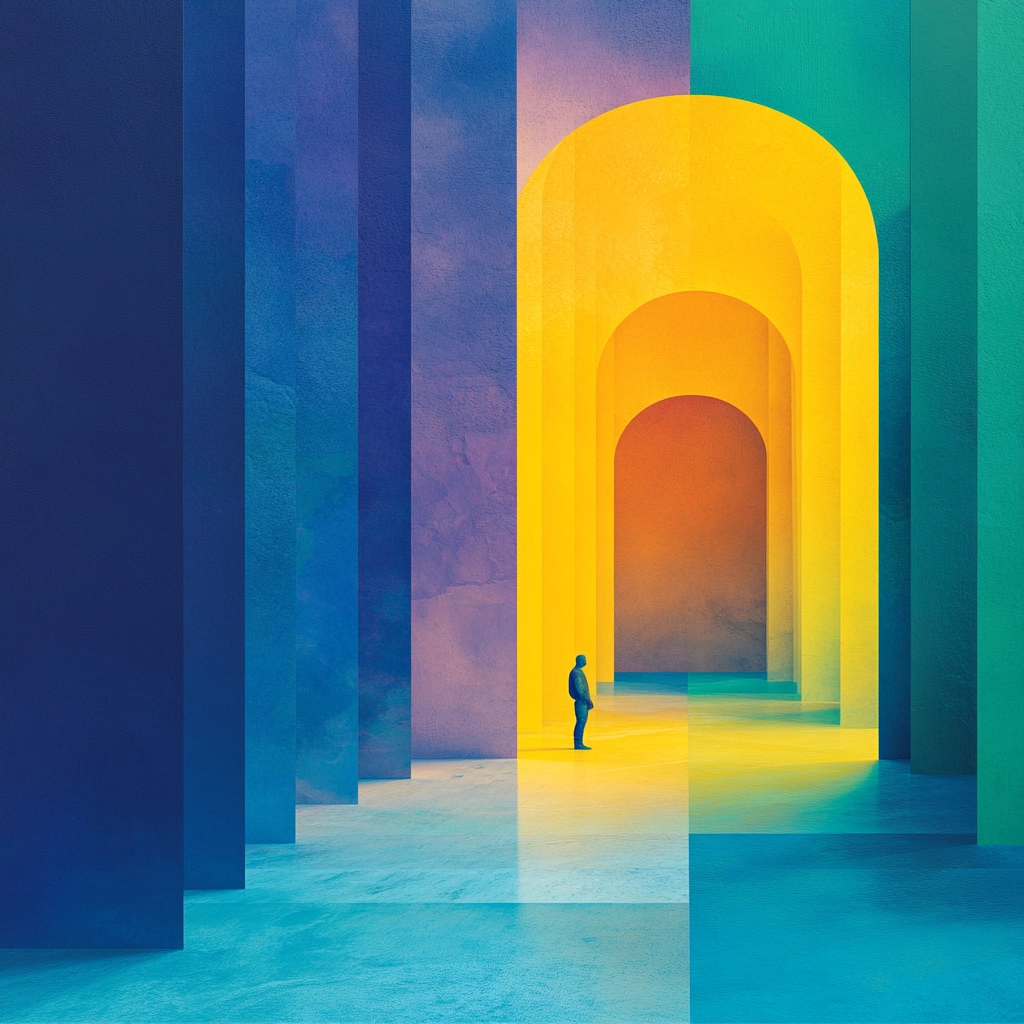 Lighting is bright with clear distinctions between illuminated areas and shadows, creating depth with an interplay of color saturation. The spatial sense is emphasized through layered textures, enhancing the perception of dimension and space.