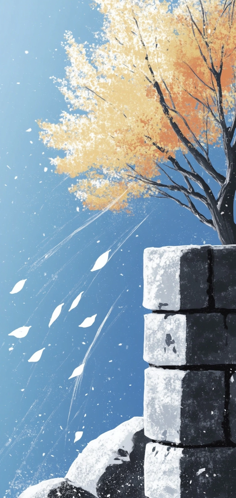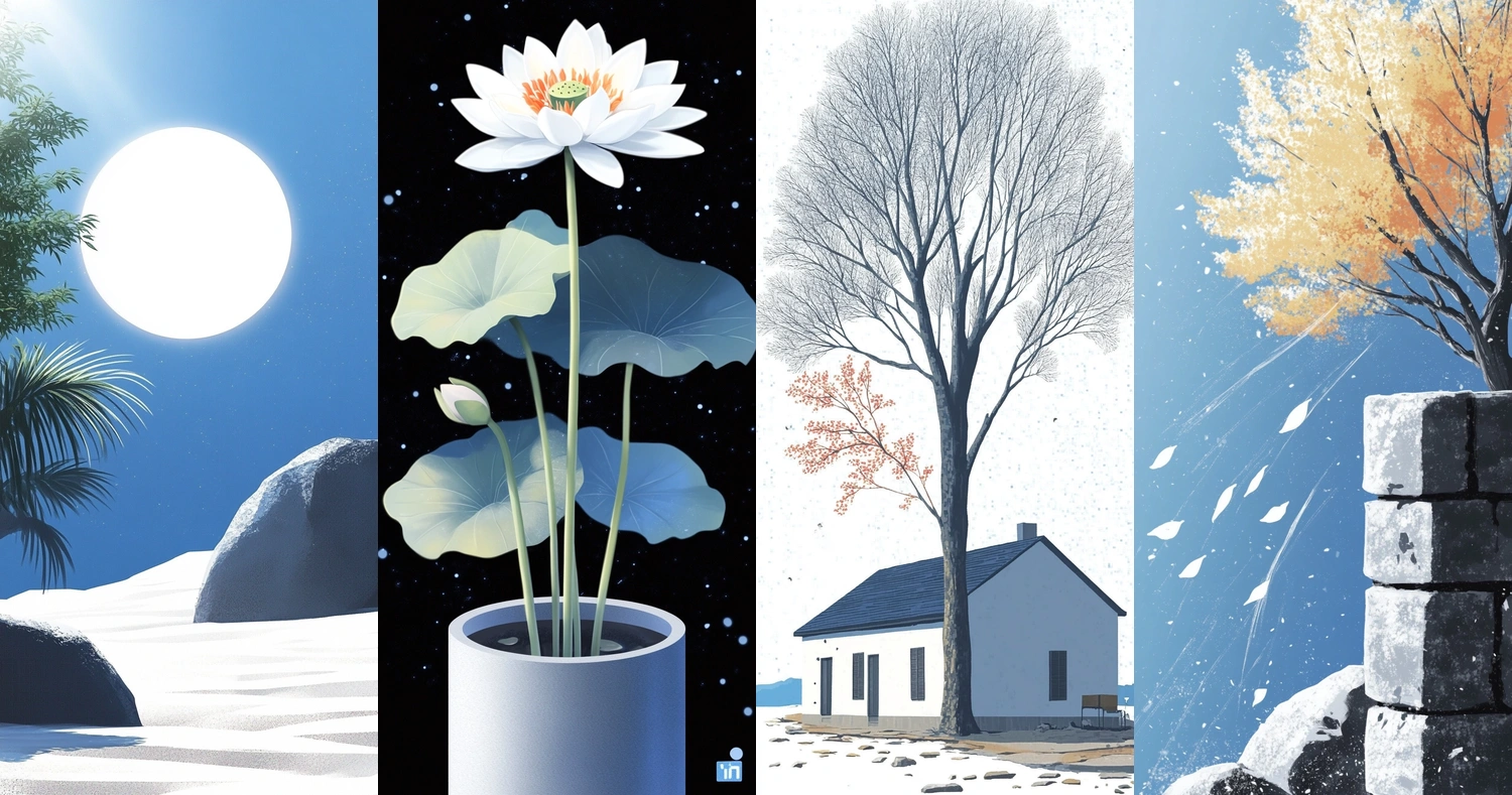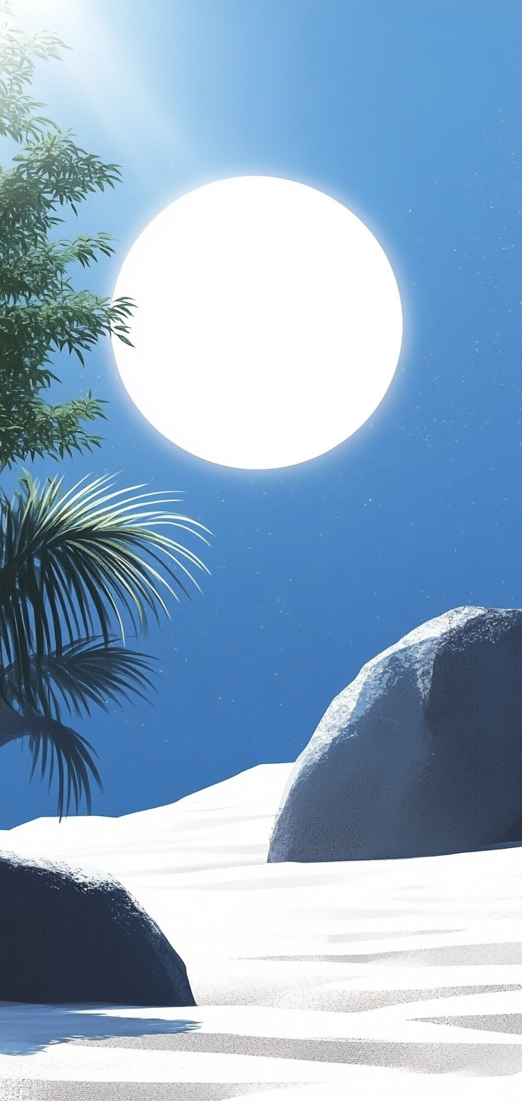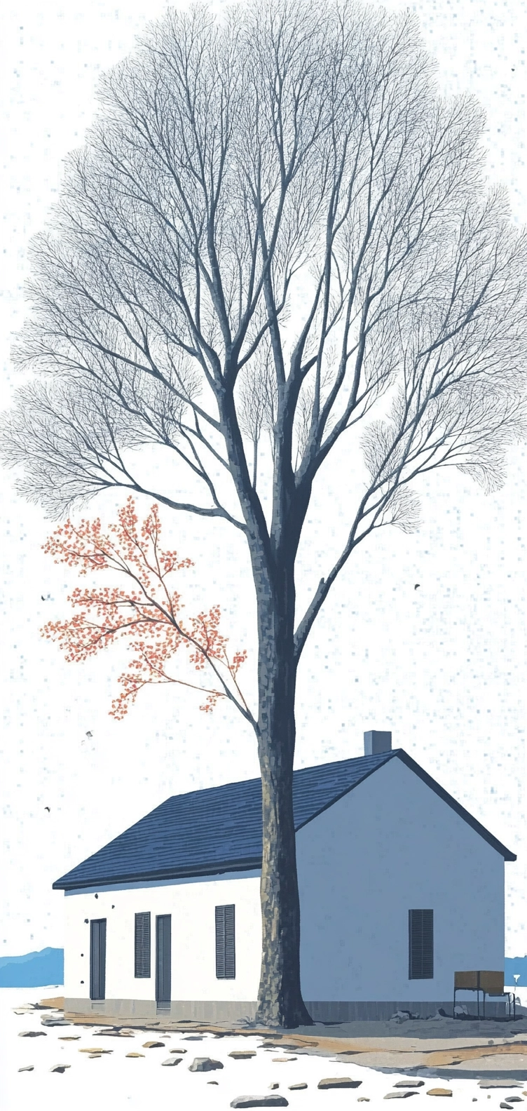 The artwork employs a strong use of lighting, highlighting the vividness of blues against crisp whites. A spatial depth is achieved through meticulous shadow work, while texture variations provide a tactile quality.