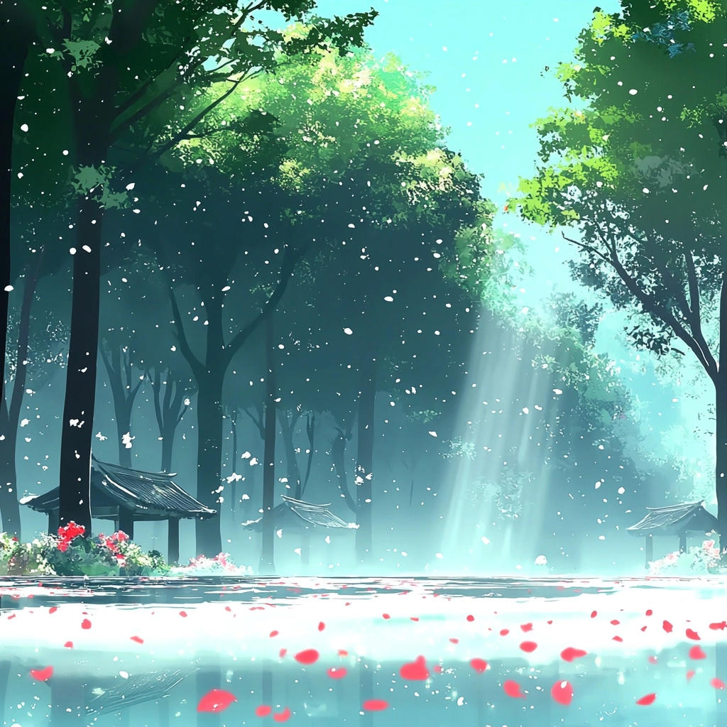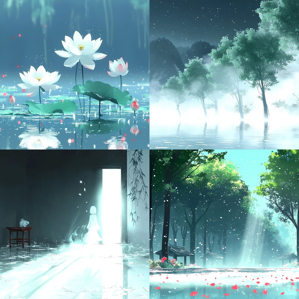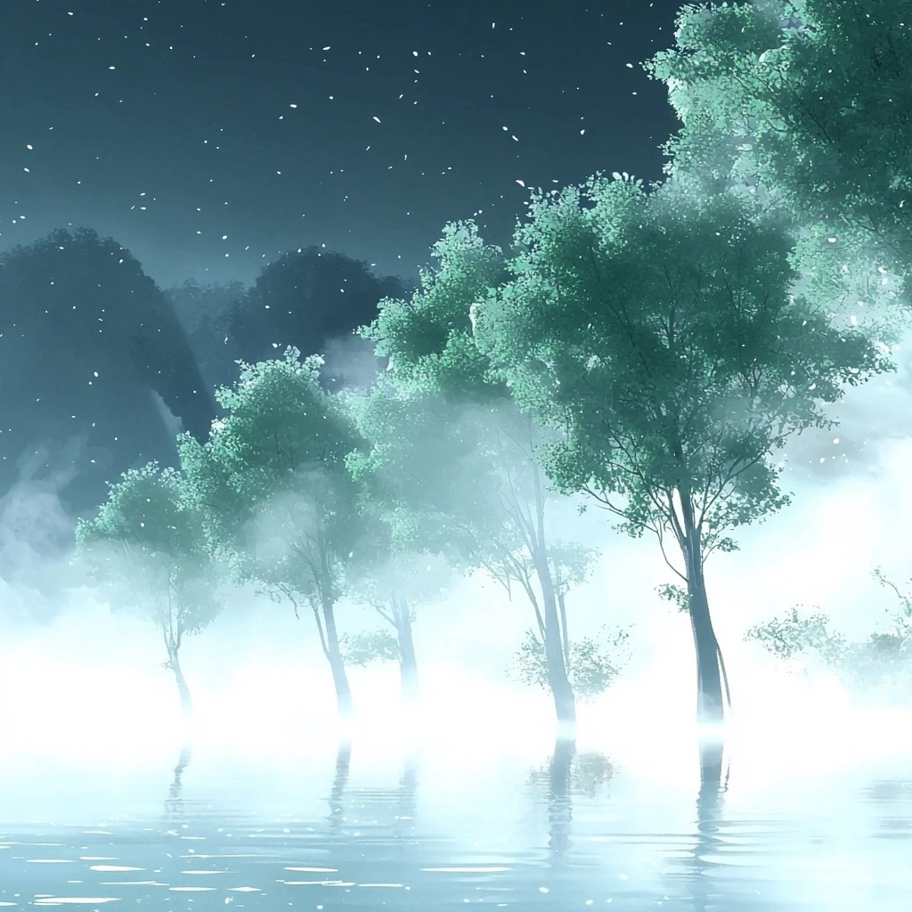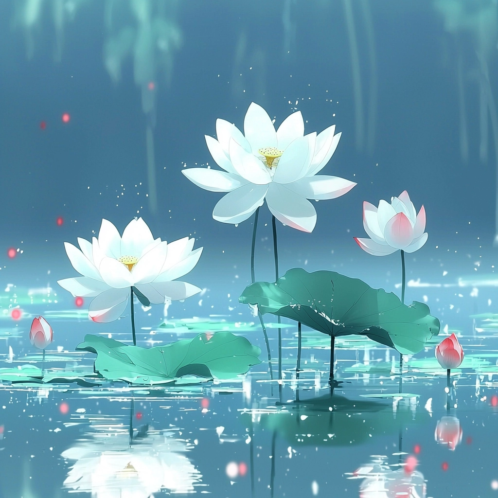 The use of cyan and green shades produces a soothing effect, with advanced manipulation of light and shadow enhancing depth and dimension. Texture ranges from smooth water reflections to softly-defined botanical elements, providing a blend of clarity and diffusion.