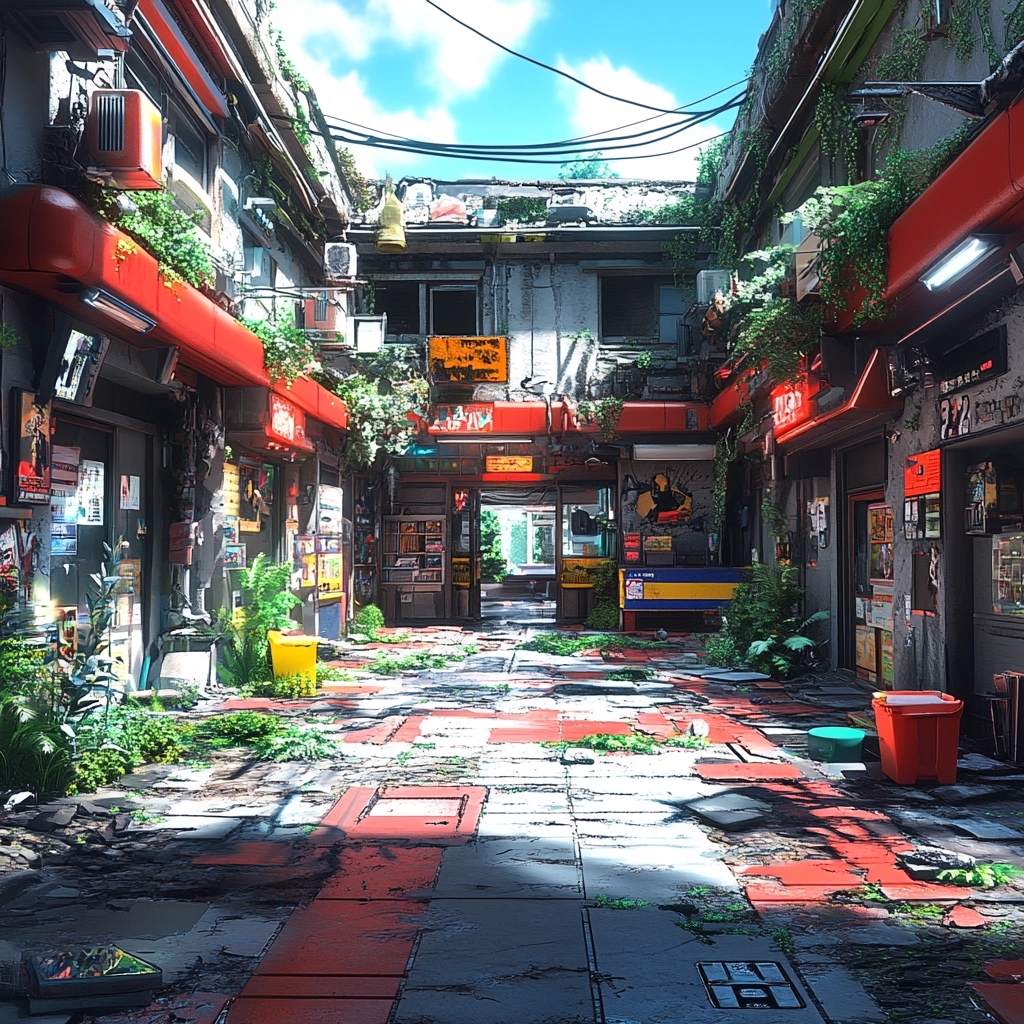 Brightly diffused and directional lighting accentuates metallic surfaces and reflective textures, while bold color saturation highlights vivid contrasts between natural and artificial elements. Spatial depth is achieved through diagonal perspectives and layered compositions.