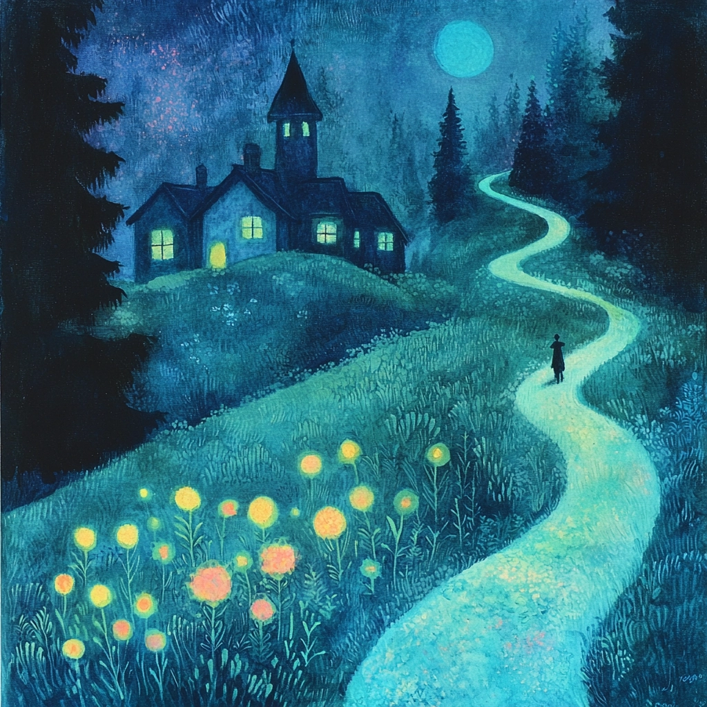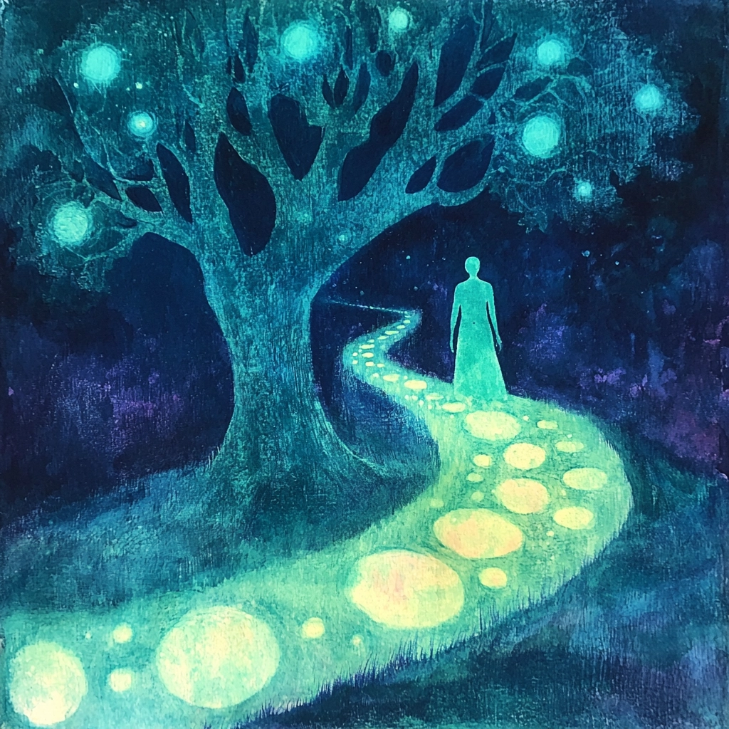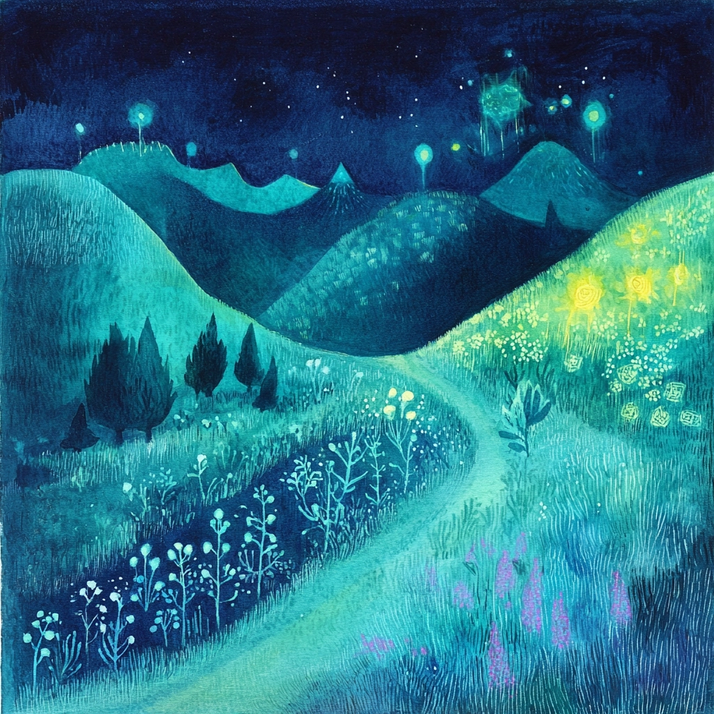 The lighting creates vivid focal points with radiant cyan and yellow highlights, set against a predominantly dark blue palette. Smooth transitions between hues emphasize depth, while delicate brush textures strengthen the impression of layered spatial dimensions.