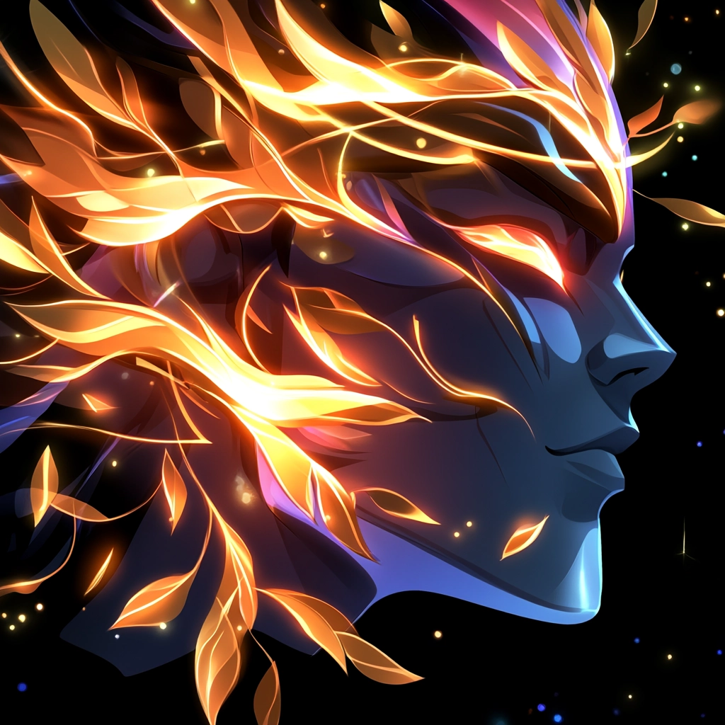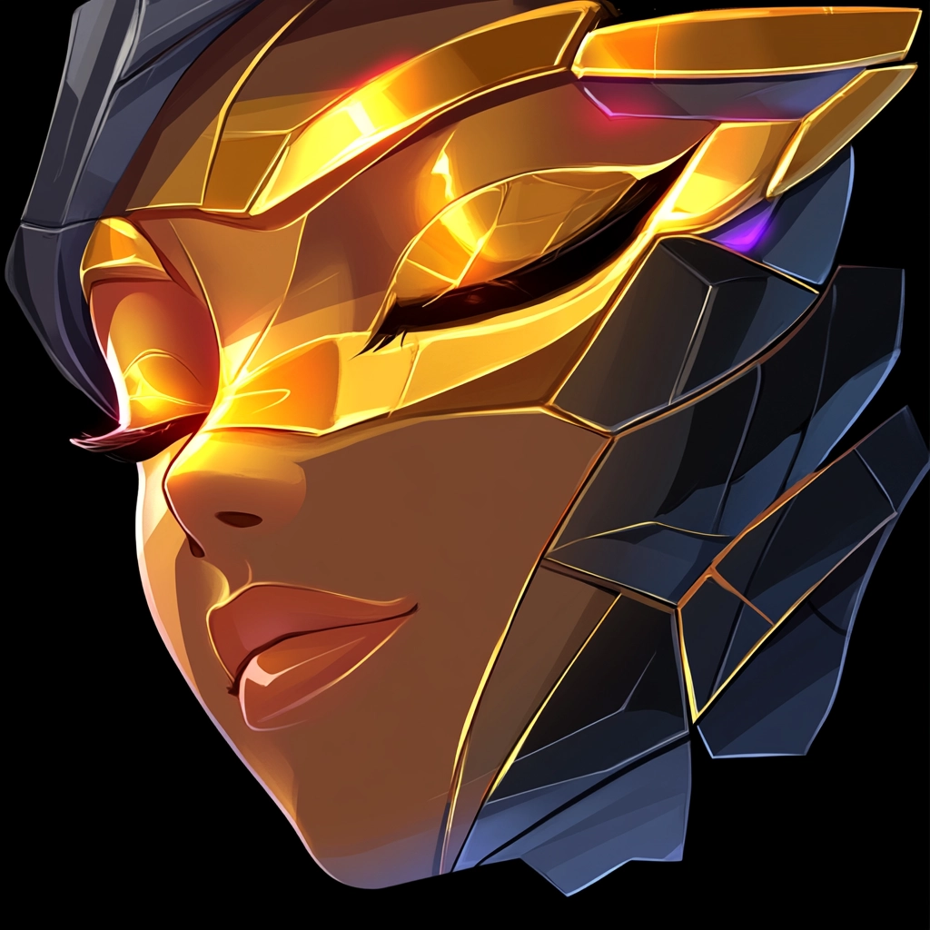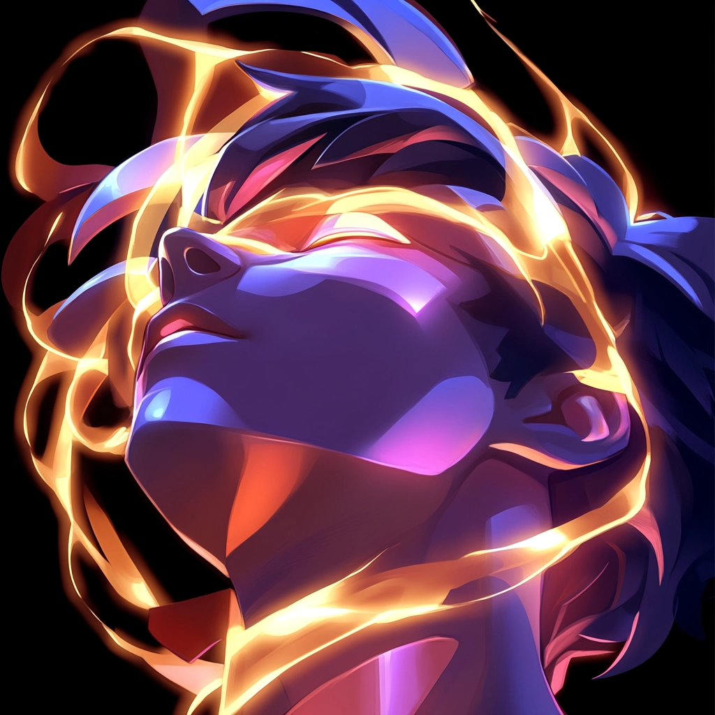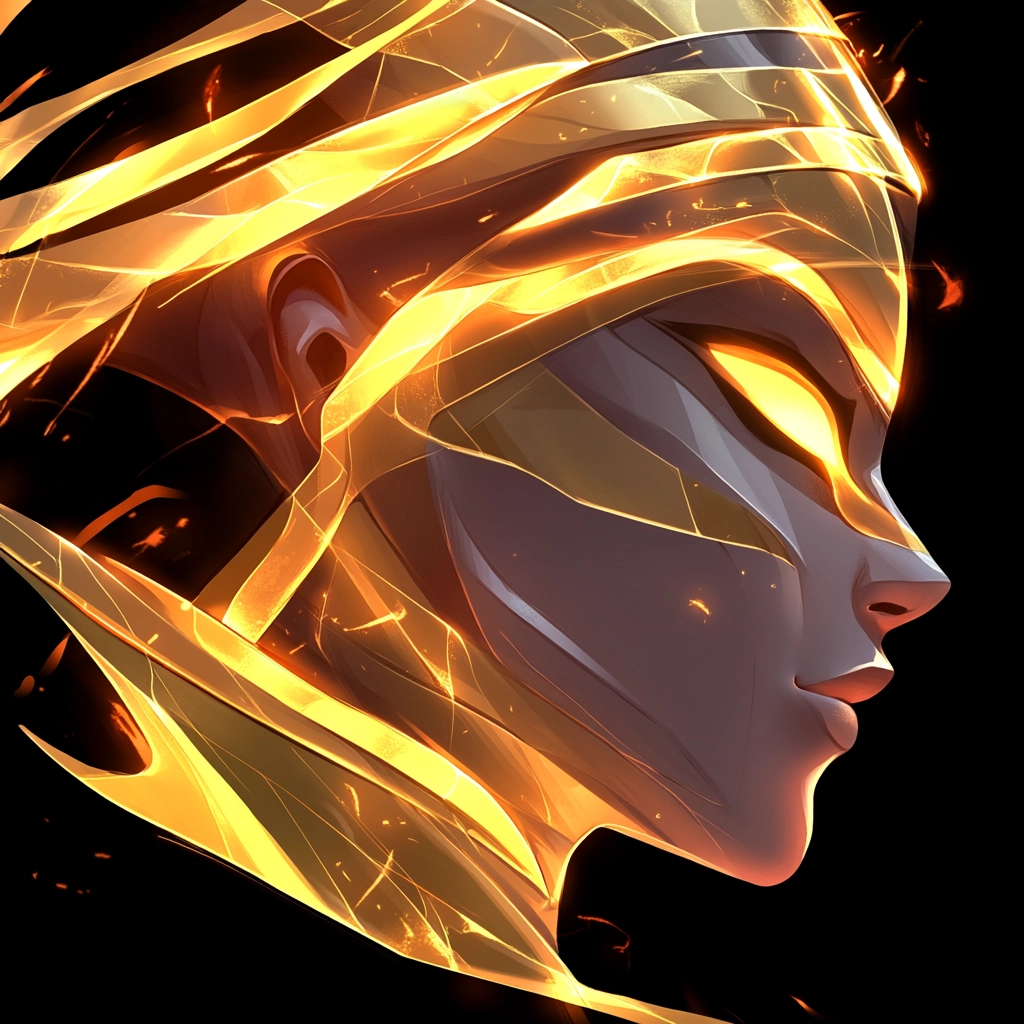Lighting effects emphasize dynamic, glowing streaks of gold creating a sense of motion. The color characteristics mix vivid purples with pops of intense gold, adding depth. The sense of space is compact yet fluid, while the texture appears smooth and polished.