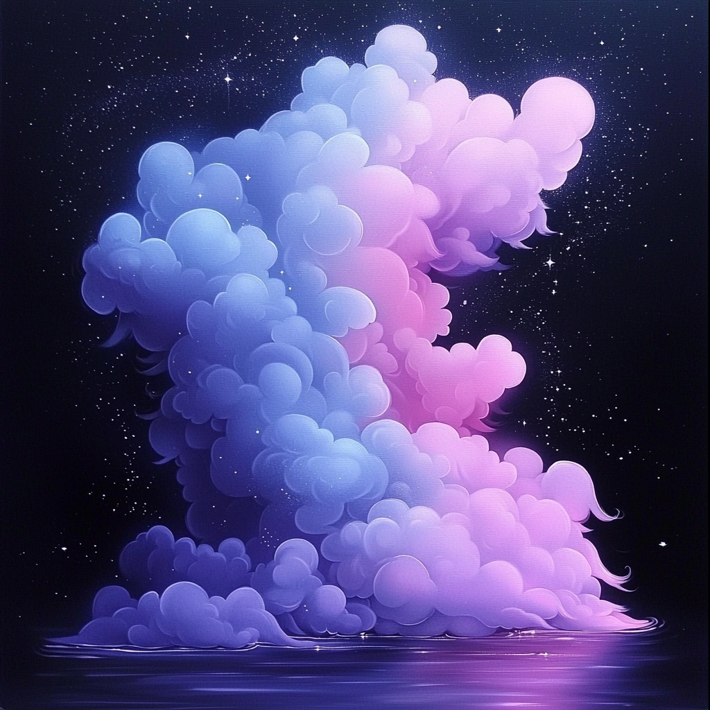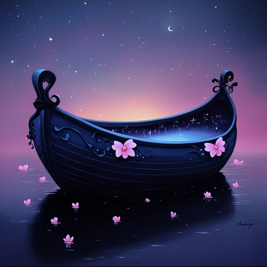 Vivid, dreamlike scenes with strong contrasts utilizing purple, black, and pink hues.