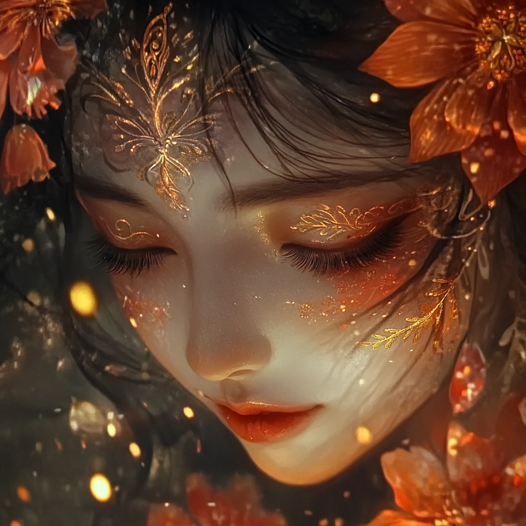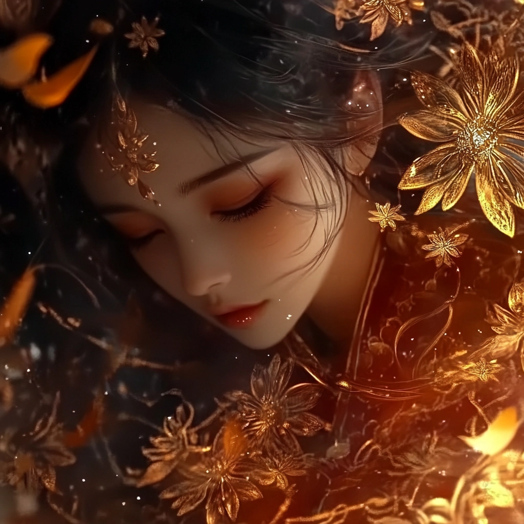 Radiant orange and brown hues dominate, creating a vivid scene filled with intricate floral patterns.
