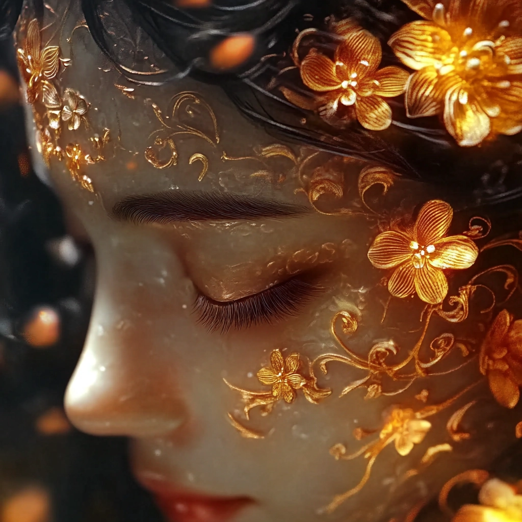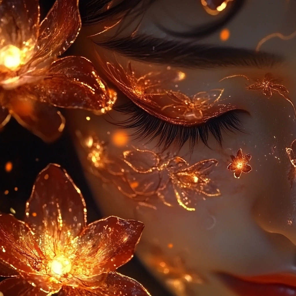 The warm, incandescent glow accentuates the floral textures, evoking a sense of intricate beauty. The spatial composition provides depth, while the detailed portrayal of light and shadow enhances the rich textures.