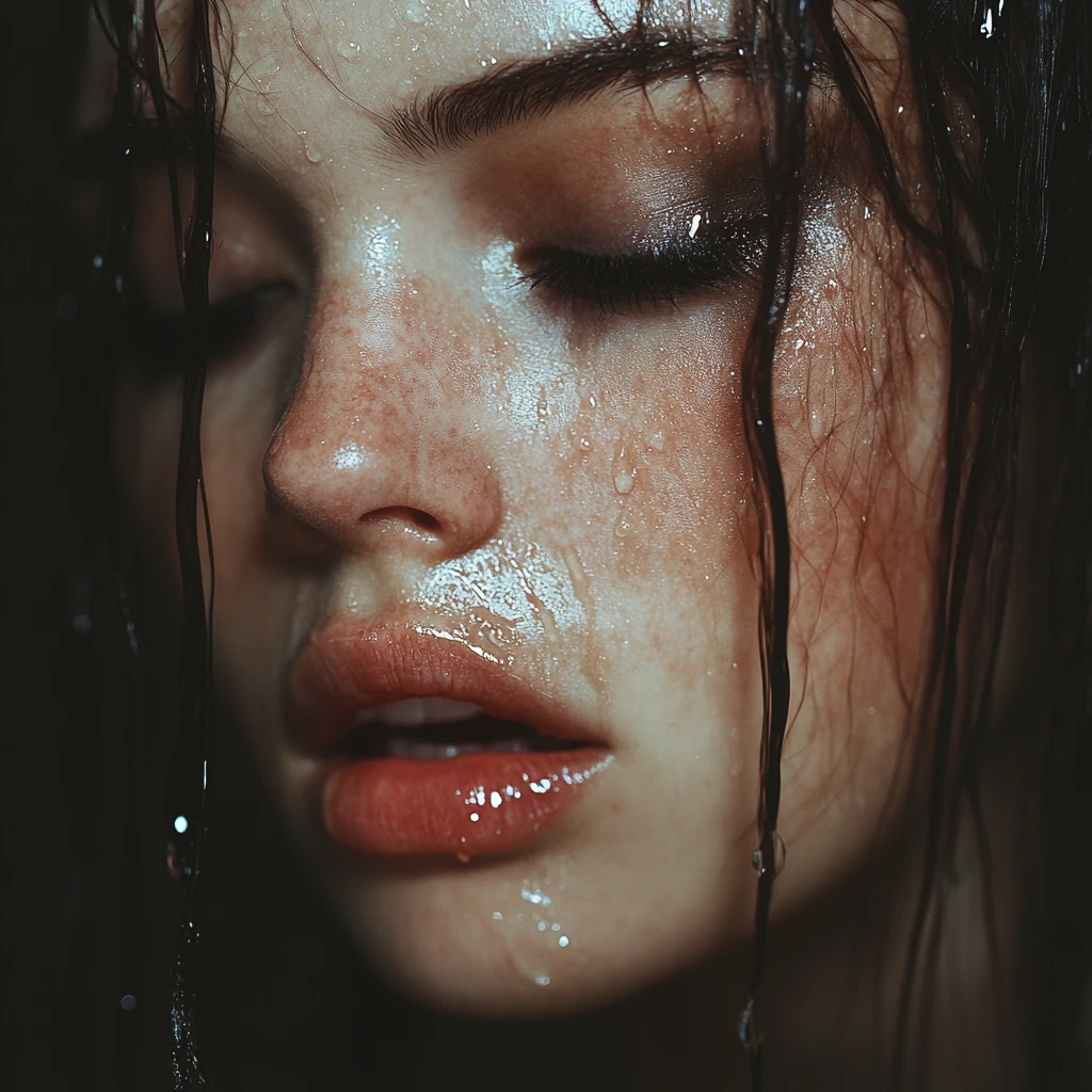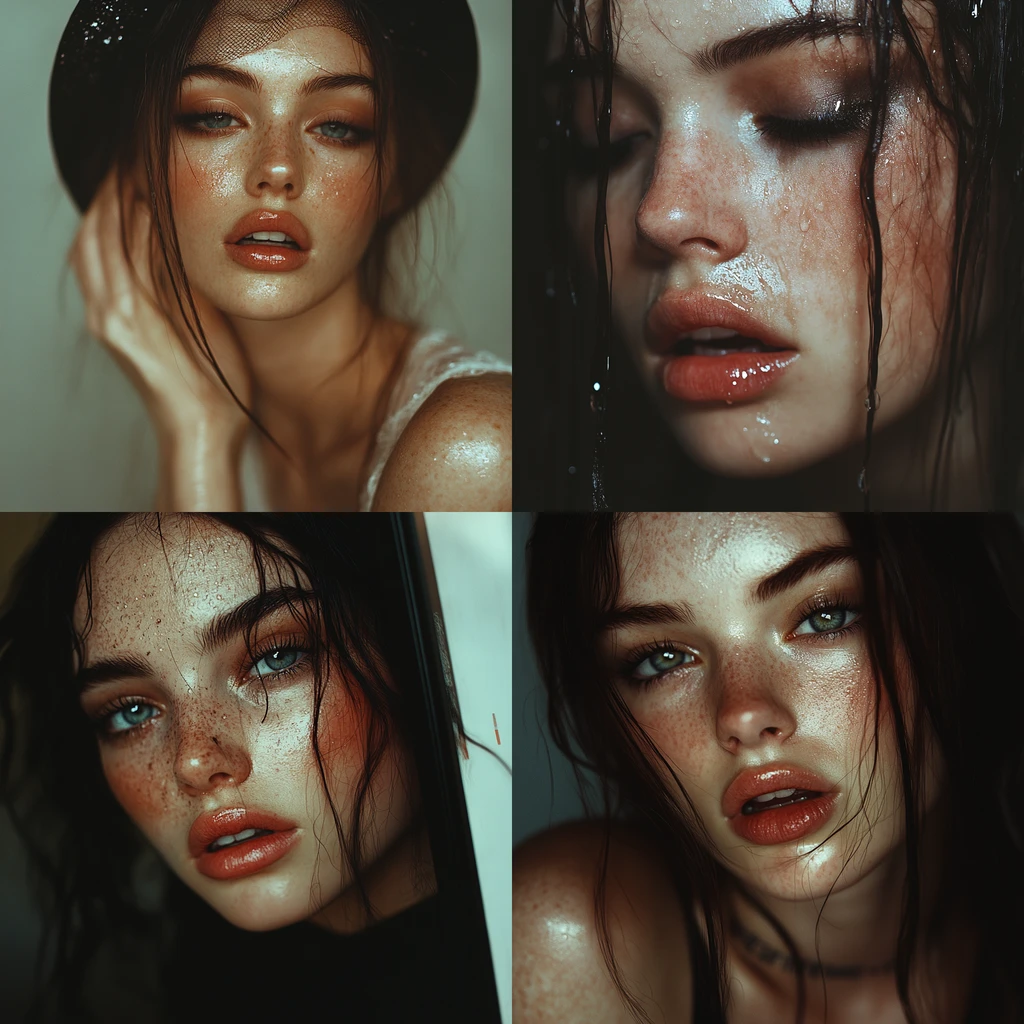 Intimate close-ups with striking contrast between dewy skin and vibrant lips, emphasizing texture and light play on facial features.