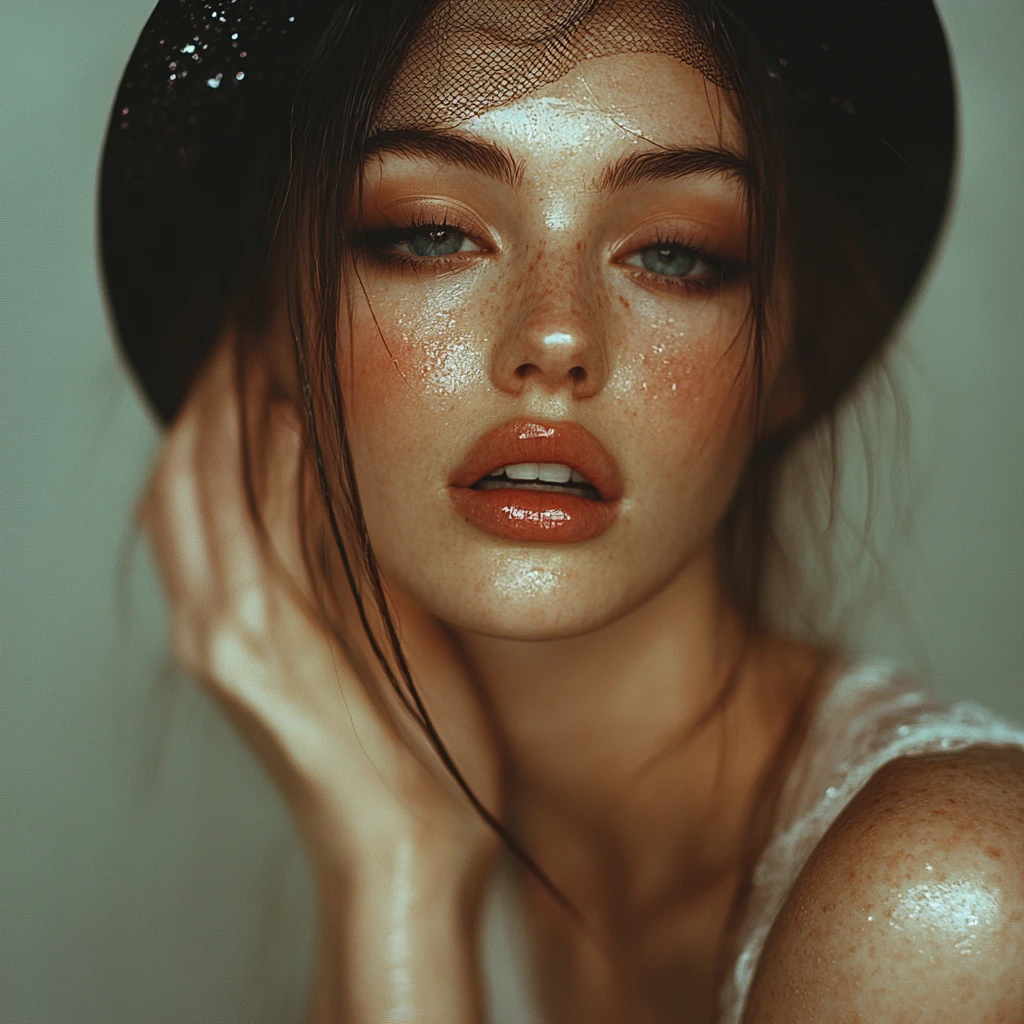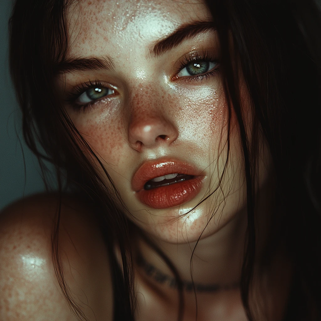Dramatic interplay of light and shadow accentuates skin texture. Saturated lip color contrasts with pale, freckled complexion. Glistening highlights create a sense of moisture and immediacy.