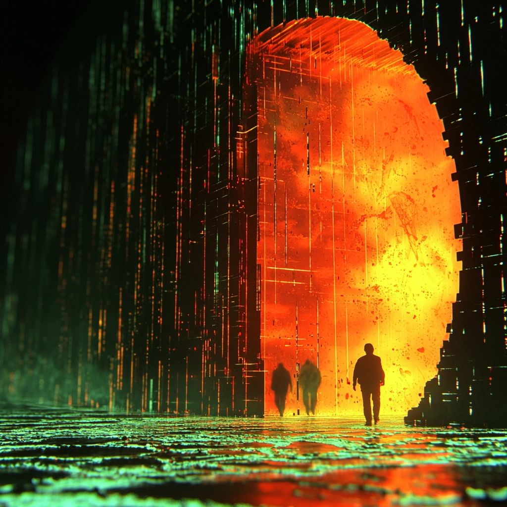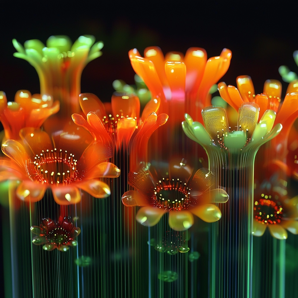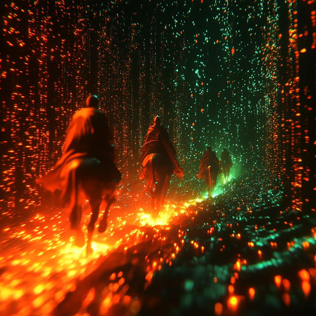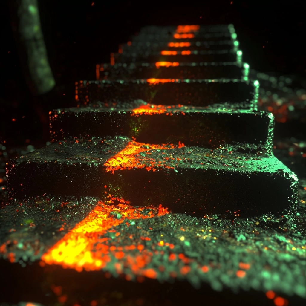 Brilliant orange lighting casts an ethereal glow against deep greens and blacks, enhancing the texture with a shimmering effect. The composition suggests a spacious environment through contrasting luminance and slight motion blur, implying depth and activity.