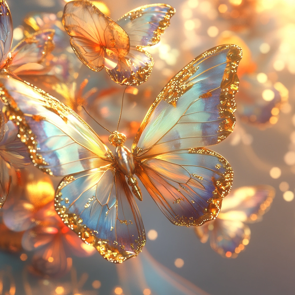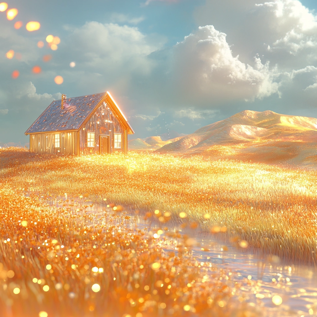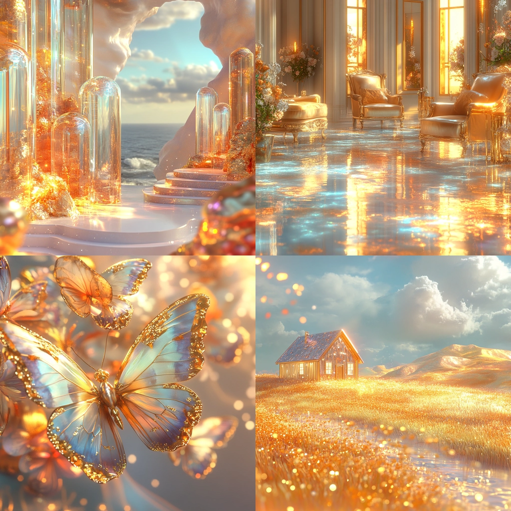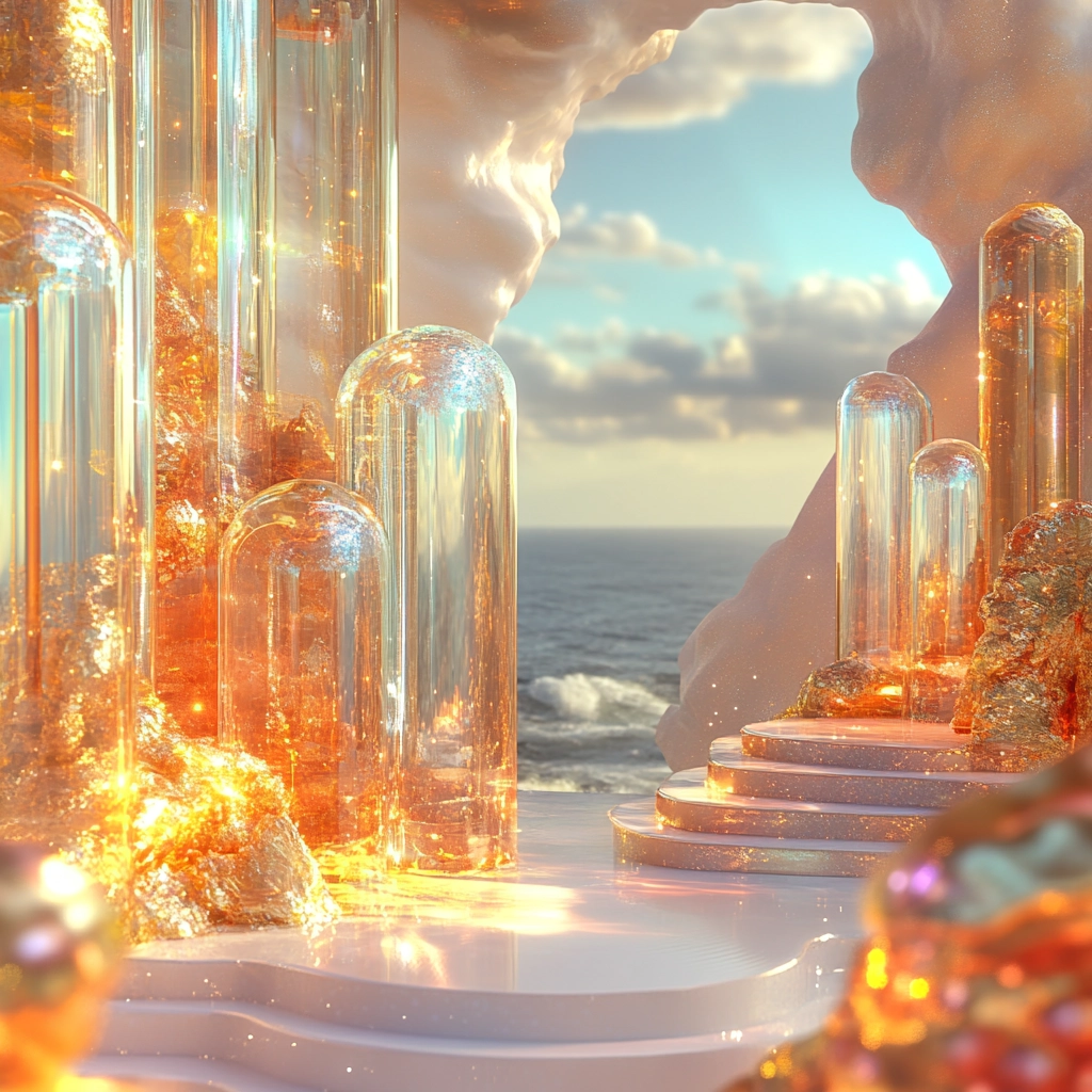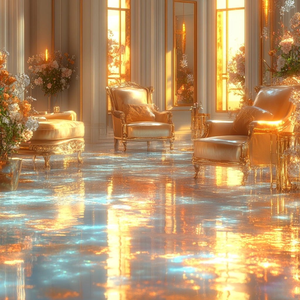 Glistening lighting produces a shimmering effect across surfaces, accentuating the glossy and reflective qualities. The spatial arrangement is expansive, enhancing the radiant glow within a vivid and lively setting.