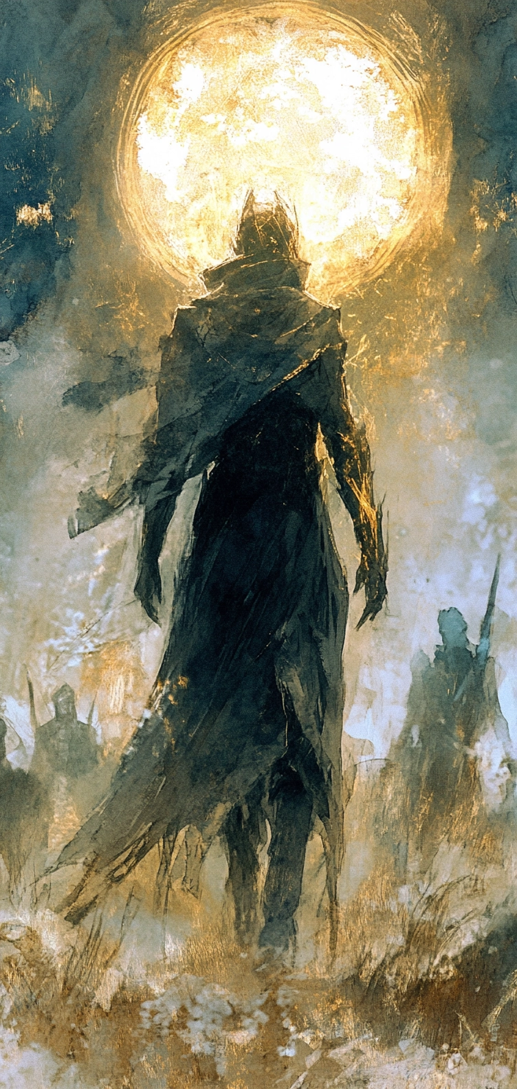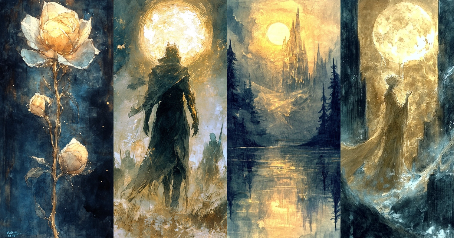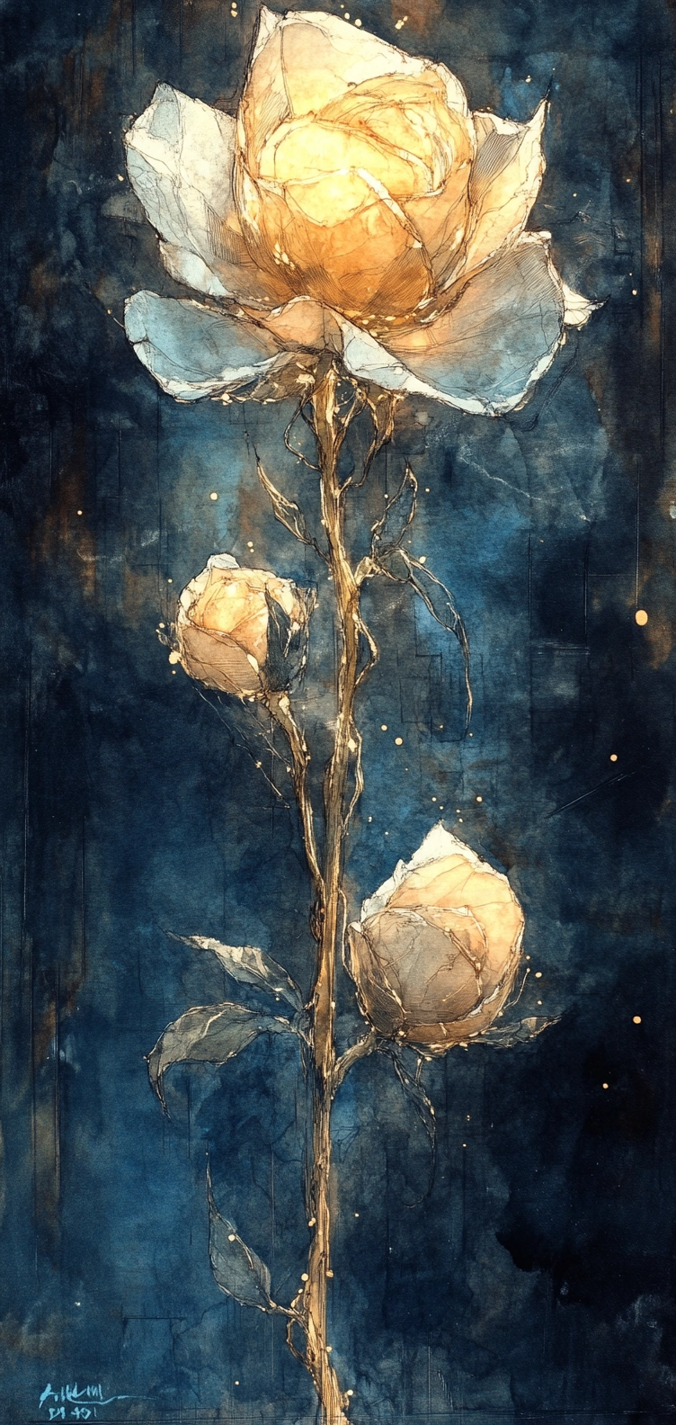 Bold lighting contrasts enhance the luminous effect, with gold tones giving warmth against a deep blue background. The sense of space is emphasized through intricate textures, producing a compelling depth.