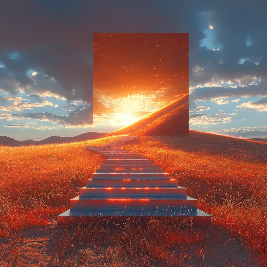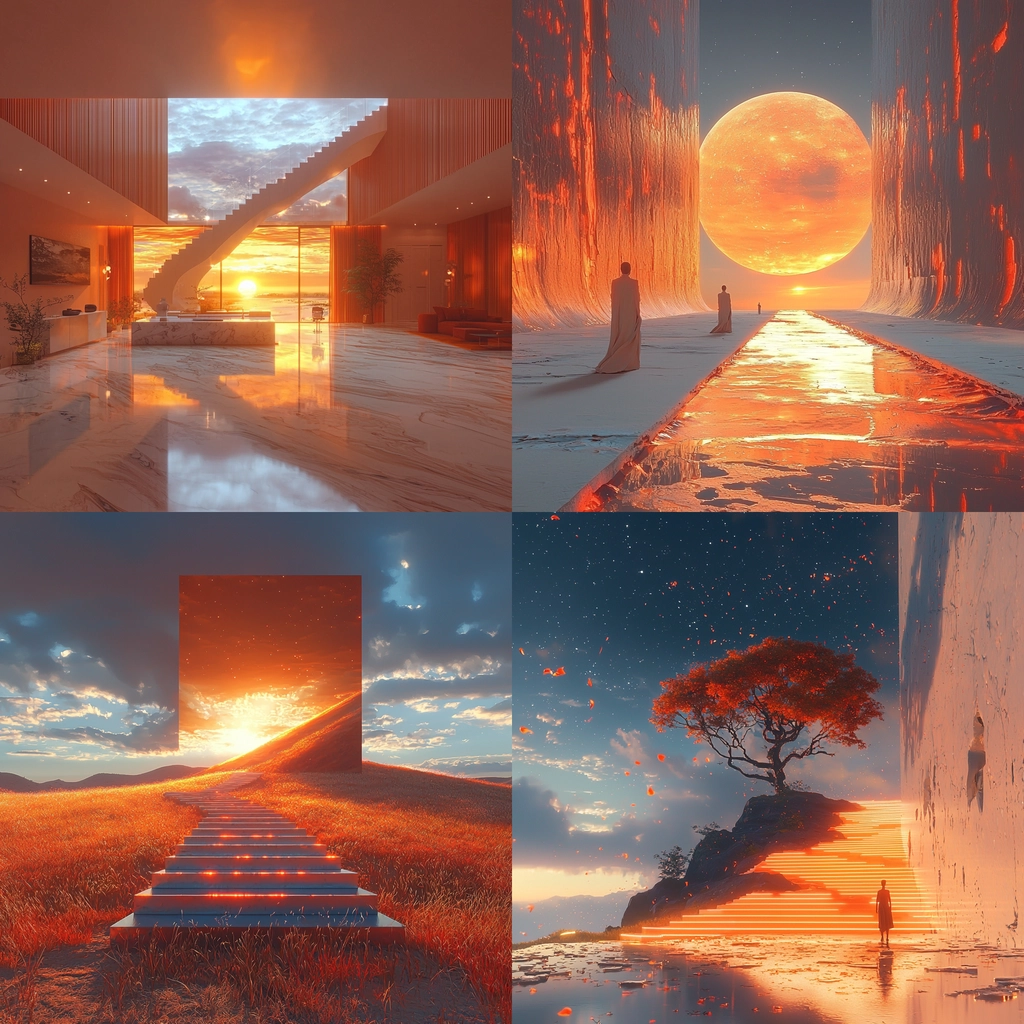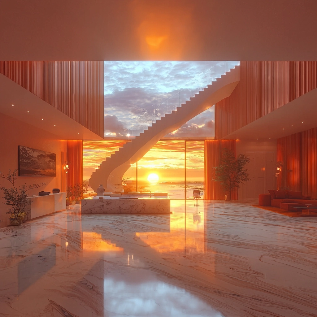 Lighting features emphasize a strong interplay between warm and cool tones, with radiant orange hues blending seamlessly into lighter blue gradients. Highly polished textures amplify light reflections across open and spacious compositions, enhancing depth and clarity.