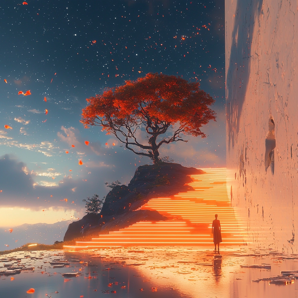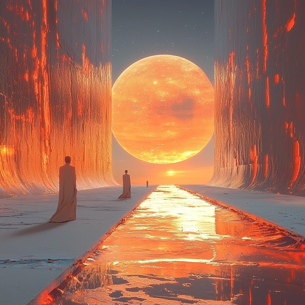 Radiant orange lighting contrasts with cool blue gradients, showcasing reflective surfaces and expansive spatial arrangements.