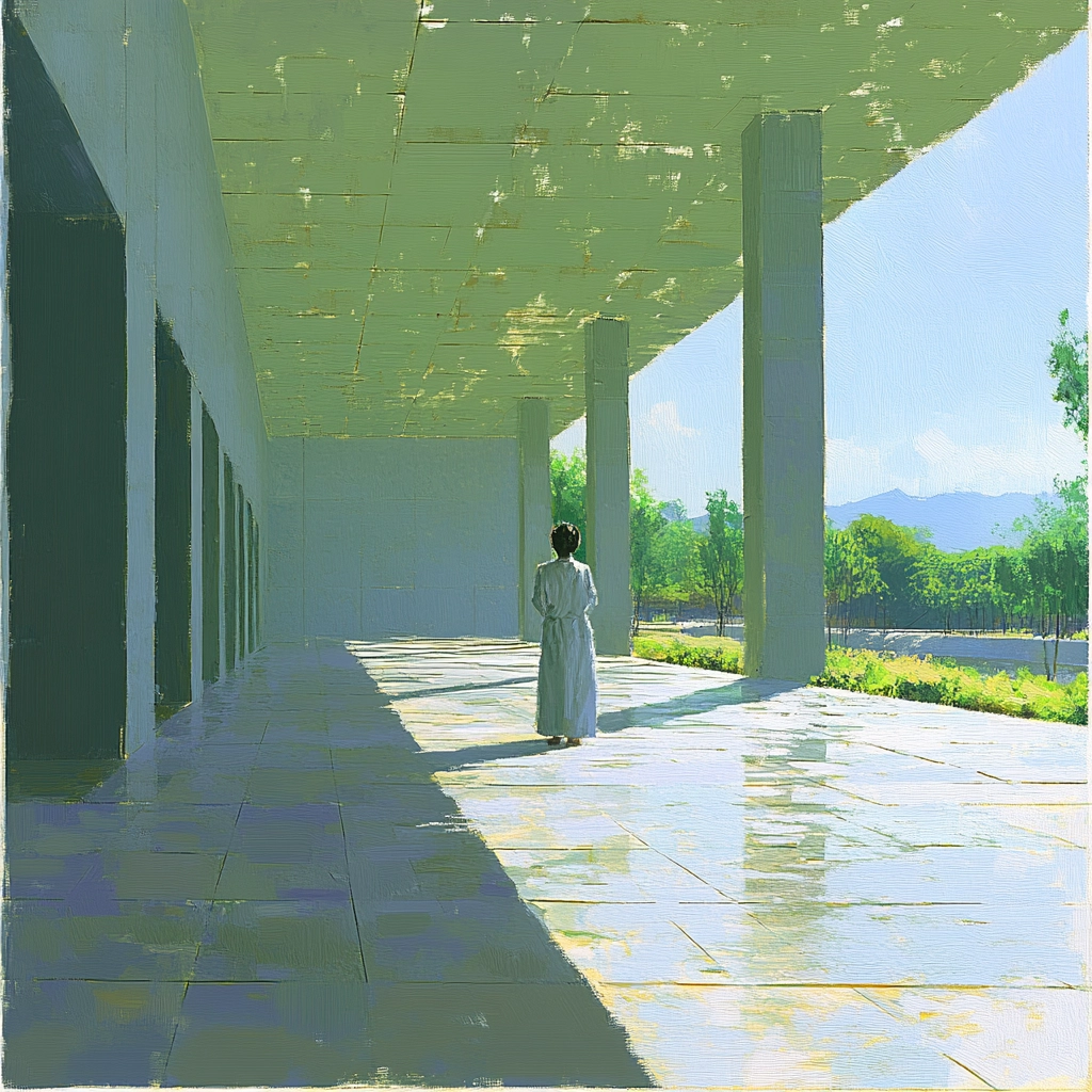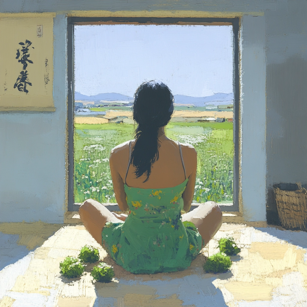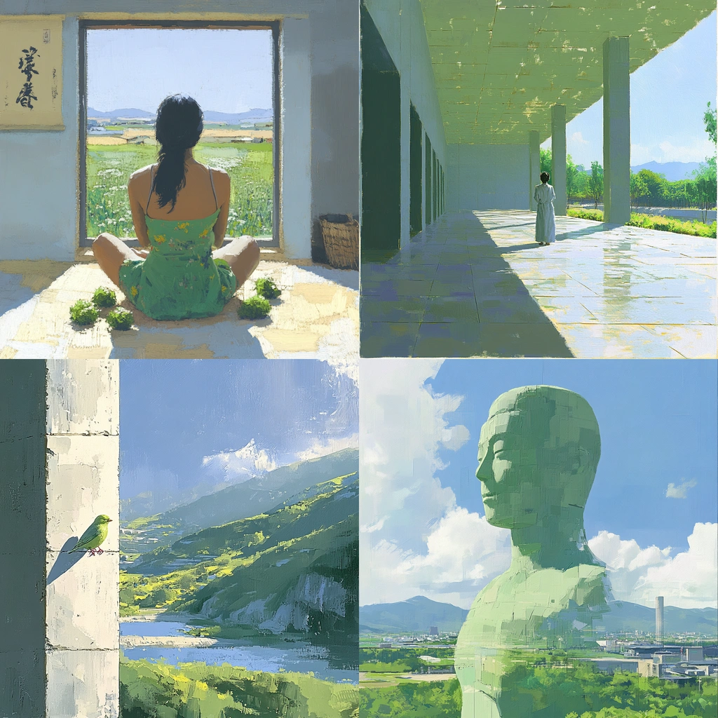 The use of light creates dramatic contrasts highlighting natural elements. Soft brushwork gives texture, and bright greens and blues dominate creating depth and clarity.