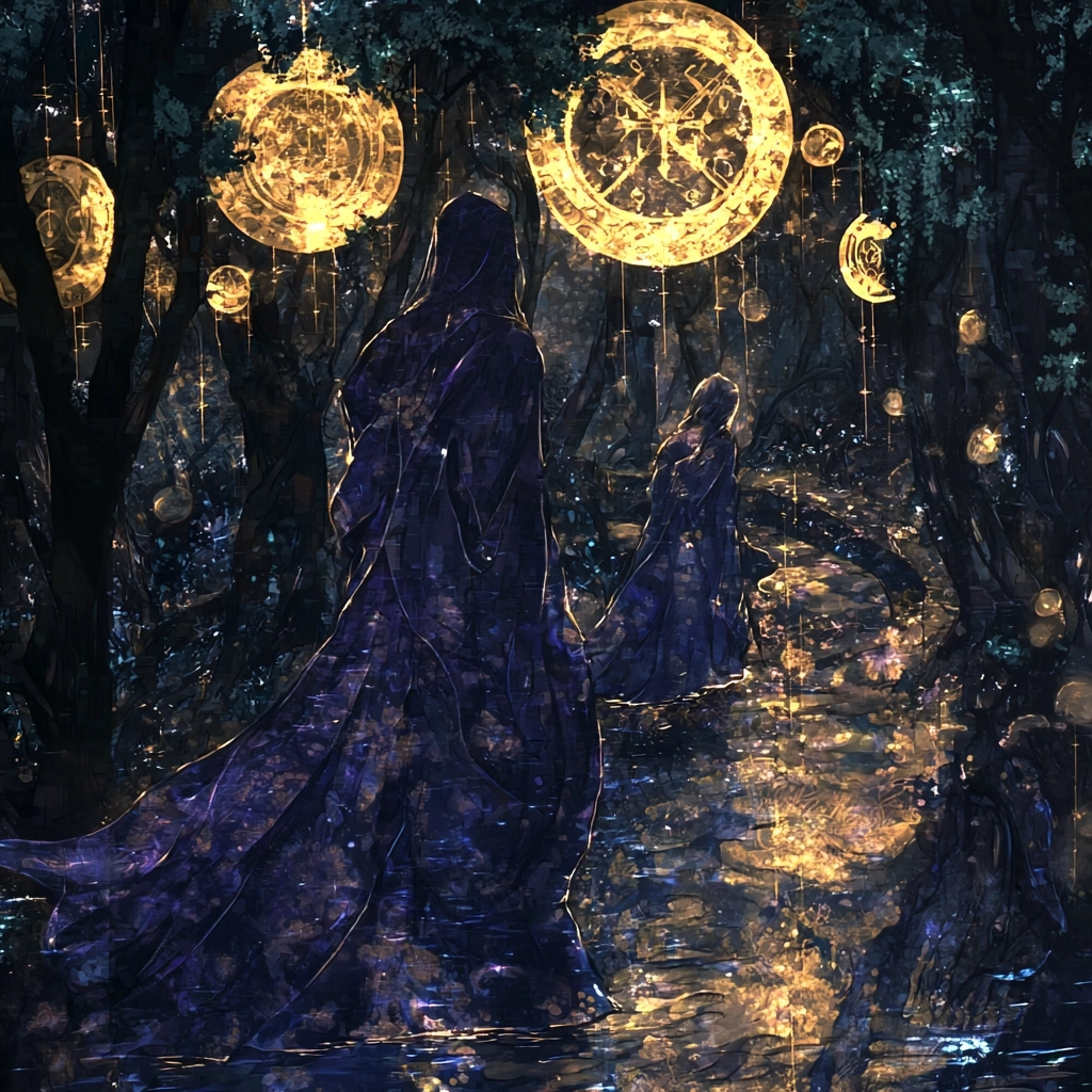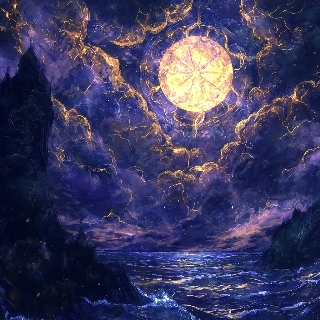 Vibrant contrasts with celestial lighting using rich indigo tones.