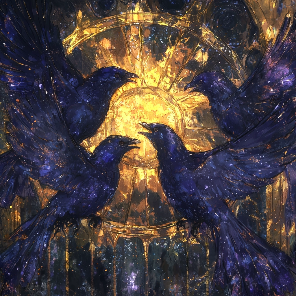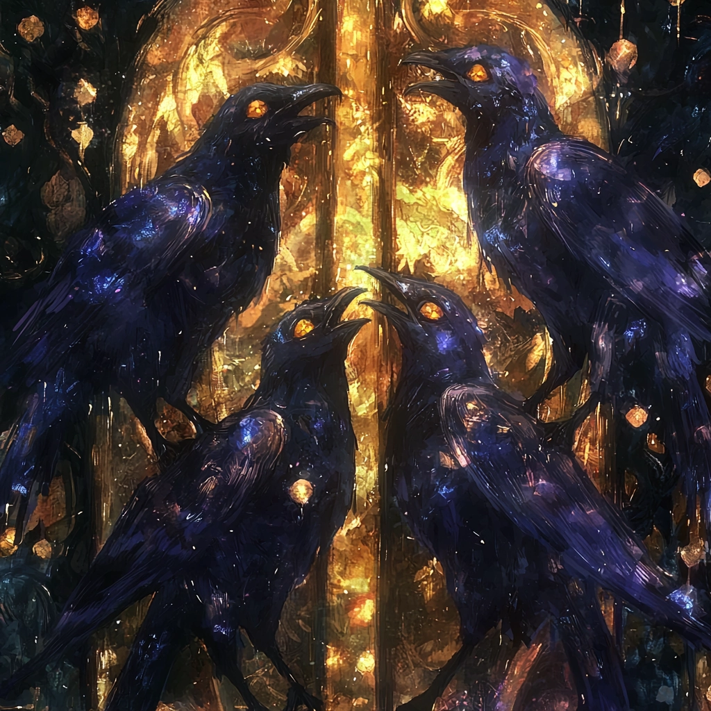 The use of contrasting light creates a dynamic illumination, highlighting details against a deep indigo backdrop. Gold accents add a sense of depth, with shimmering effects enhancing the scene's texture and spatial presence.