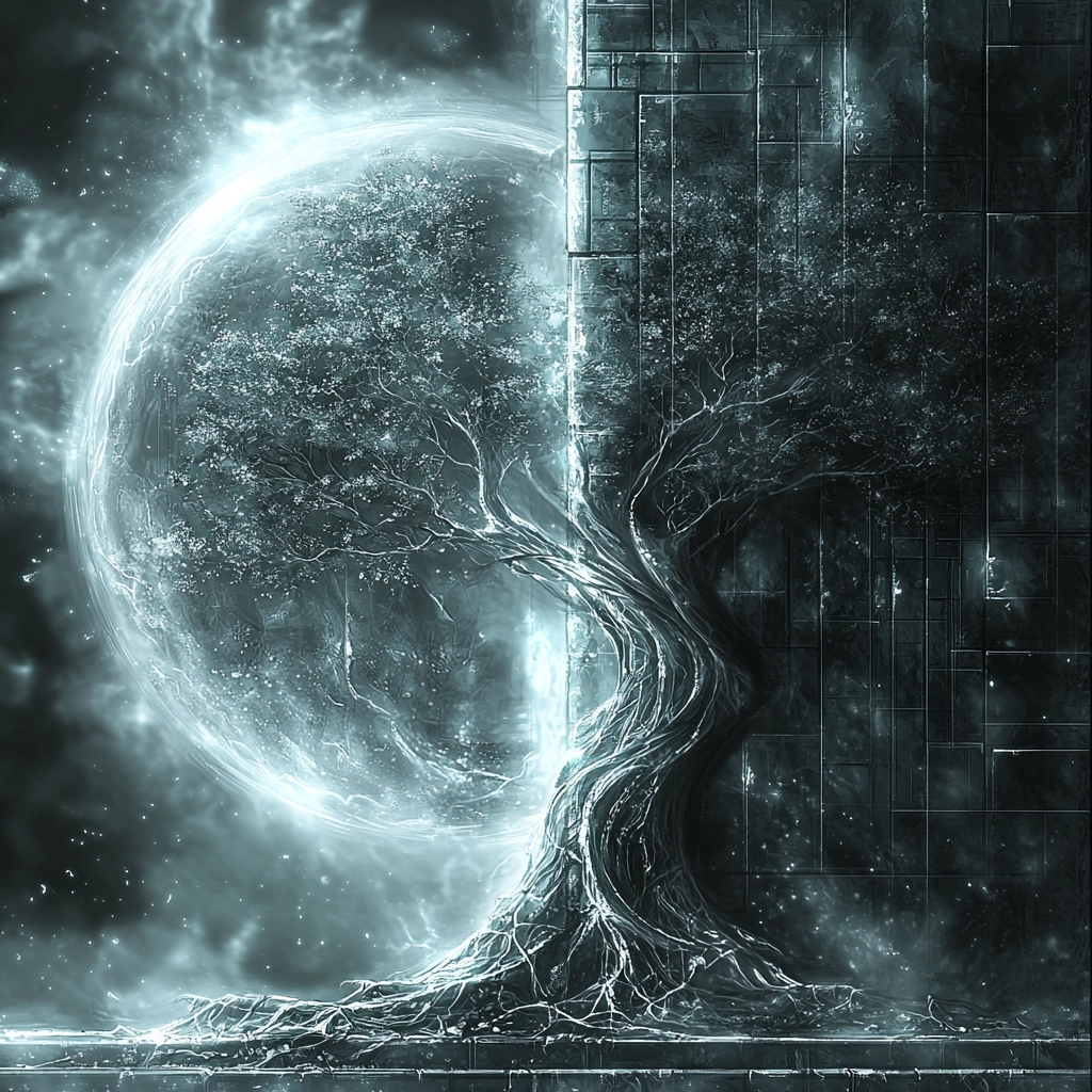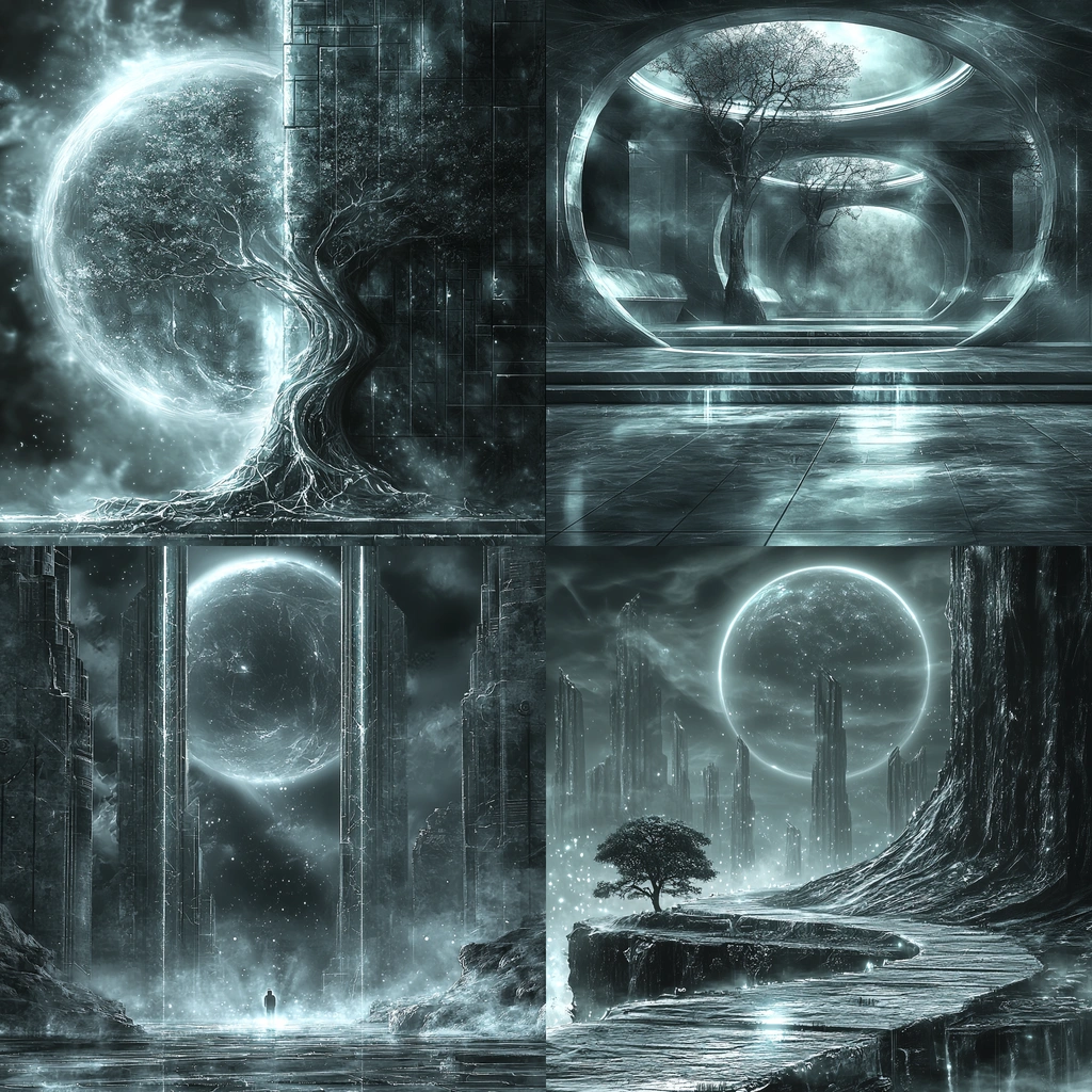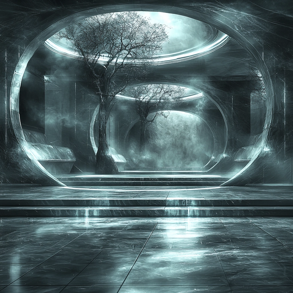 Soft lighting highlights reflective surfaces, creating depth and contrast against the textured environmental elements. Subtle gradients and crisp lines contribute to an expansive spatial impression.