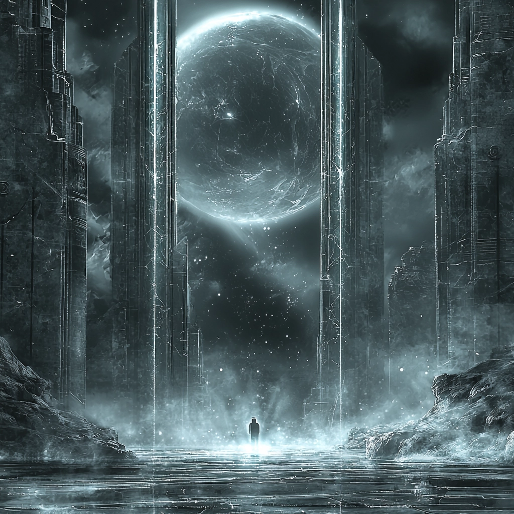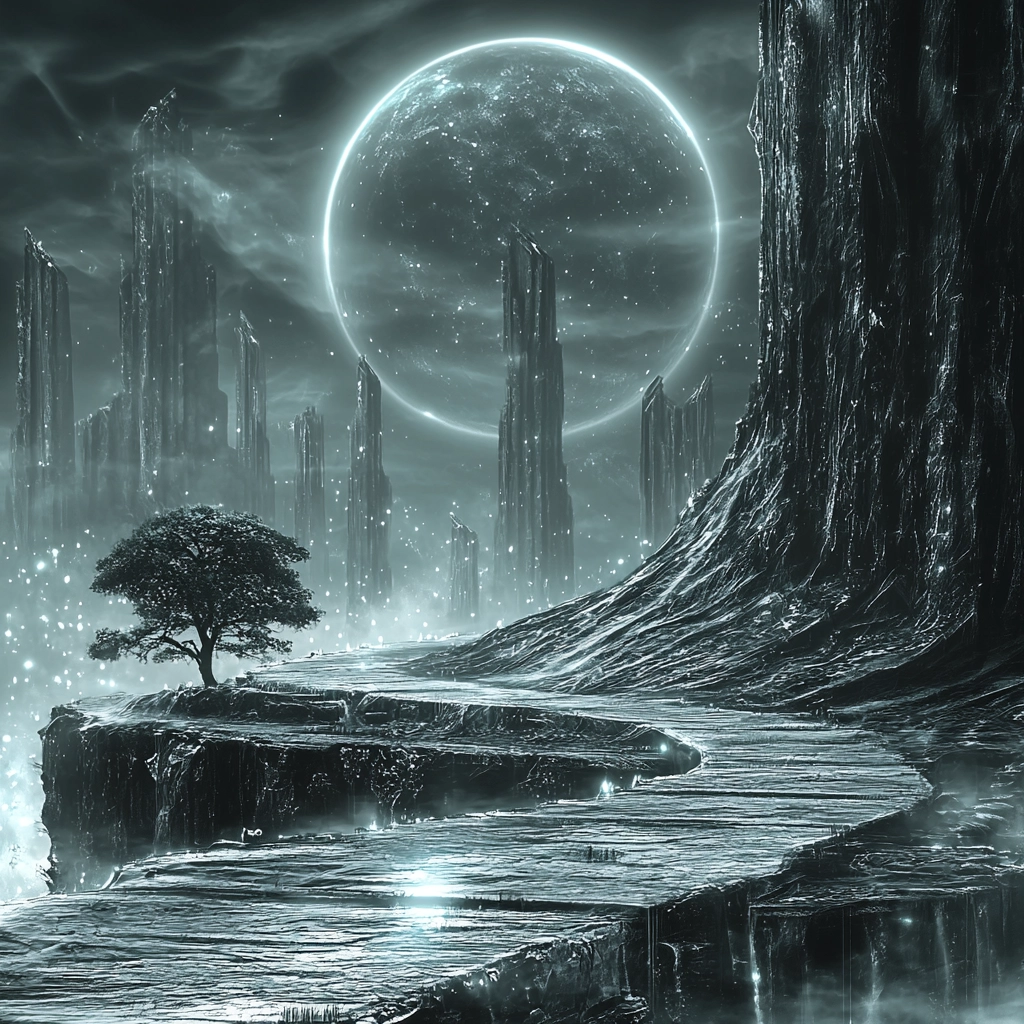 Grayscale tones enhance the luminous atmosphere.