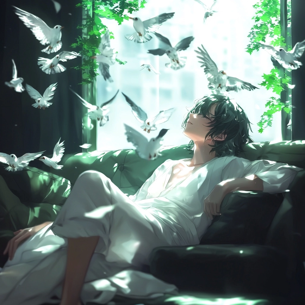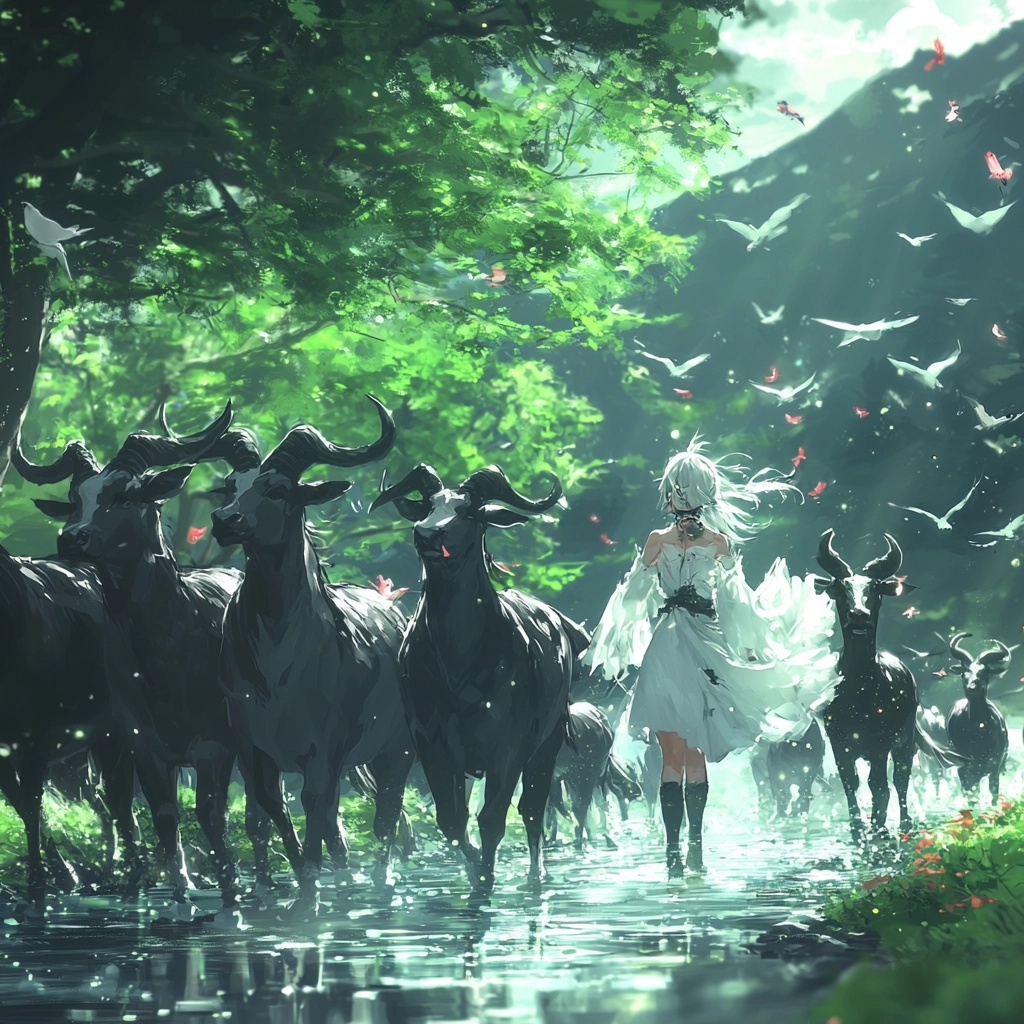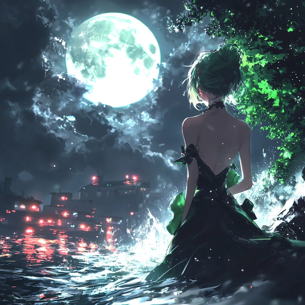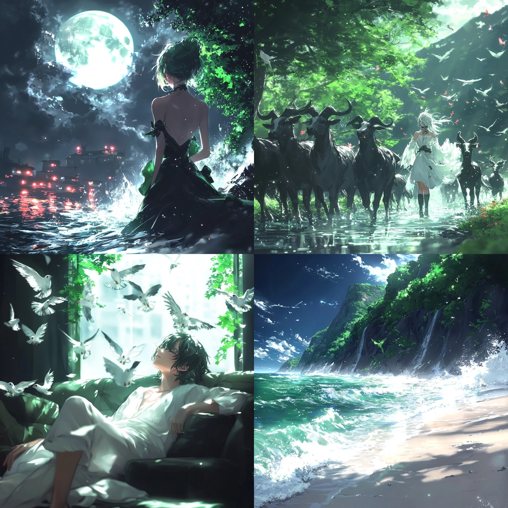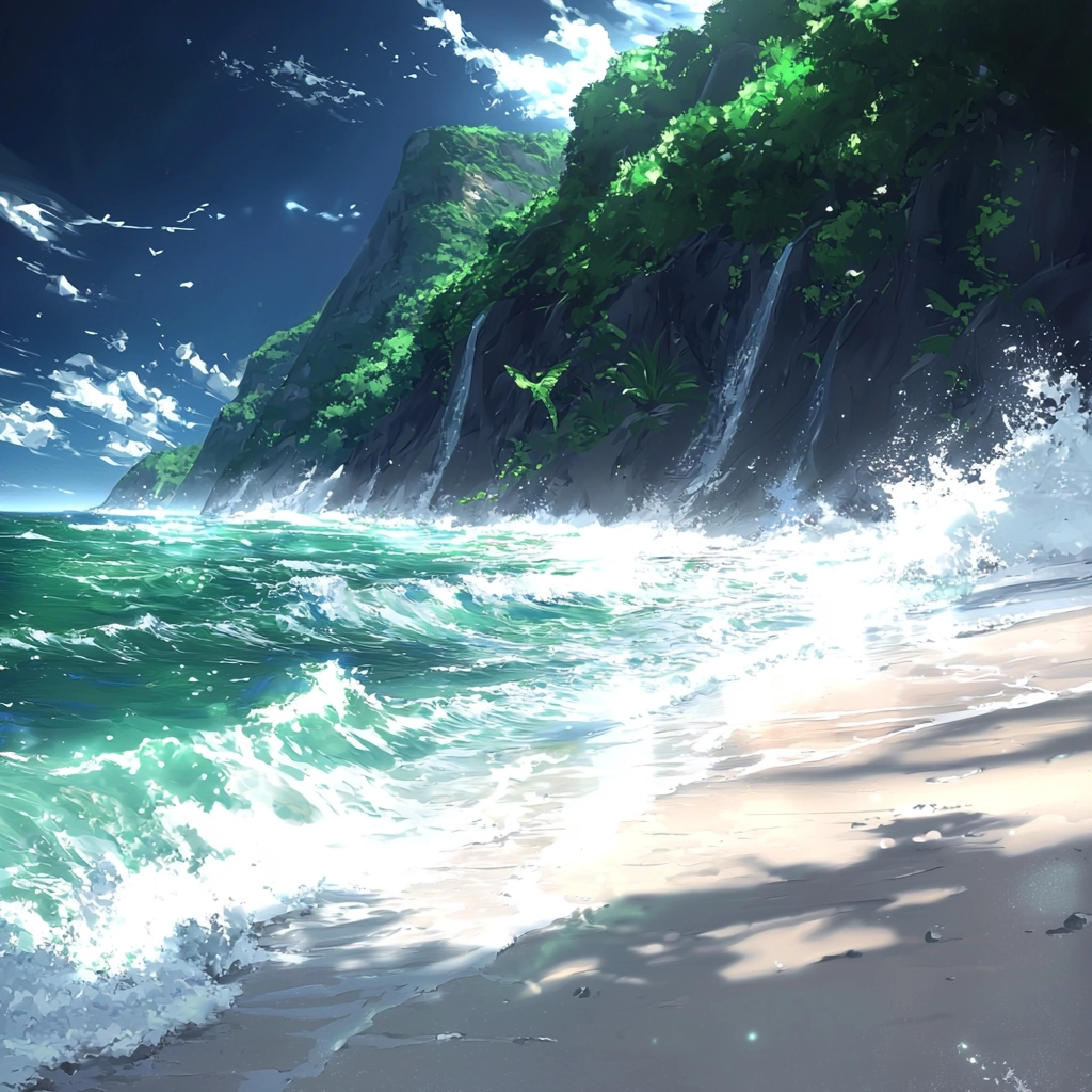 Dynamic lighting highlights both fluid transparency and the contrast between illuminated and shaded areas. Rich, natural greens and deep blues create a sense of depth, emphasized by the textured depiction of trees and waves. Detailed textures convey motion through rippling water and waving leaves.