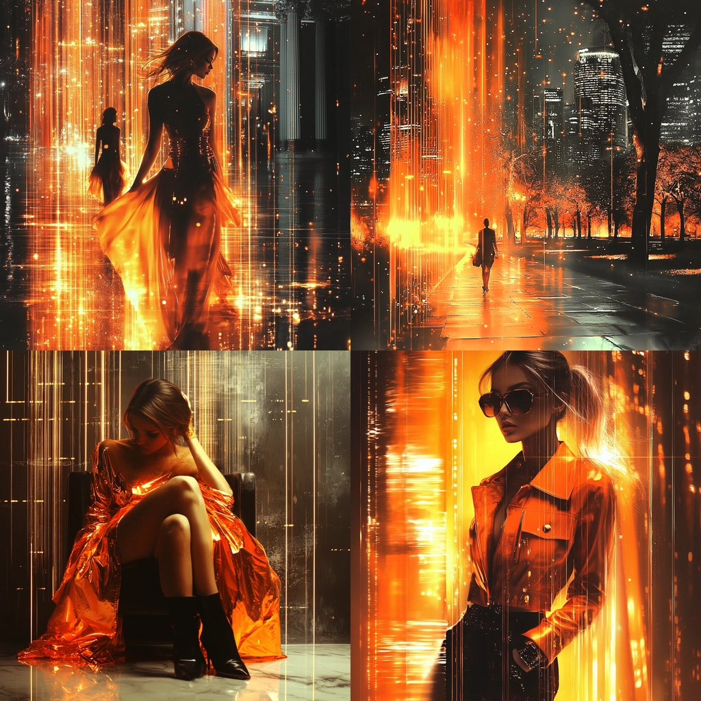 Strong contrasts between glowing orange hues and darker backgrounds create a dynamic and vibrant energy.